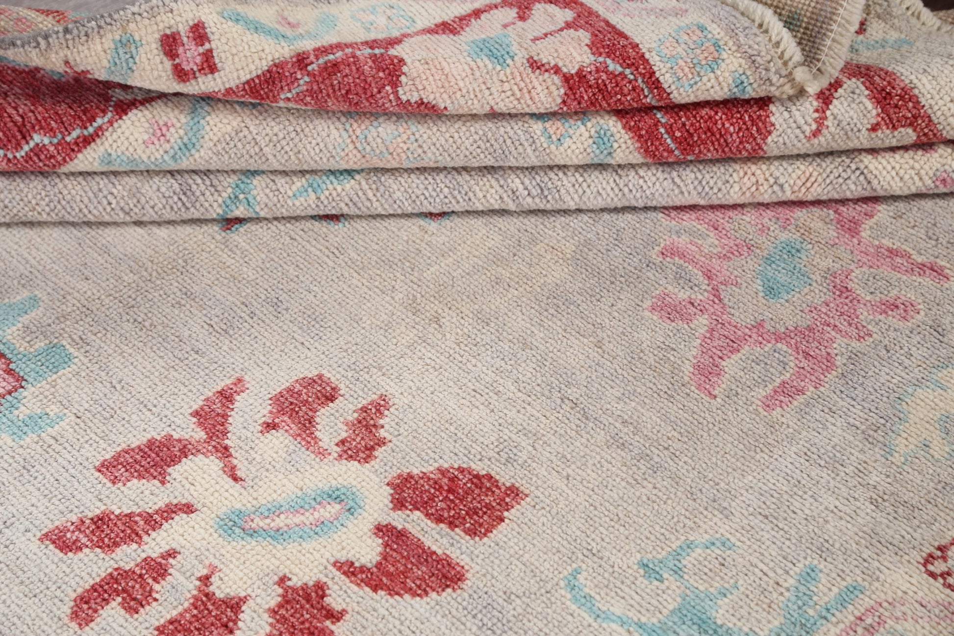 A Beautiful Genuine Turkey Oushak rug is Hand Knotted by skillful weavers in Turkey with 100% Wool Material. This rug is in New, First Quality condition. dimensions are 8' 7'' X 6' 0'' in foot and 262 X 183 in centimeter. the primary color is Greys & Charcoal.