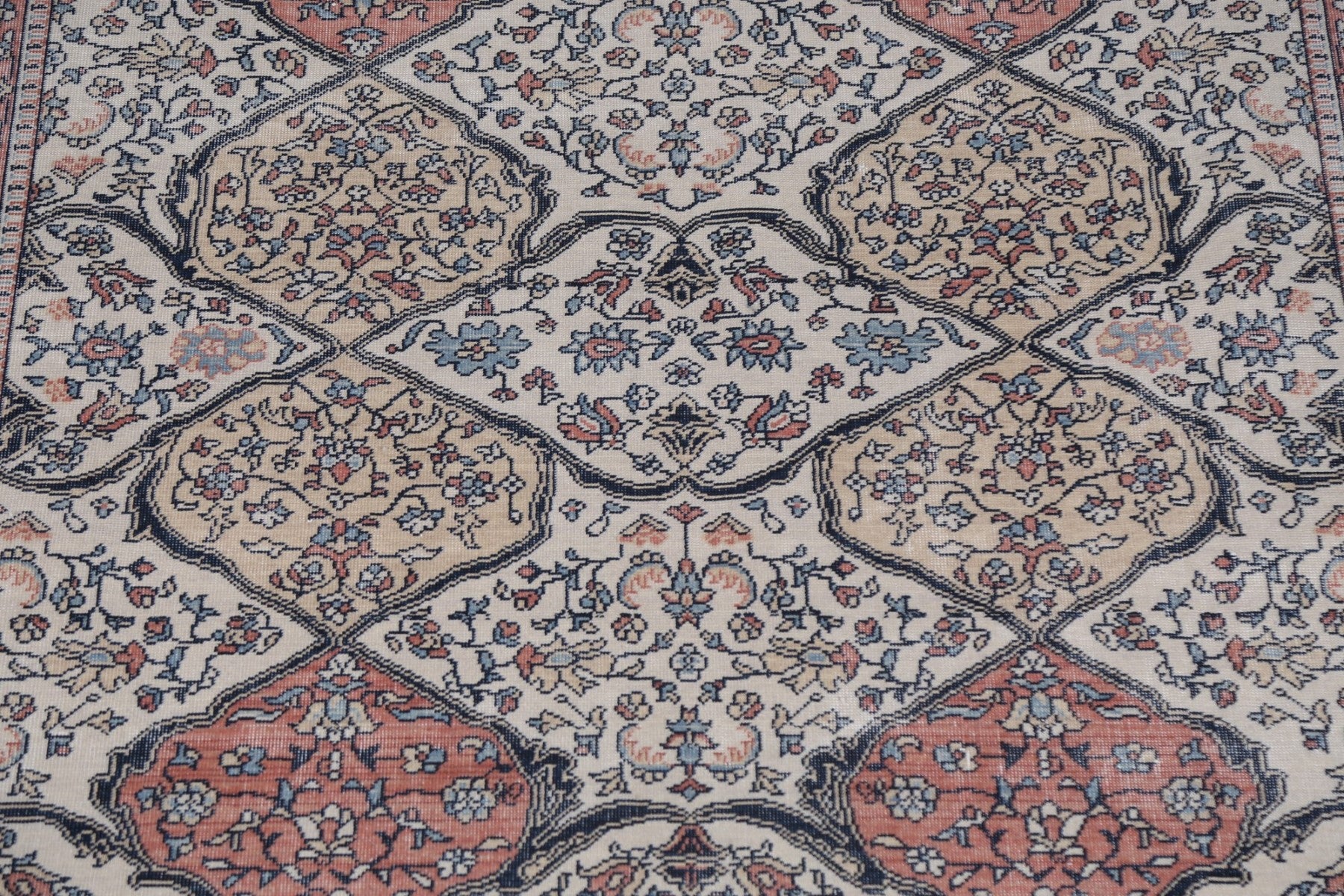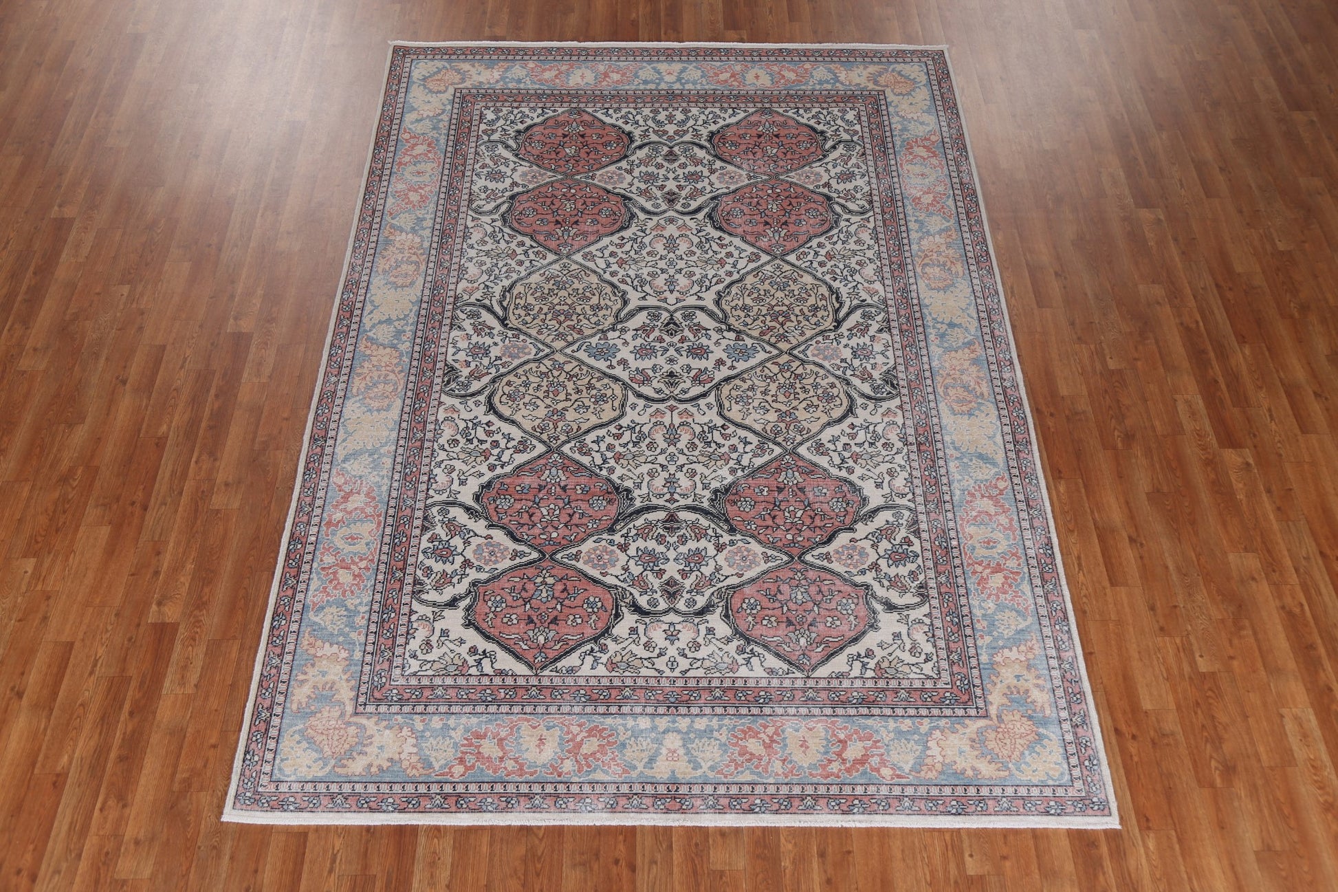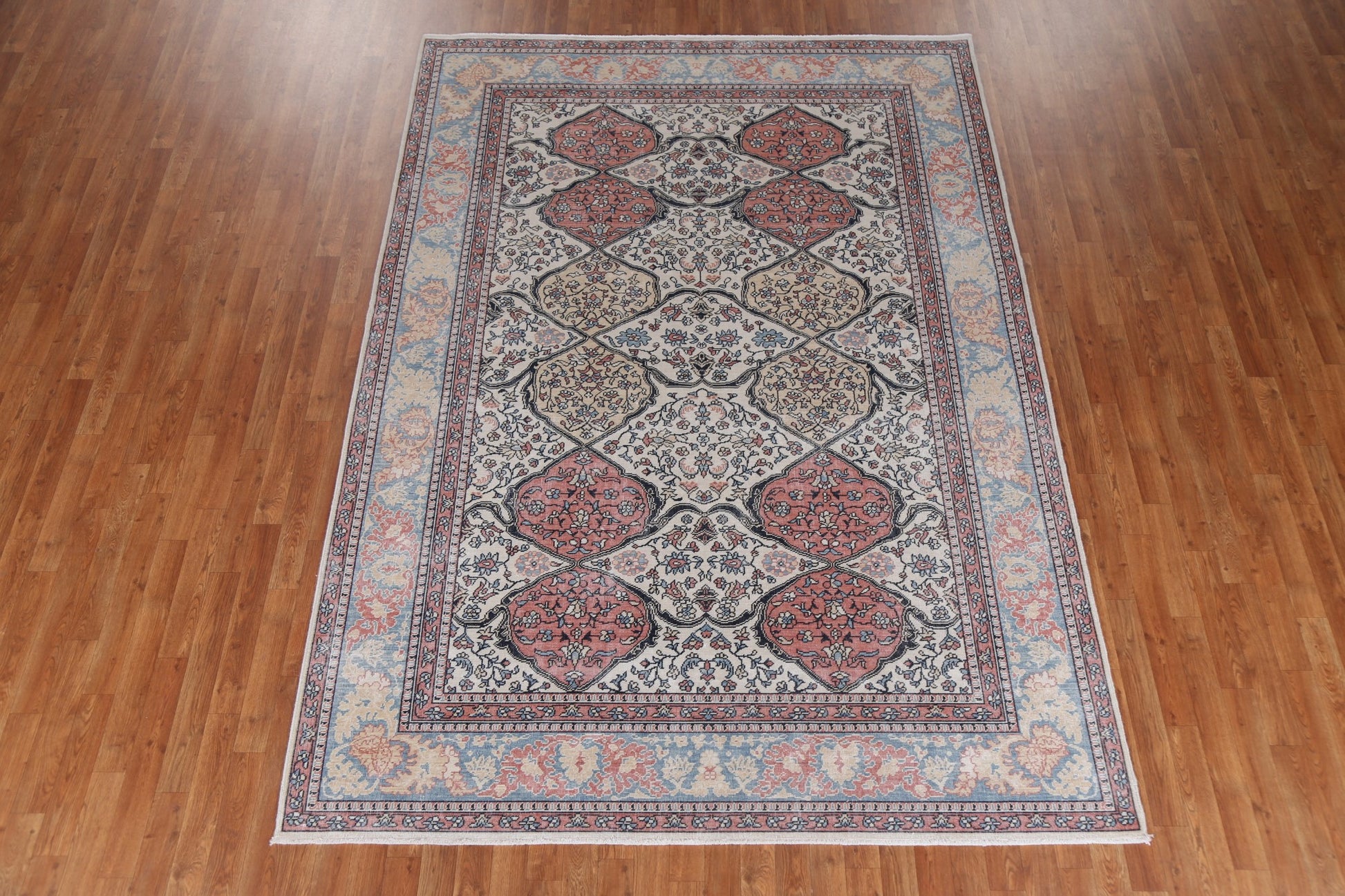 A Beautiful Genuine Turkey Bakhtiari rug is Hand Knotted by skillful weavers in Turkey with 100% Wool Material. This rug is in New, First Quality condition. dimensions are 9' 9'' X 7' 0'' in foot and 297 X 213 in centimeter. the primary color is Beige & Ivories.