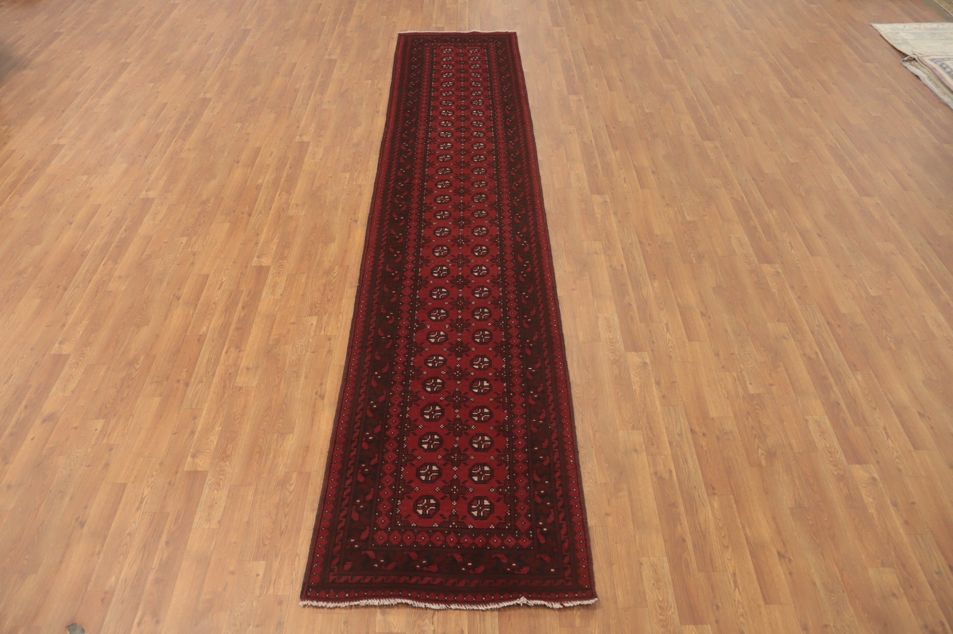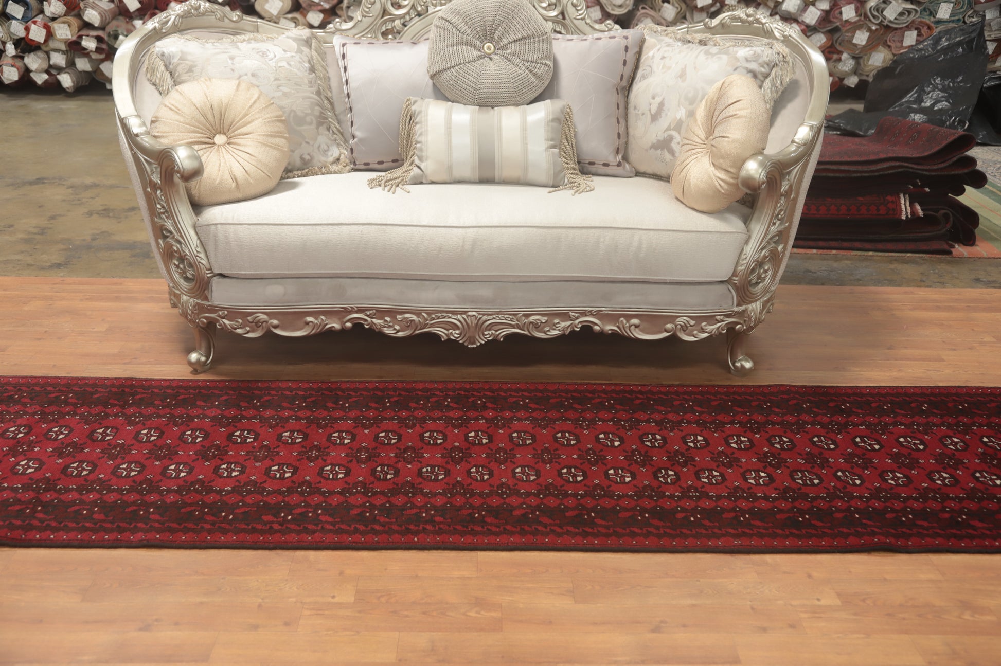 A Beautiful Genuine Afghanistan Balouch rug is Hand Knotted by skillful weavers in Afghanistan with 100% Wool Material. This rug is in New, First Quality condition. dimensions are 12' 6'' X 2' 8'' in foot and 381 X 81 in centimeter. the primary color is Red.