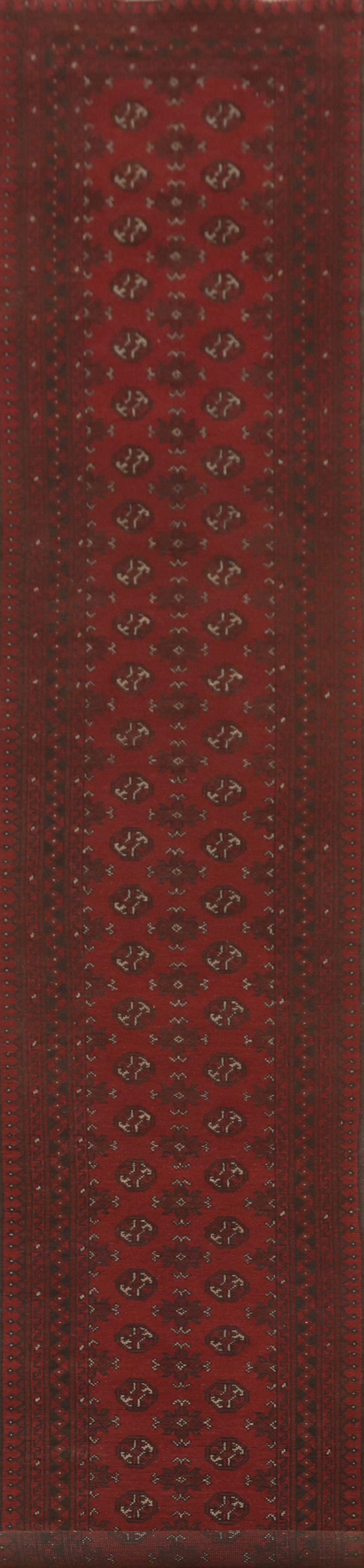 A Beautiful Genuine Afghanistan Balouch rug is Hand Knotted by skillful weavers in Afghanistan with 100% Wool Material. This rug is in New, First Quality condition. dimensions are 18' 11'' X 2' 8'' in foot and 577 X 81 in centimeter. the primary color is Red.