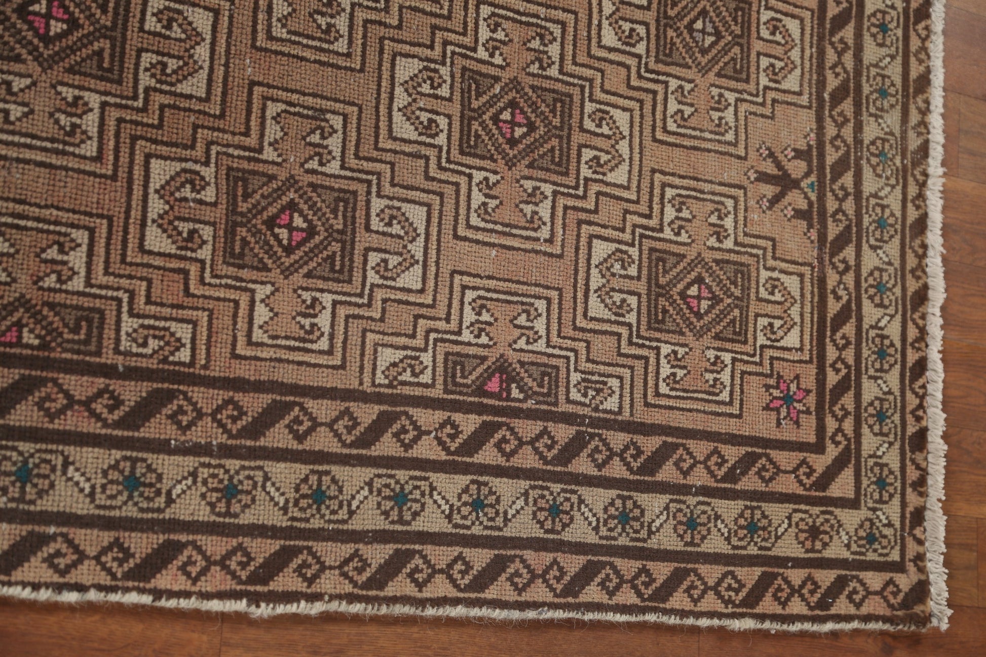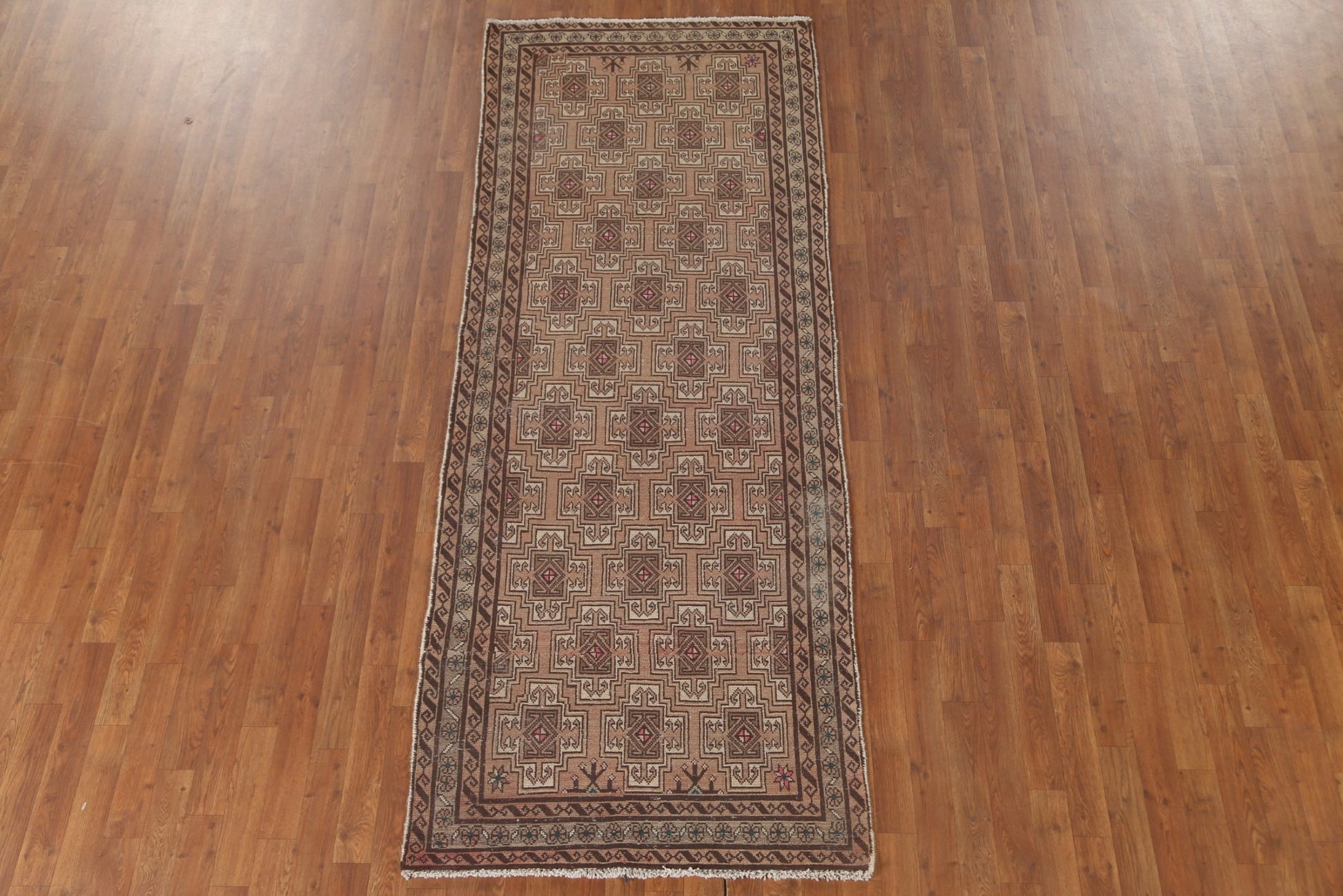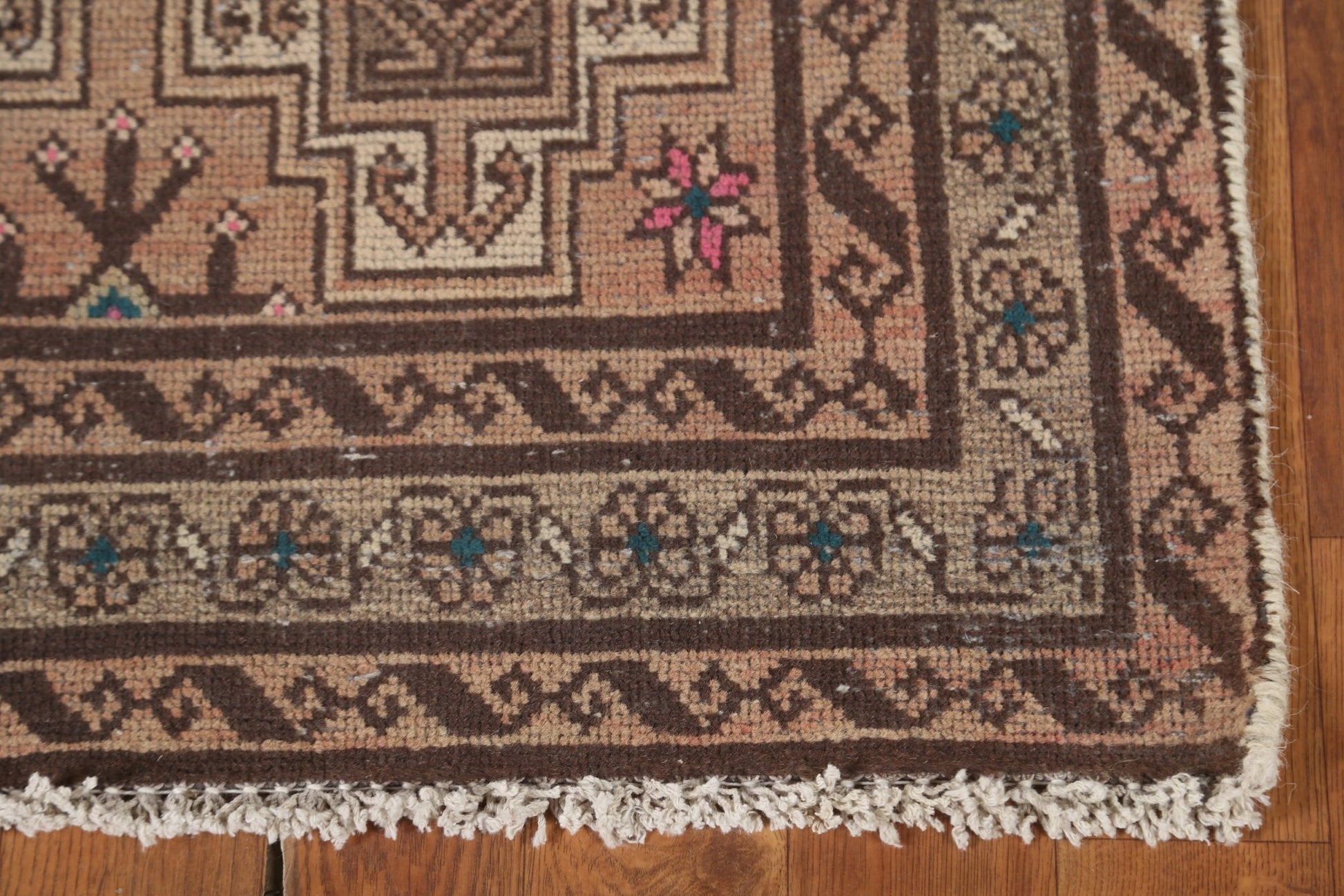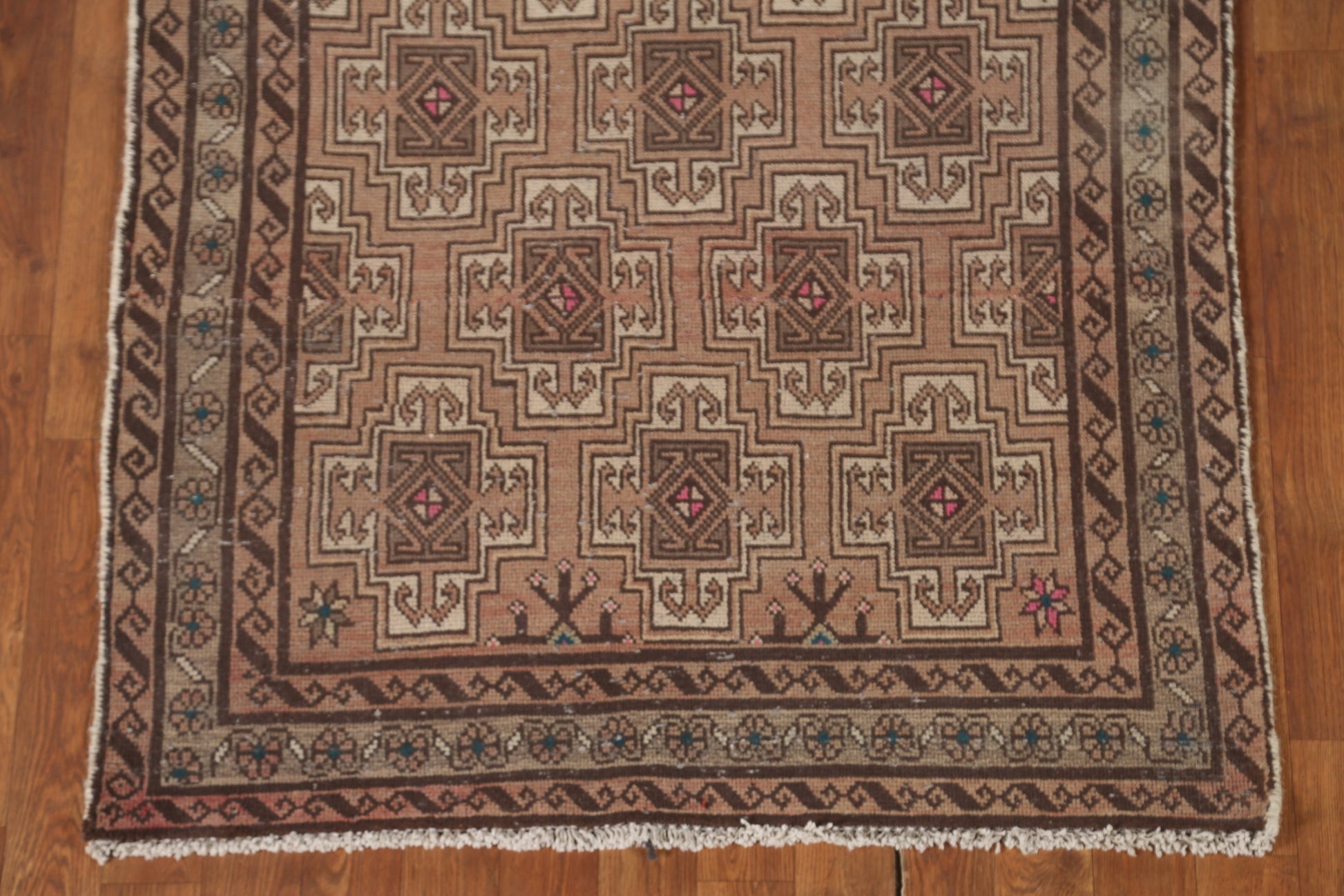 A Beautiful Genuine Persia ( Persia ) Balouch rug is Hand Knotted by skillful weavers in Persia ( Persia ) with 100% Wool Material. This rug is in Very Good (Evenly Low Pile-Repair) condition. dimensions are 8' 8'' X 3' 4'' in foot and 264 X 102 in centimeter. the primary color is Peach.