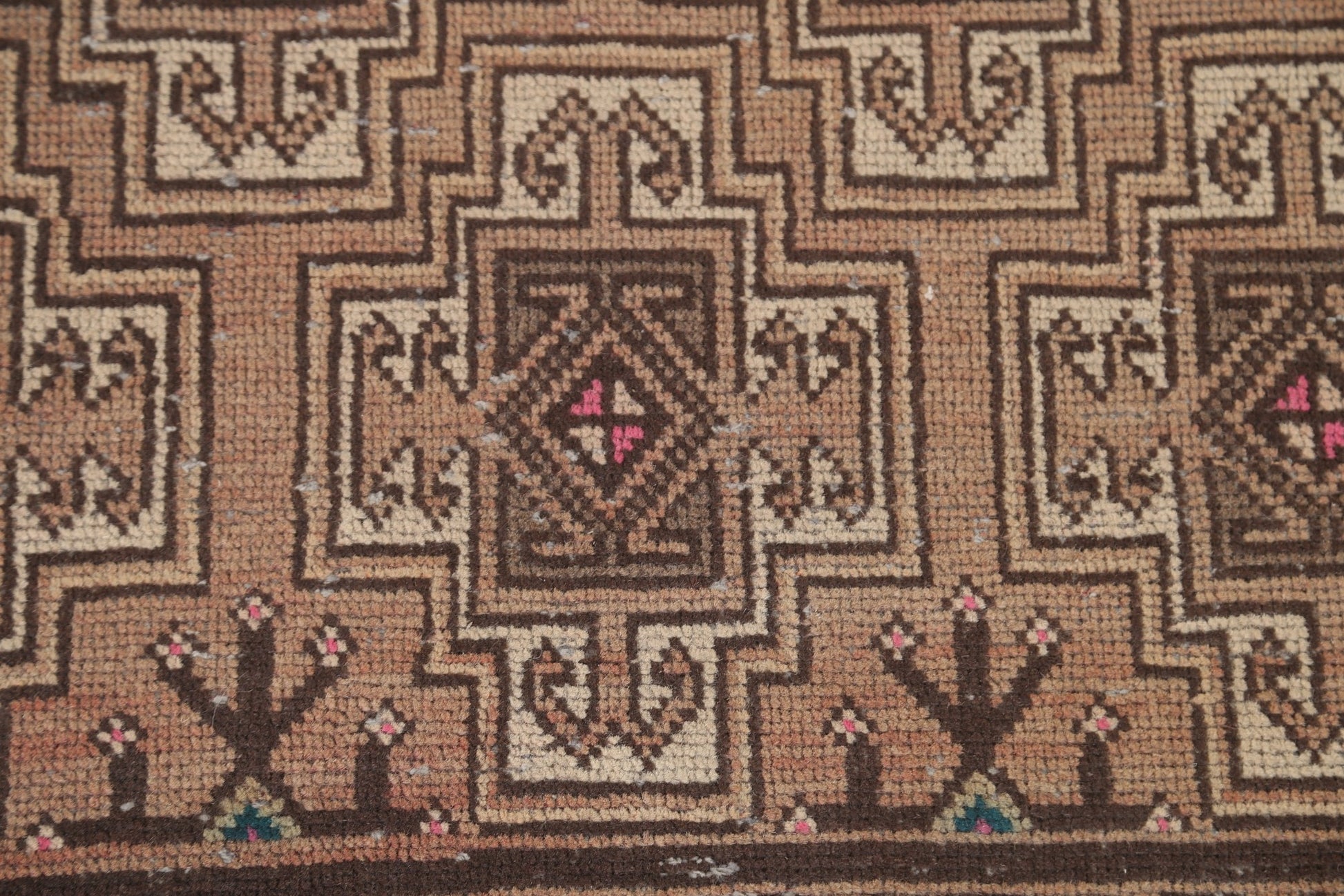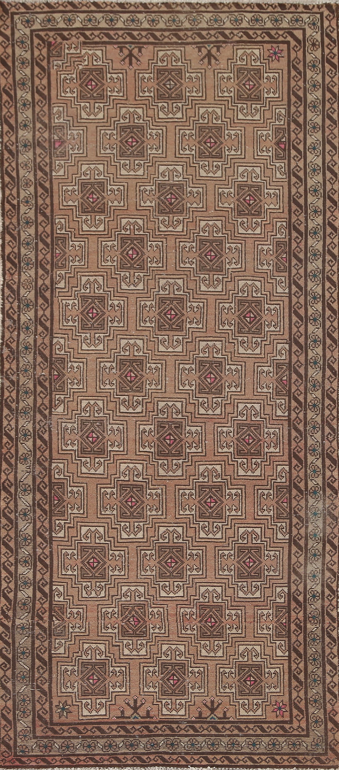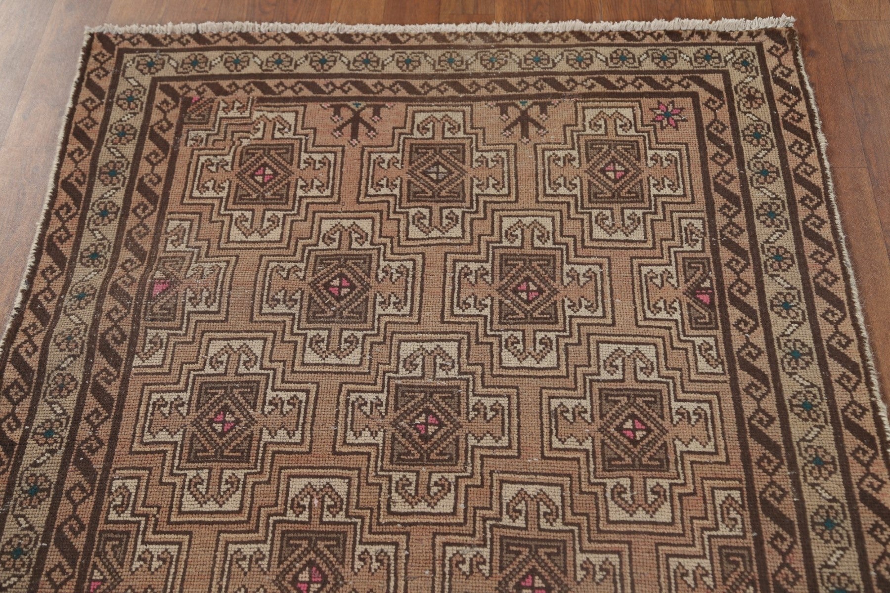 A Beautiful Genuine Persia ( Persia ) Balouch rug is Hand Knotted by skillful weavers in Persia ( Persia ) with 100% Wool Material. This rug is in Very Good (Evenly Low Pile-Repair) condition. dimensions are 8' 8'' X 3' 4'' in foot and 264 X 102 in centimeter. the primary color is Peach.