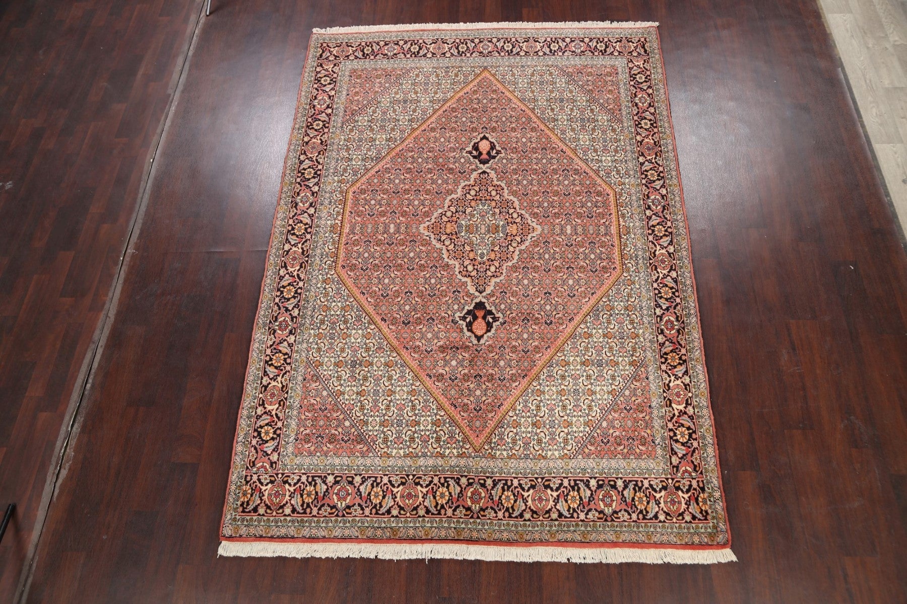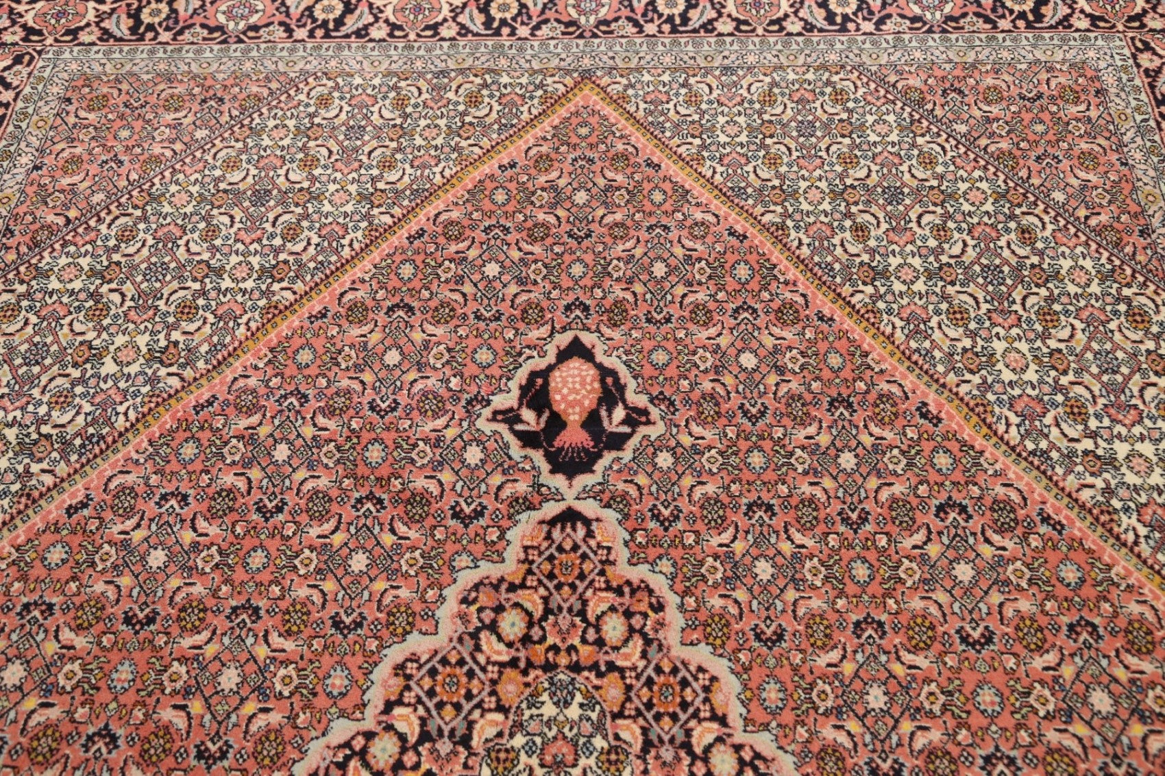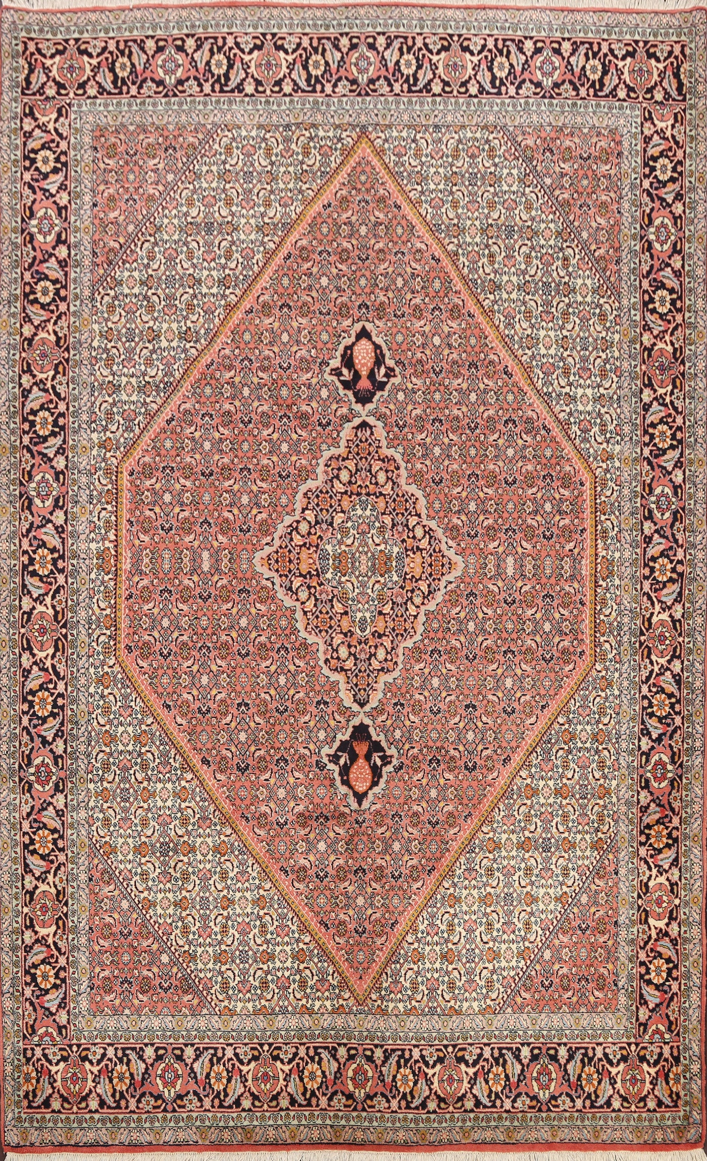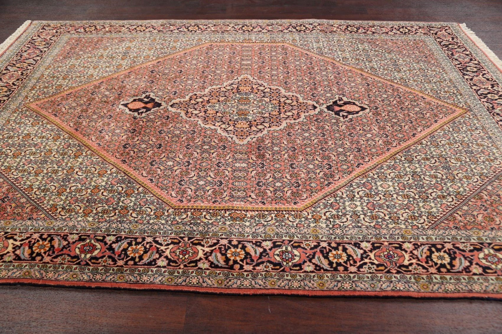 A Beautiful Genuine Persia ( Persia ) Bidjar rug is Hand Knotted by skillful weavers in Persia ( Persia ) with 100% Wool Material. This rug is in New, First Quality condition. dimensions are 9' 6'' X 6' 6'' in foot and 290 X 198 in centimeter. the primary color is Pink.