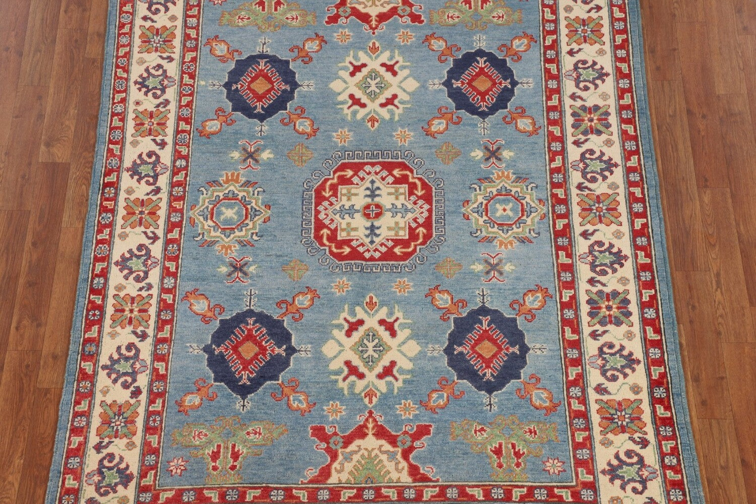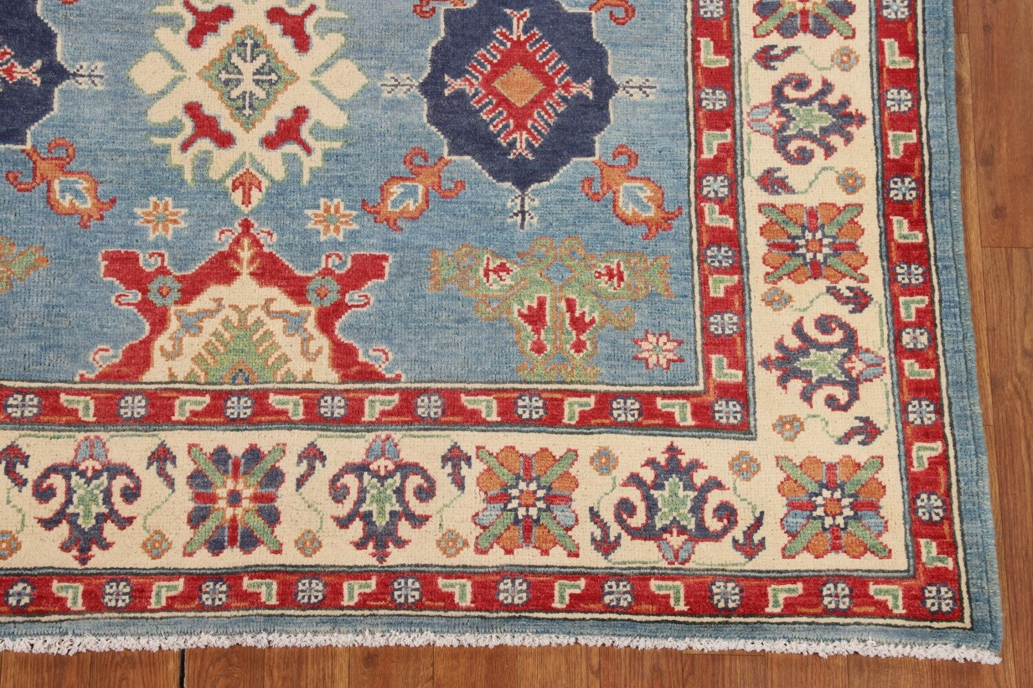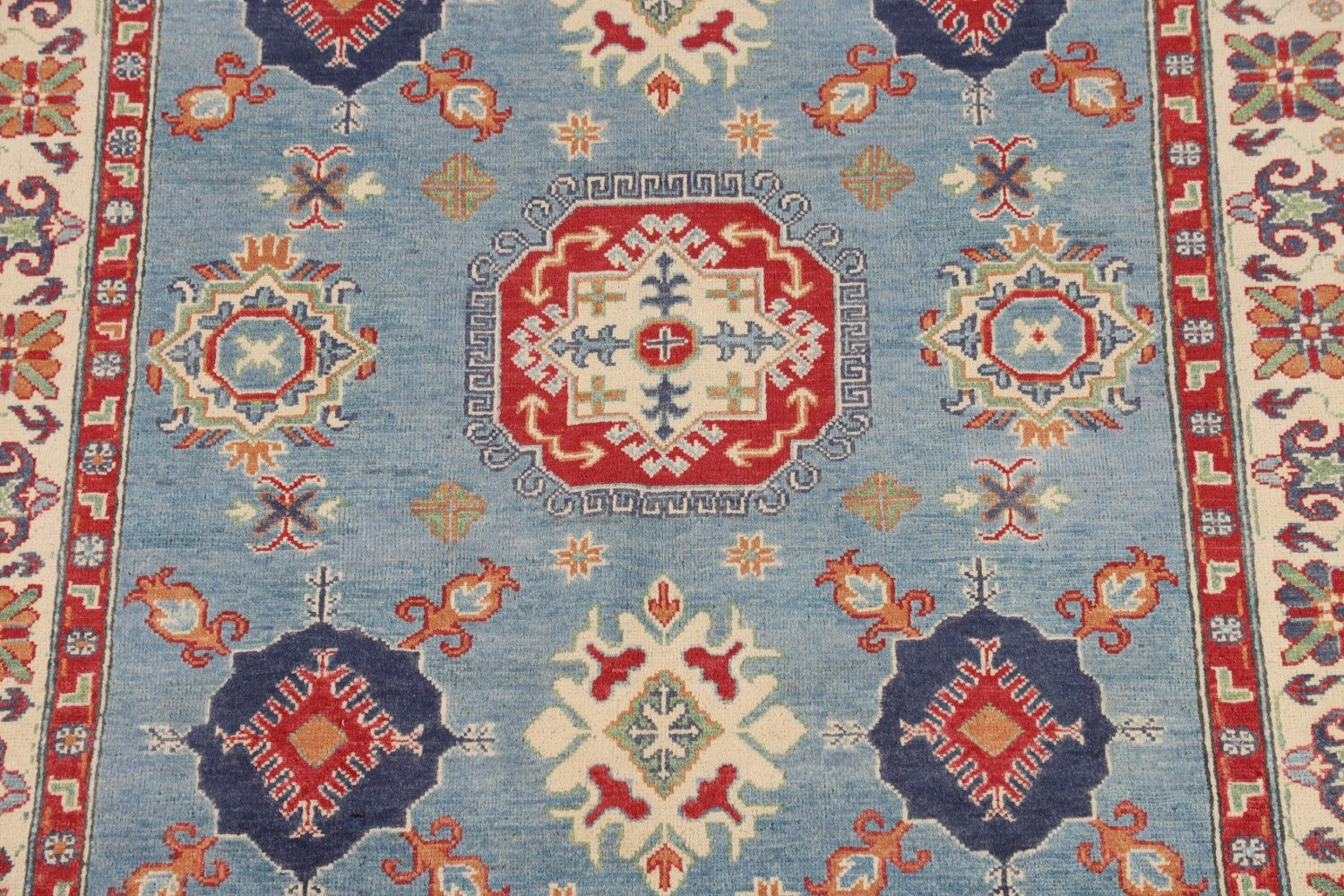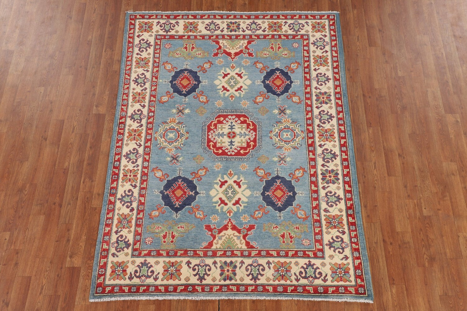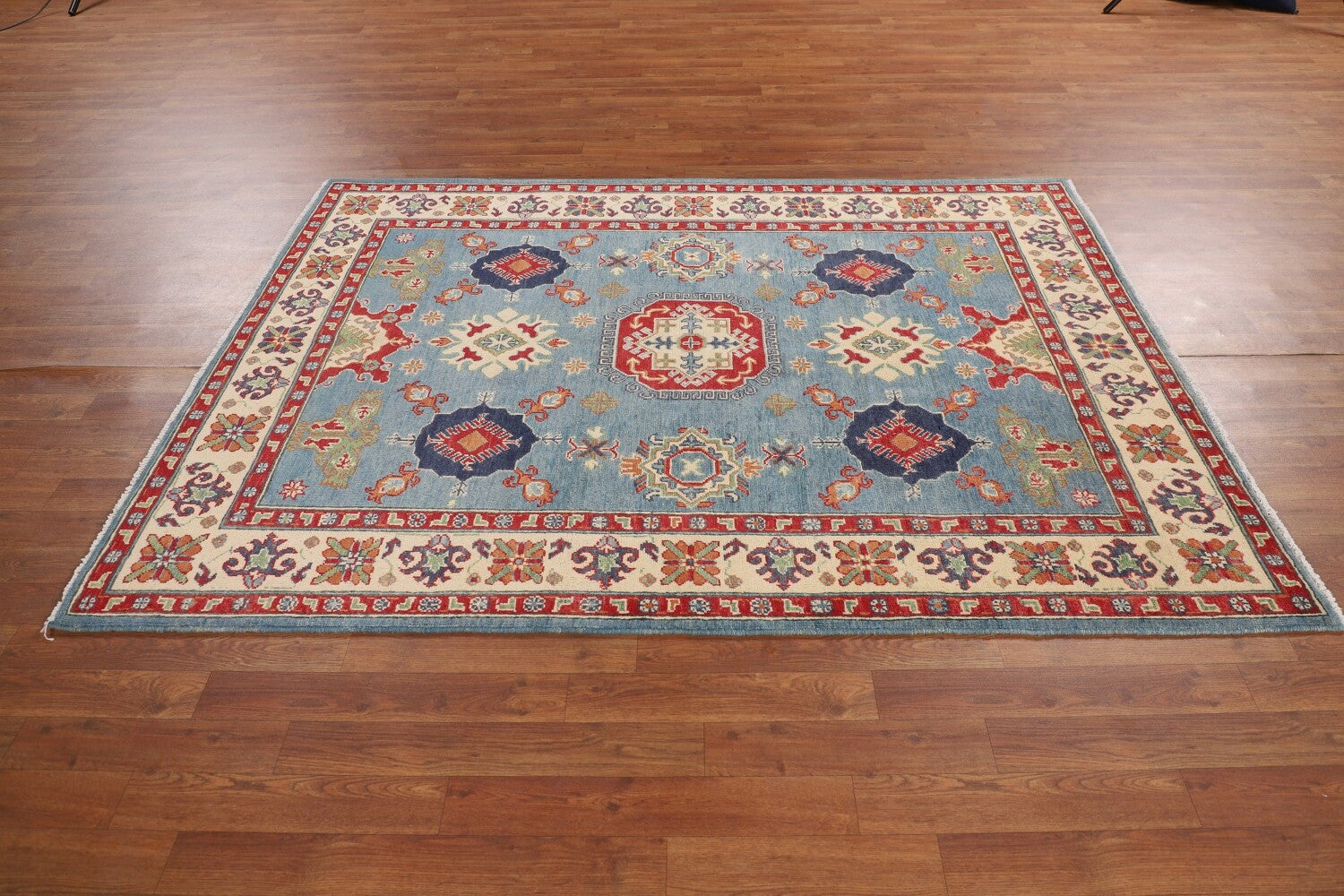 A Beautiful Genuine Pakistan Kazak rug is Hand Knotted by skillful weavers in Pakistan with 100% Wool Material. This rug is in New, First Quality condition. dimensions are 6' 9'' X 4' 11'' in foot and 206 X 150 in centimeter. the primary color is Navy Blue & Blues.