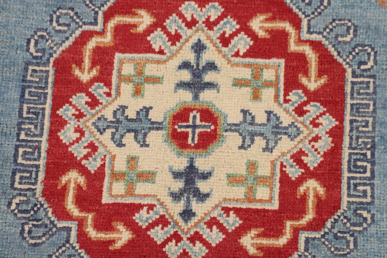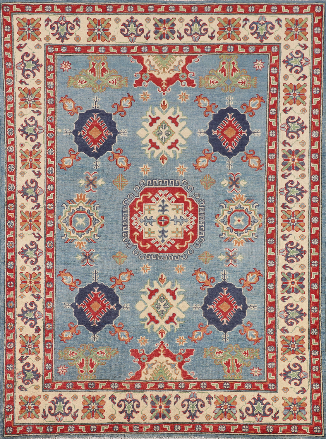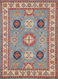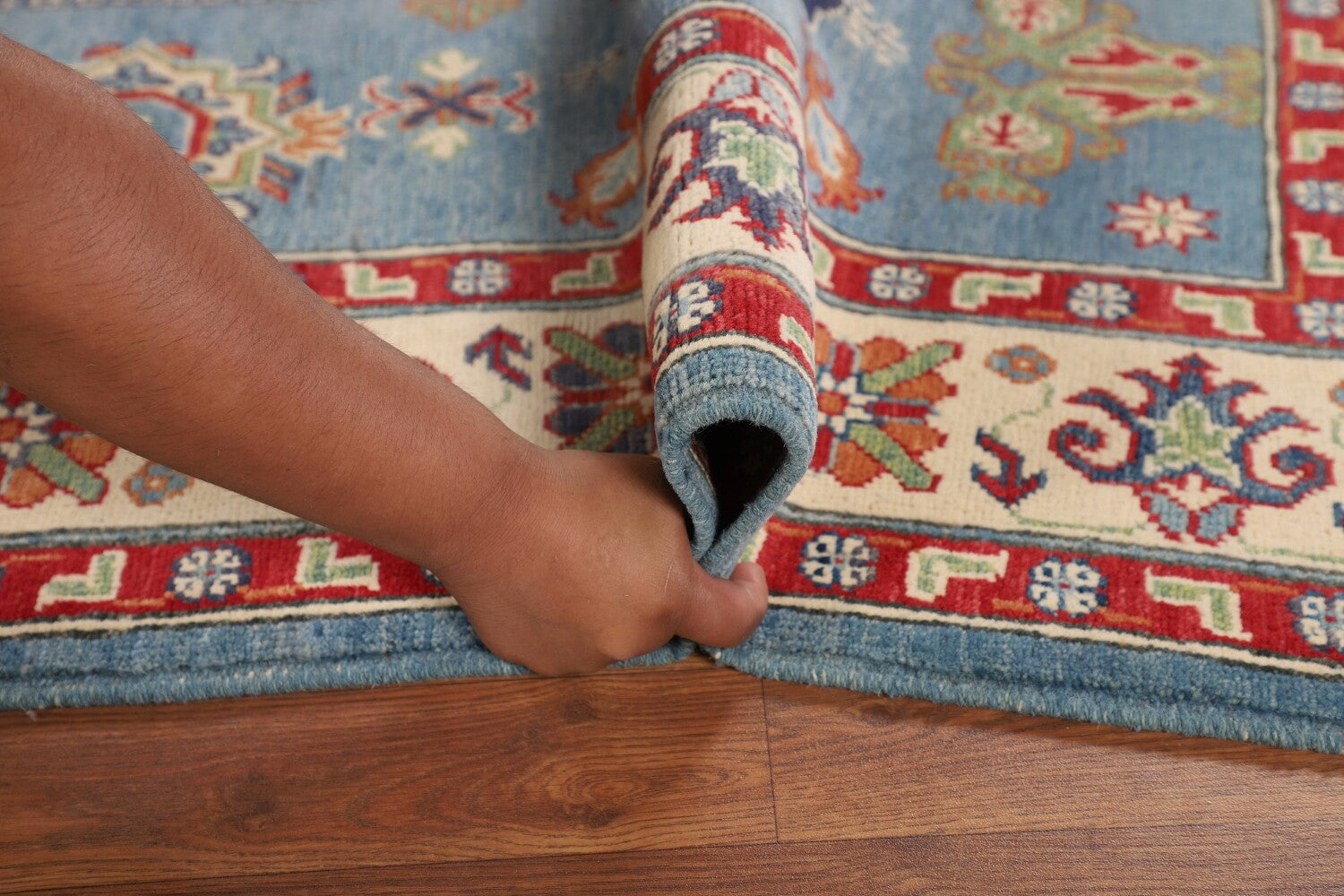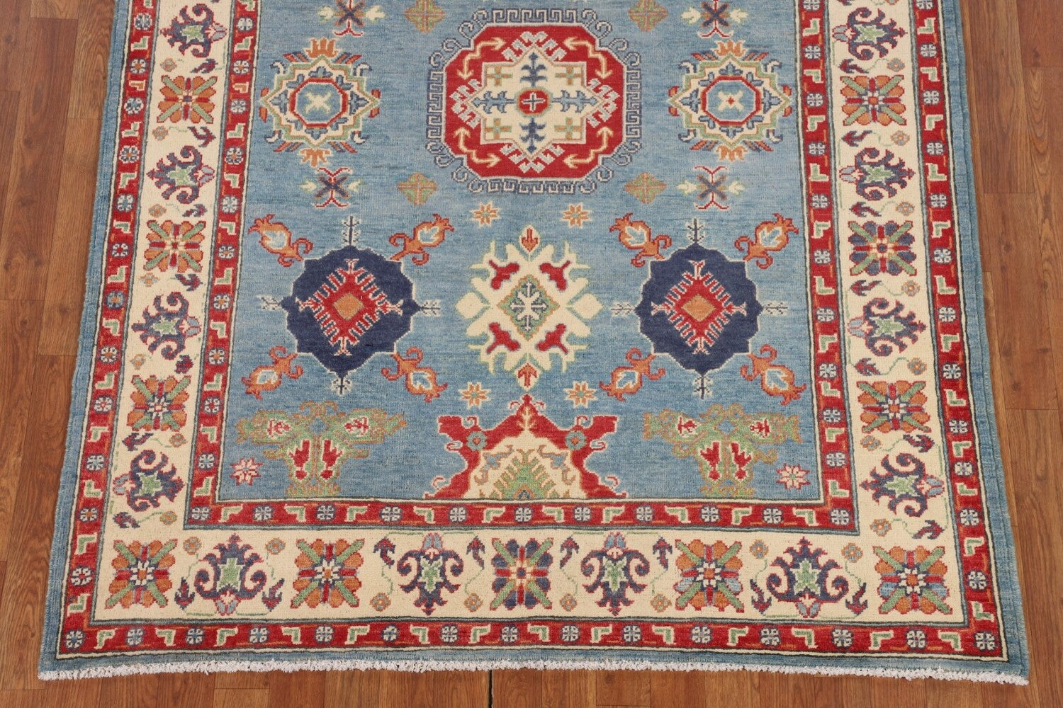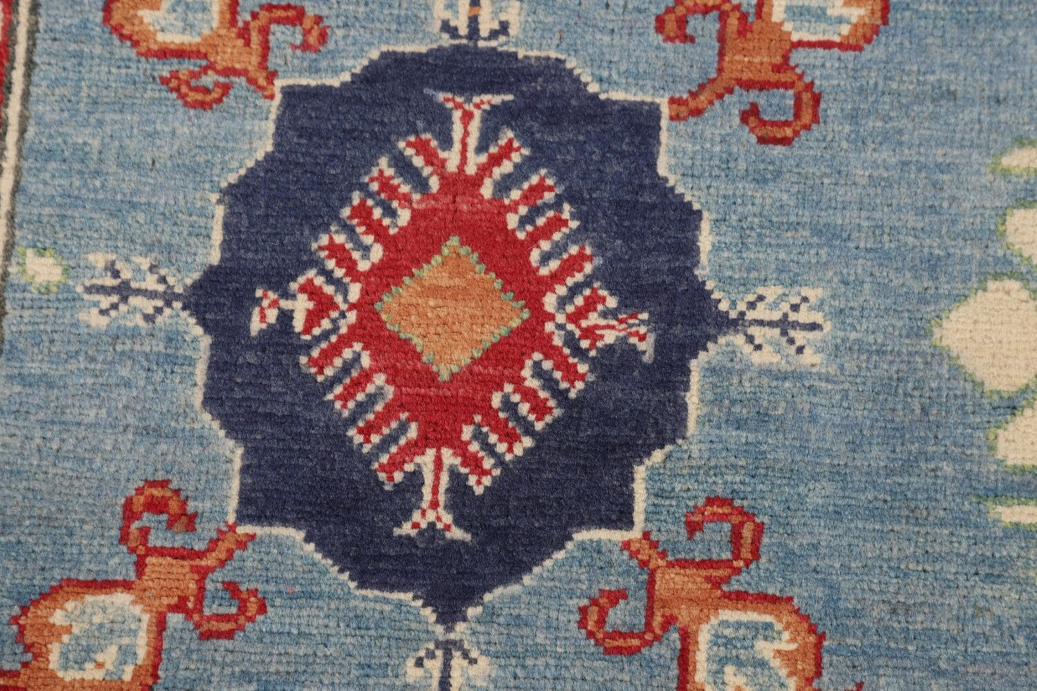 A Beautiful Genuine Pakistan Kazak rug is Hand Knotted by skillful weavers in Pakistan with 100% Wool Material. This rug is in New, First Quality condition. dimensions are 6' 9'' X 4' 11'' in foot and 206 X 150 in centimeter. the primary color is Navy Blue & Blues.