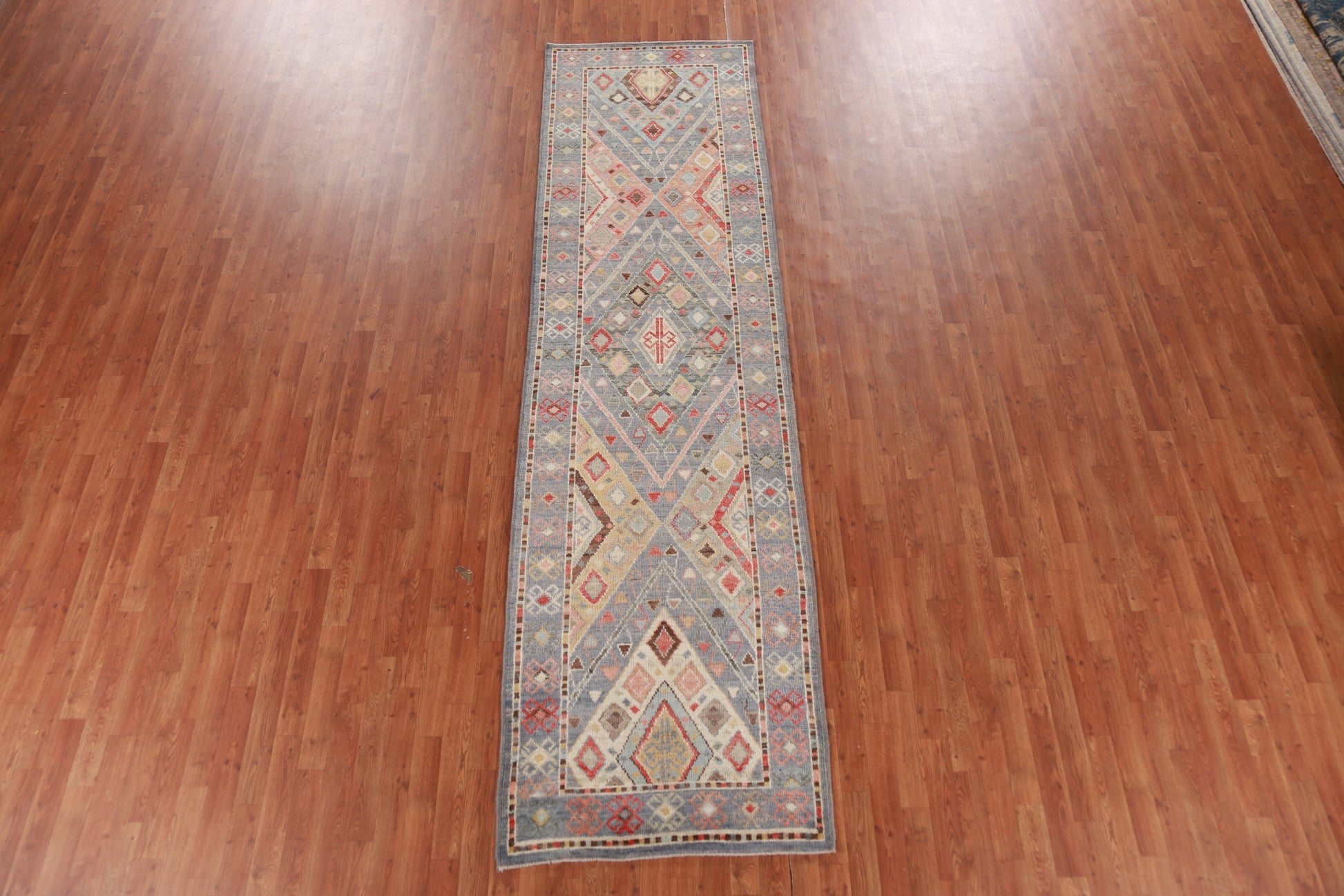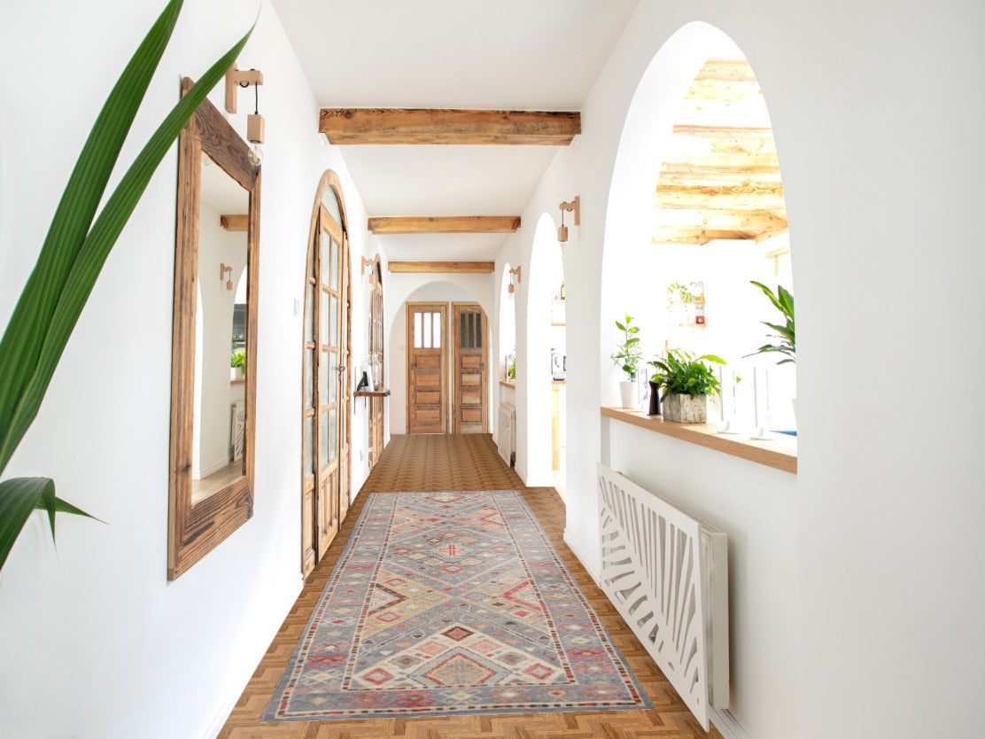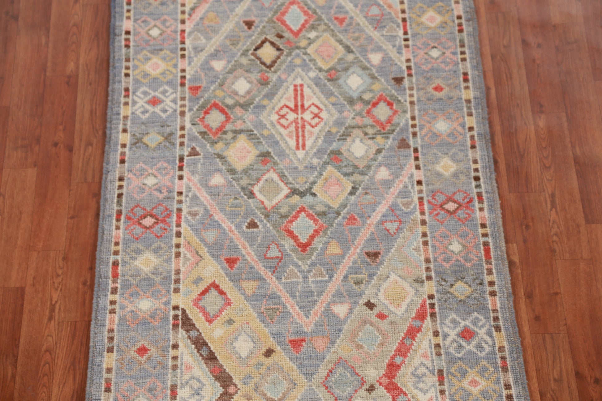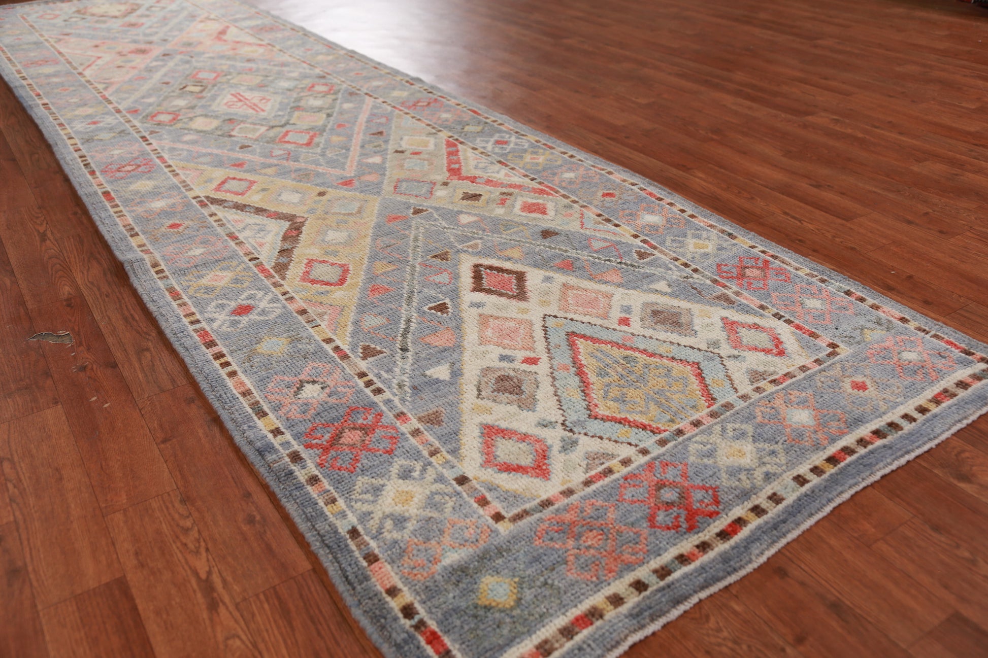 Geometric Blue Oushak Vegetable Dye Runner Rug 3x12