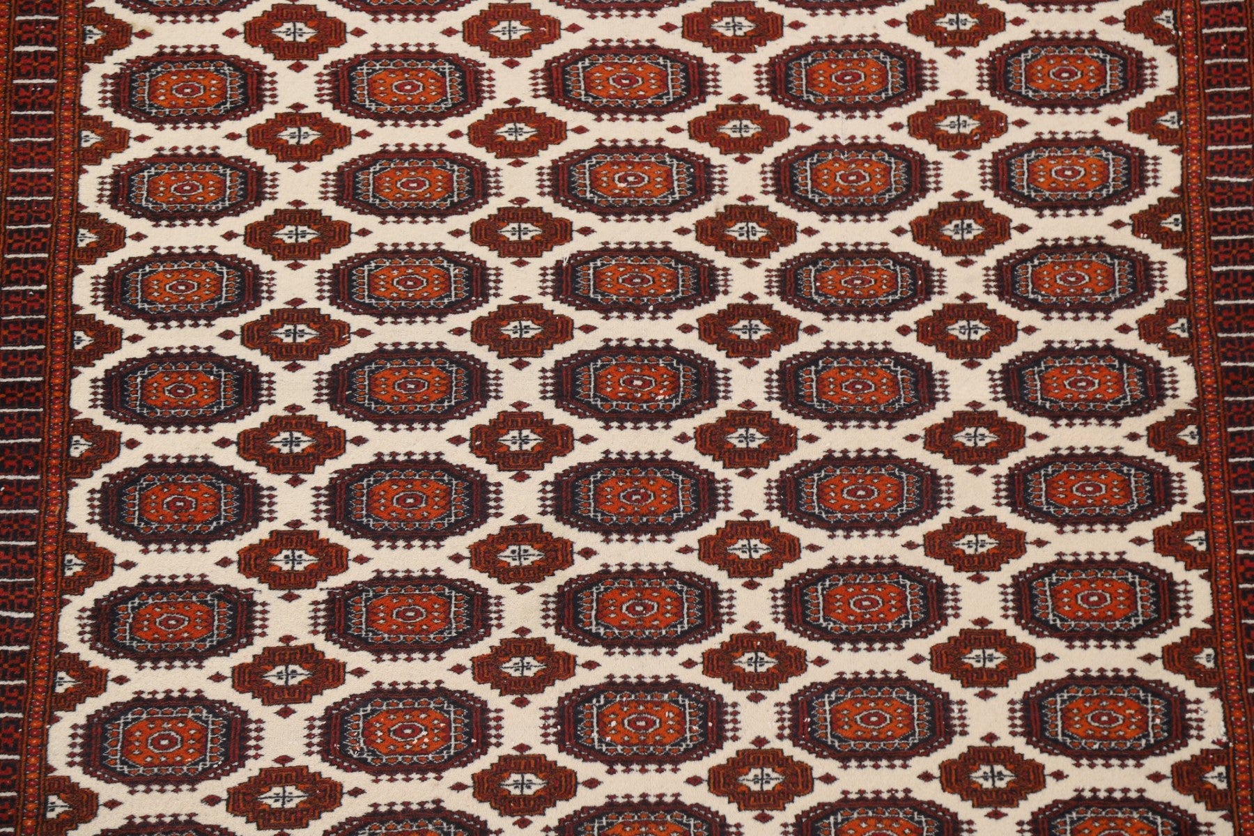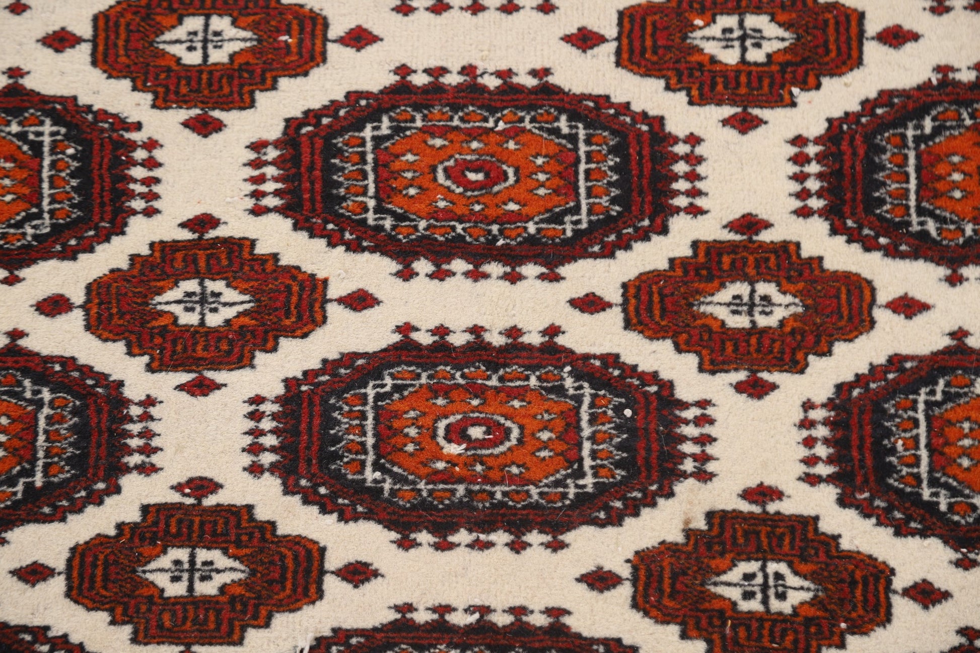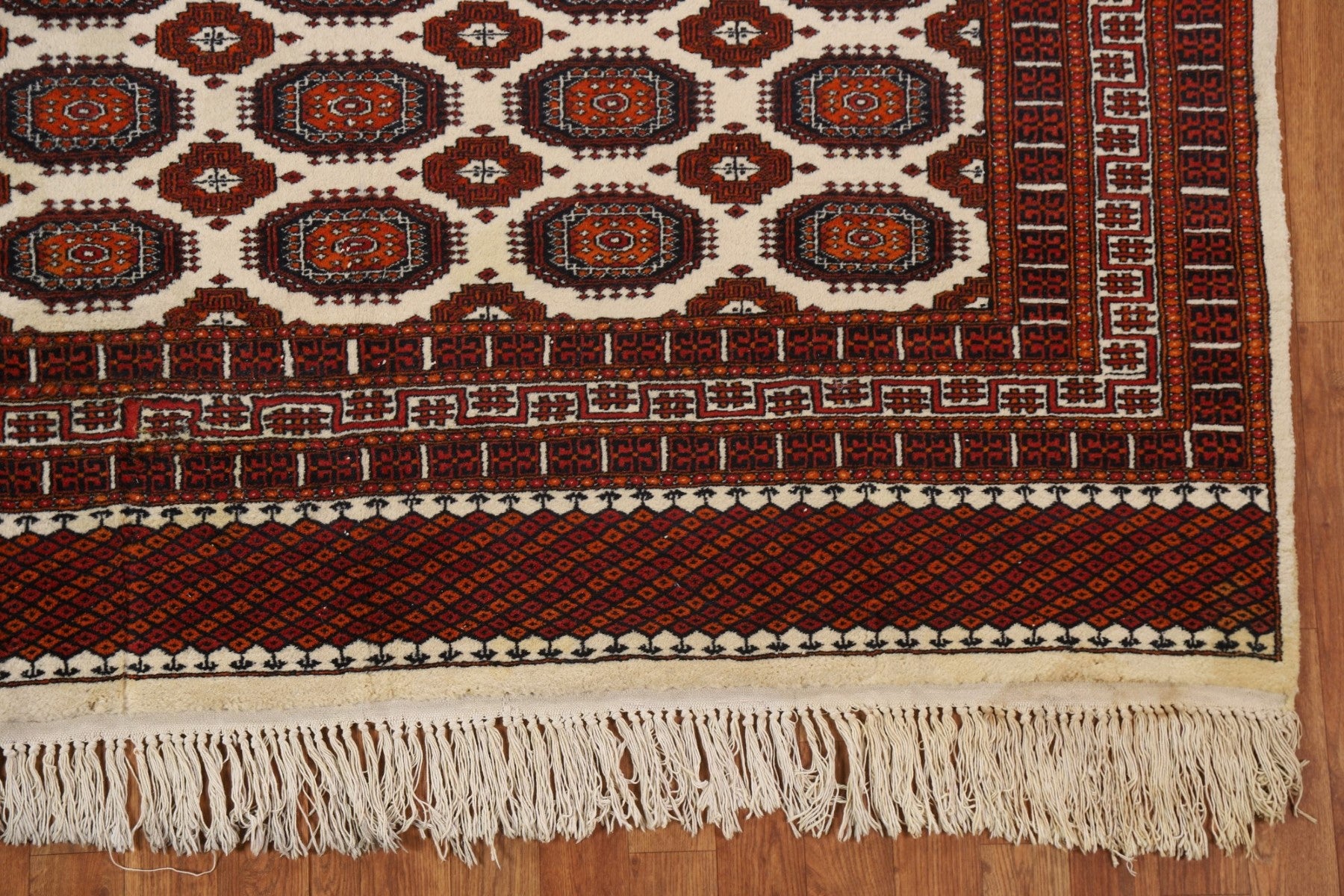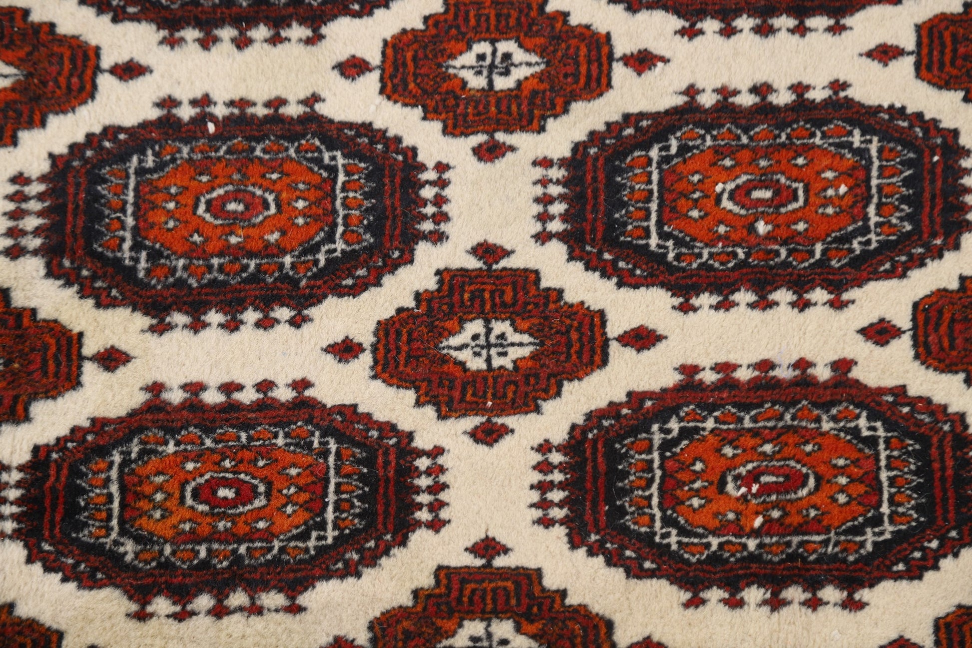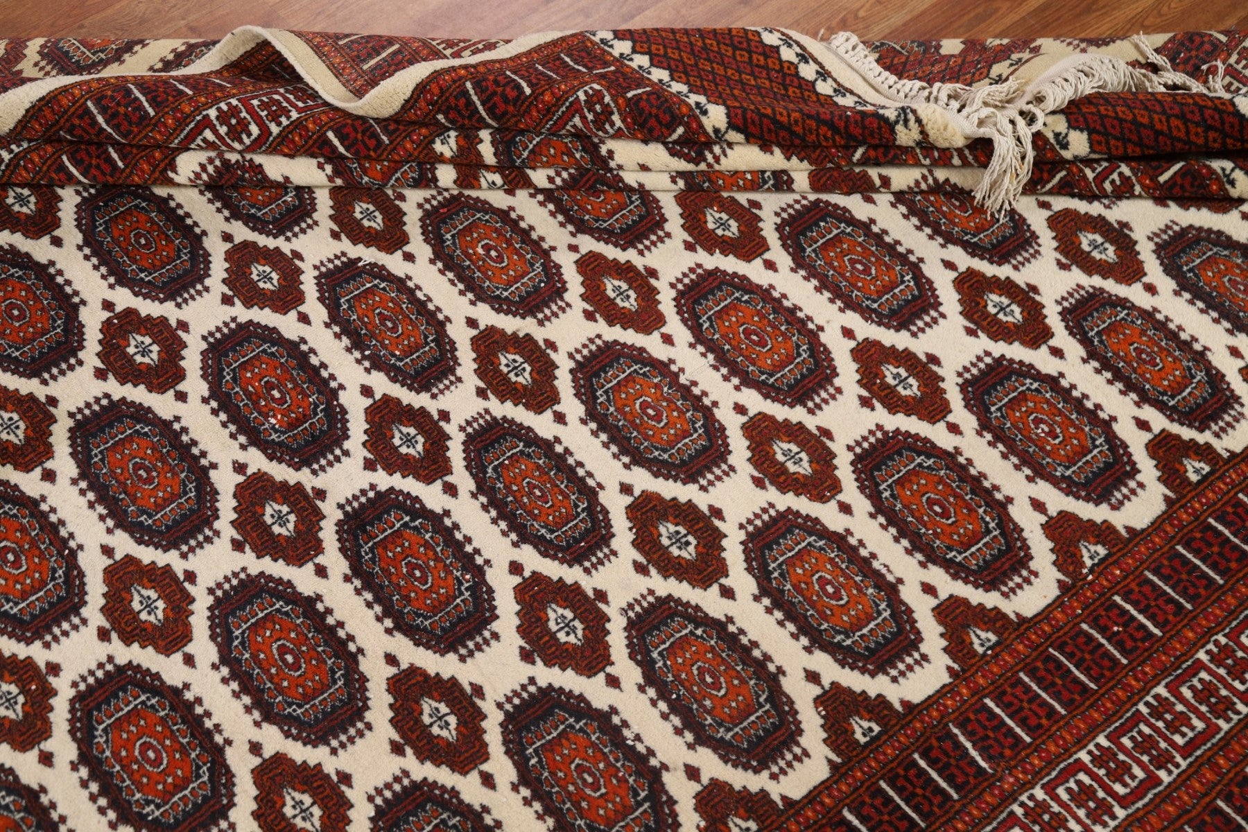 A Beautiful Genuine Pakistan Bokhara rug is Hand Knotted by skillful weavers in Pakistan with 100% Wool Material. This rug is in Very Good condition. dimensions are 9' 3'' X 6' 1'' in foot and 282 X 185 in centimeter. the primary color is Beige & Ivories.