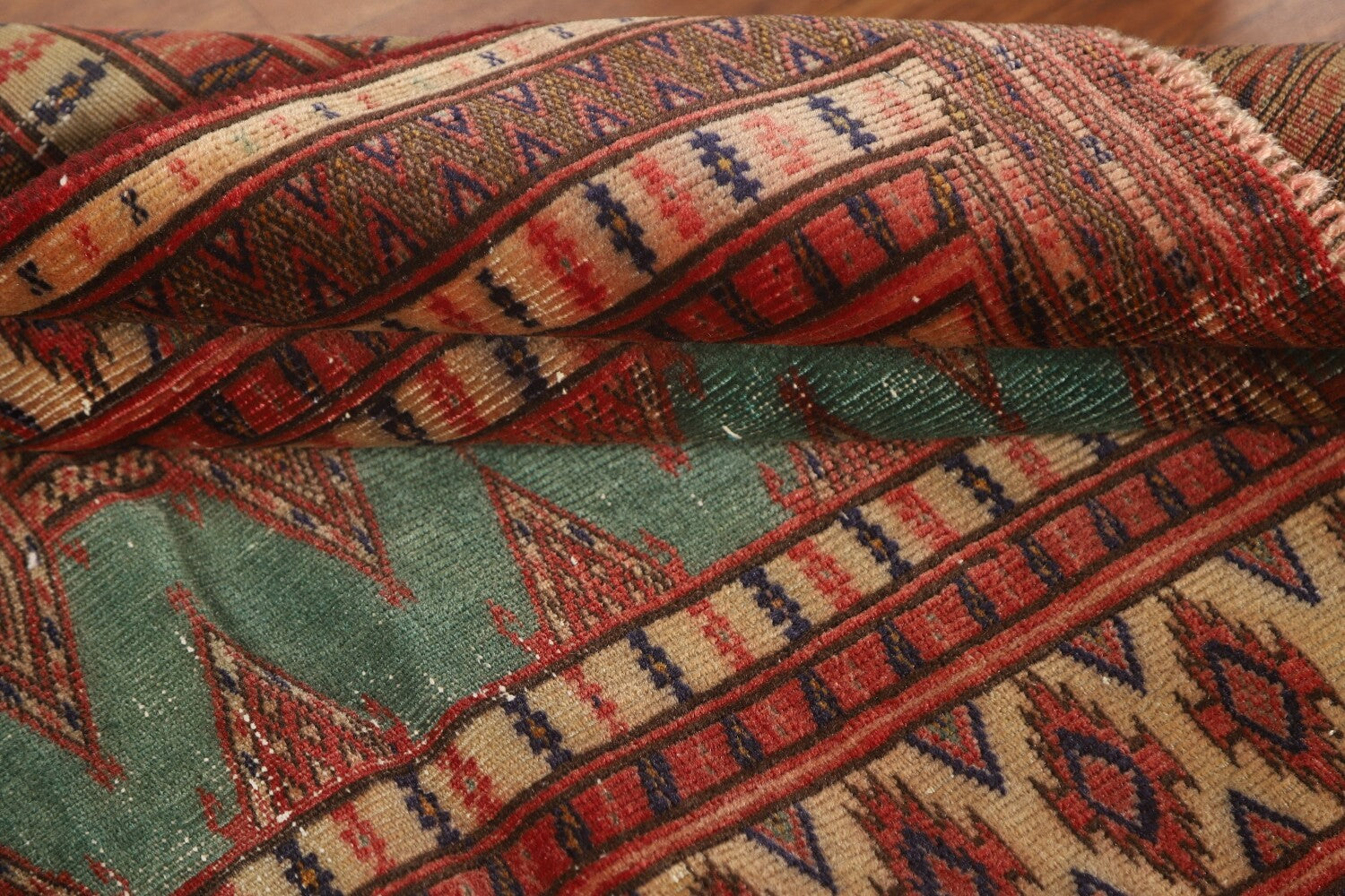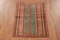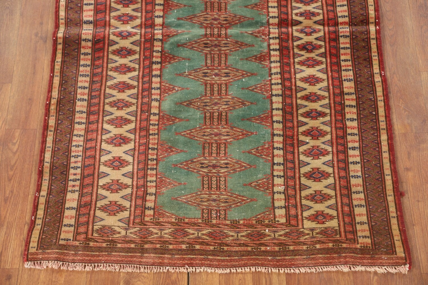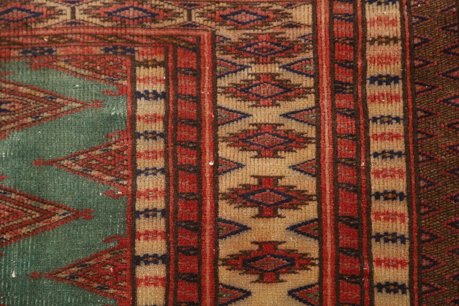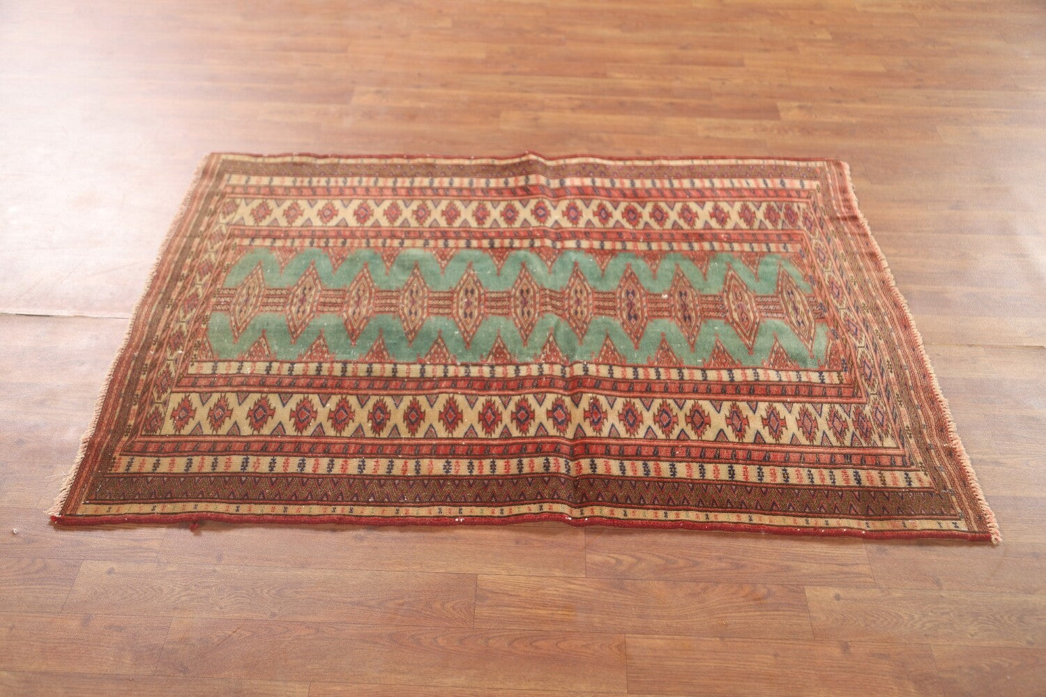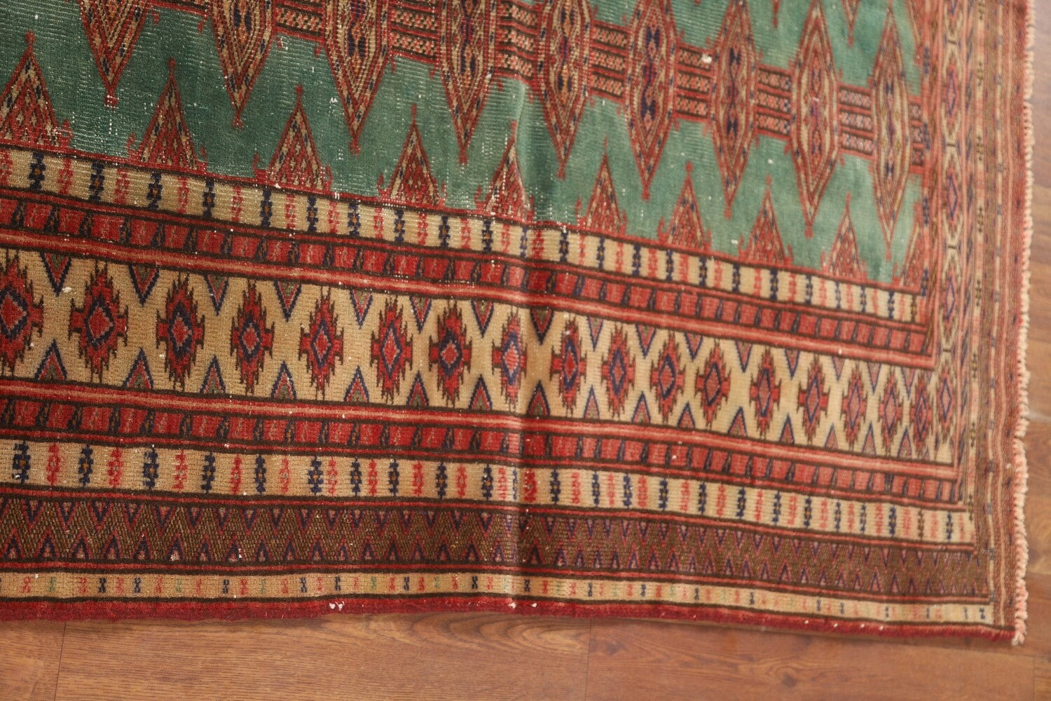 A Beautiful Genuine Pakistan Bokhara rug is Hand Knotted by skillful weavers in Pakistan with 100% Wool Material. This rug is in Very Good (Evenly Low Pile) condition. dimensions are 4' 6'' X 3' 2'' in foot and 137 X 97 in centimeter. the primary color is Green.