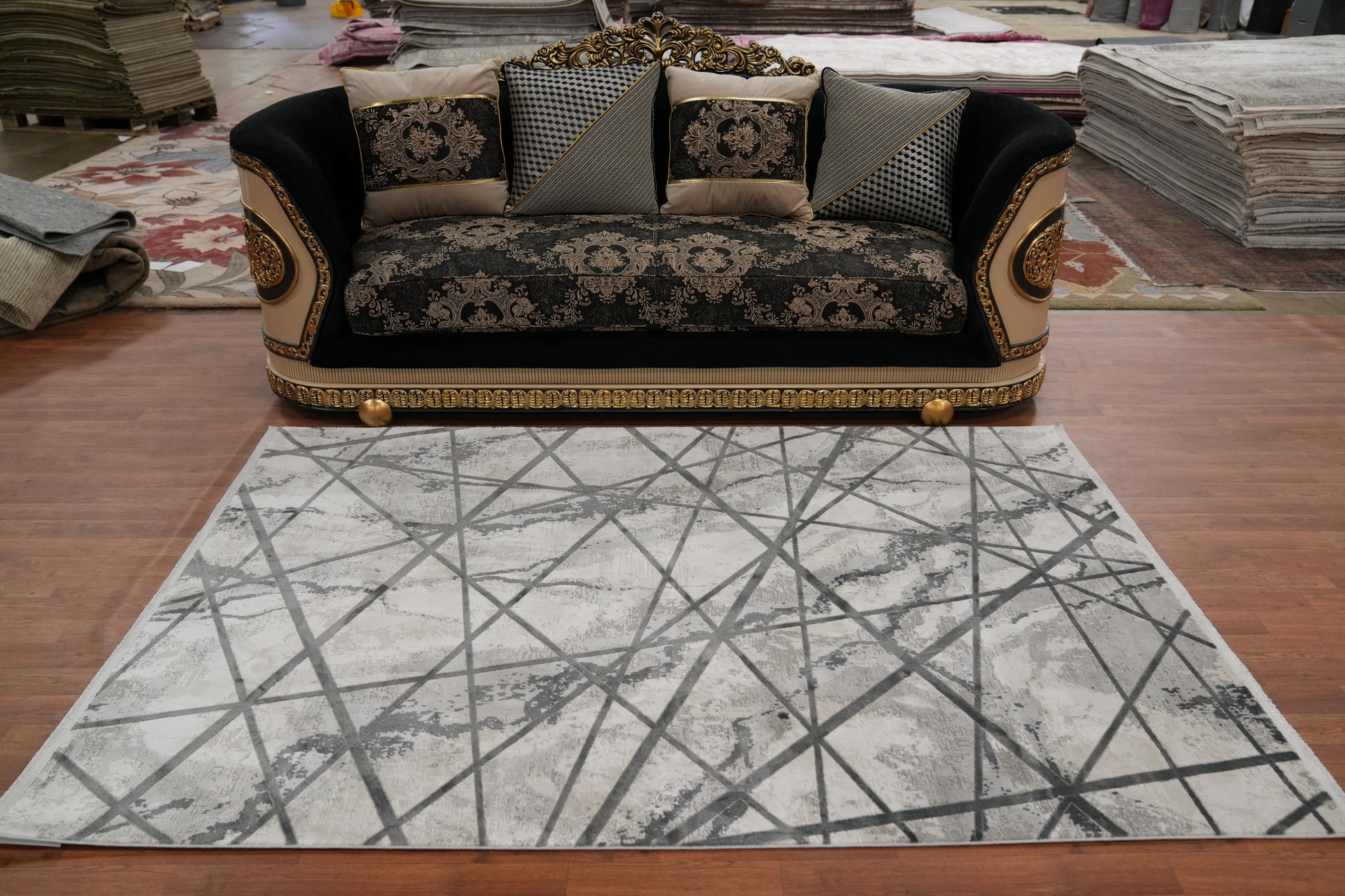 A Beautiful Genuine Turkey Modern rug is Machine Made by skillful weavers in Turkey with Polyester Material. This rug is in New, First Quality condition. dimensions are 7' 5'' X 5' 2'' in foot and 226 X 157 in centimeter. the primary color is Greys & Charcoal.