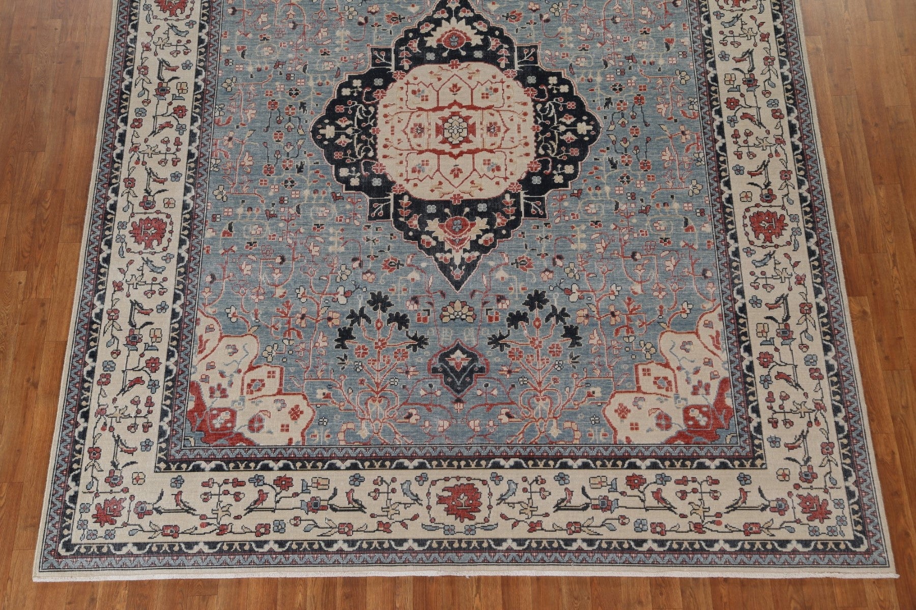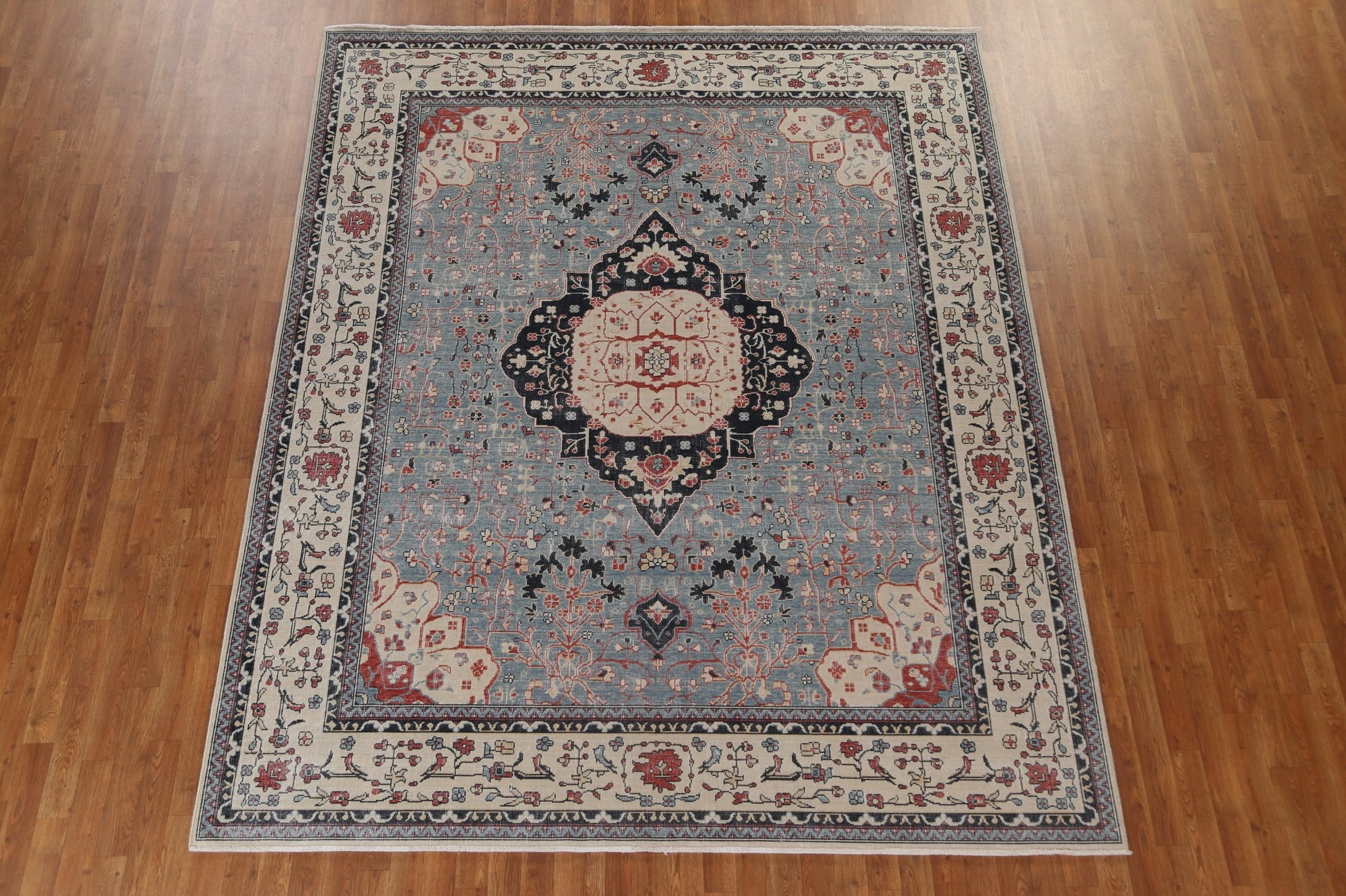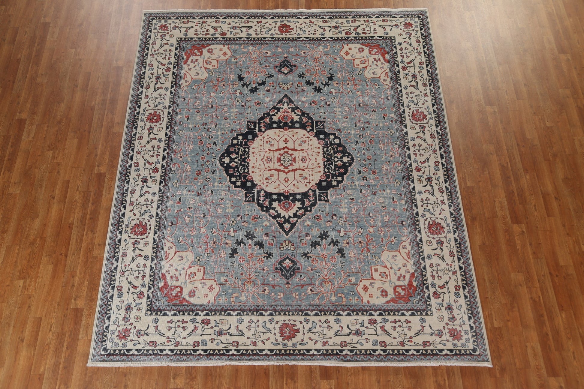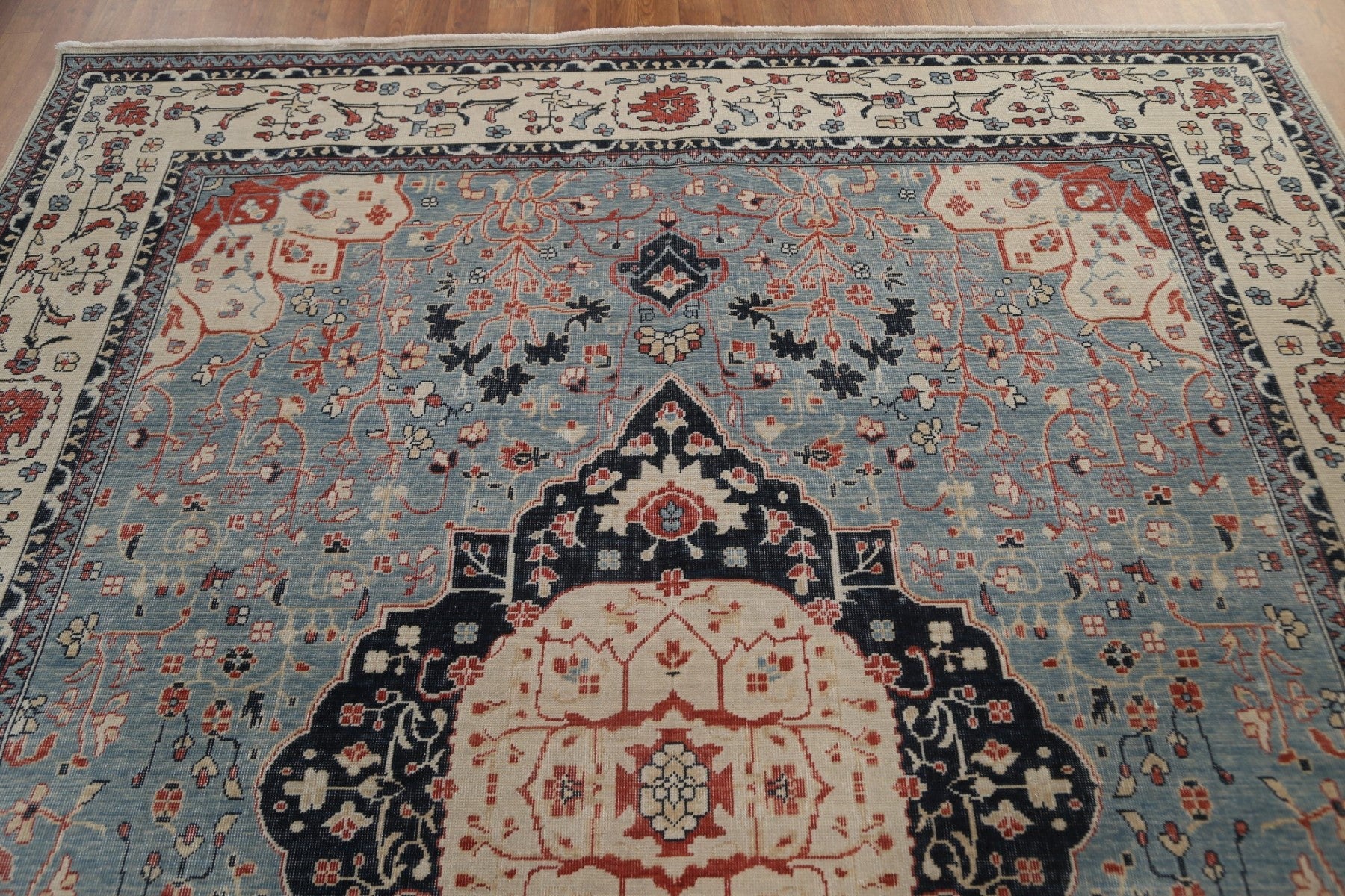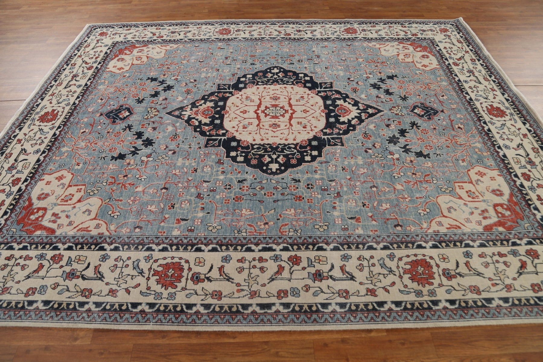 A Beautiful Genuine Turkey Kashan (Mohtasham) rug is Hand Knotted by skillful weavers in Turkey with 100% Wool Material. This rug is in New, First Quality condition. dimensions are 9' 9'' X 8' 0'' in foot and 297 X 244 in centimeter. the primary color is Navy Blue & Blues.