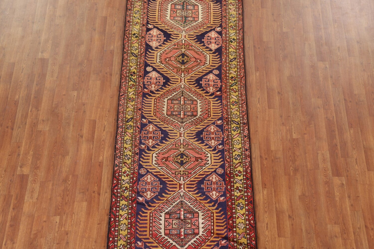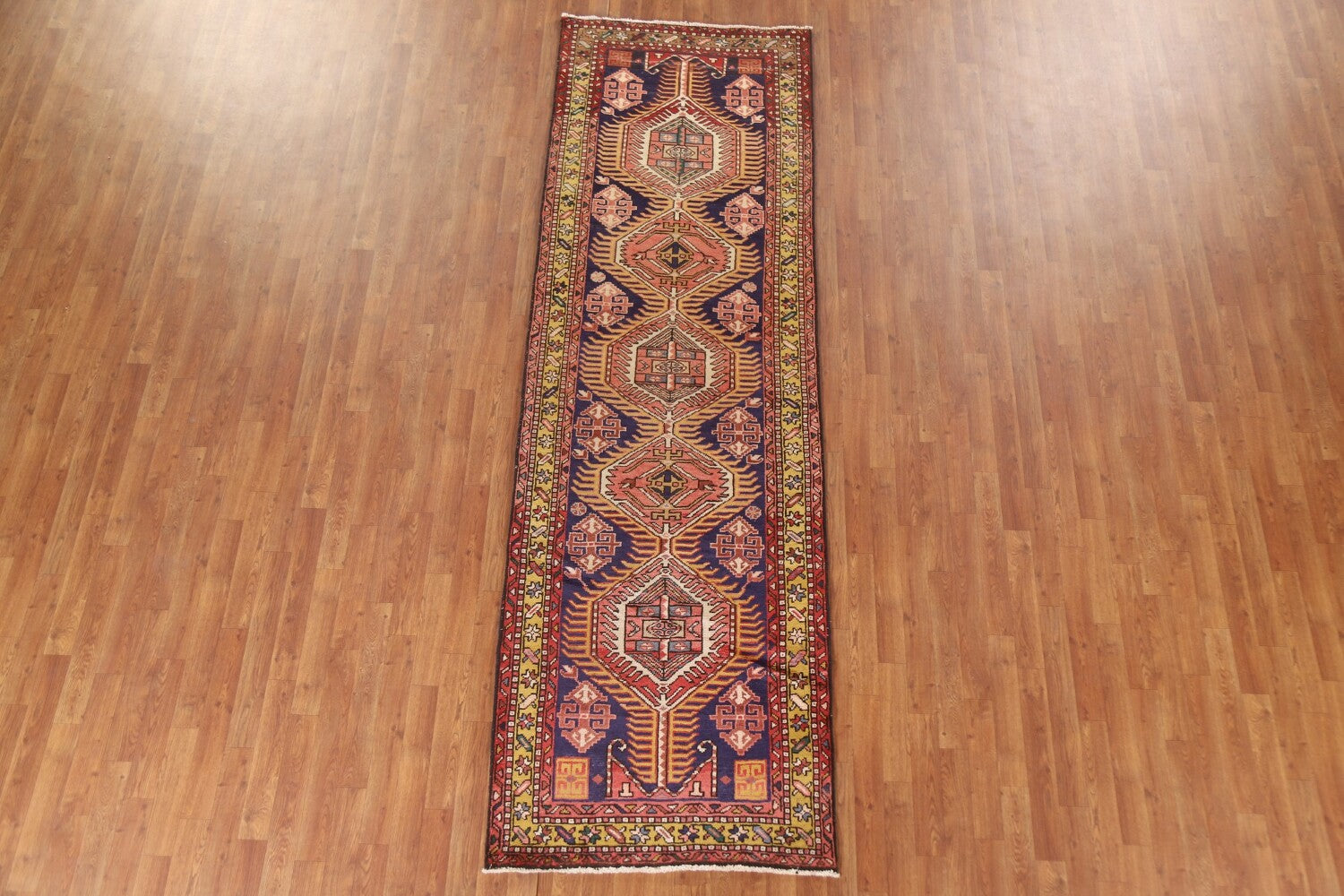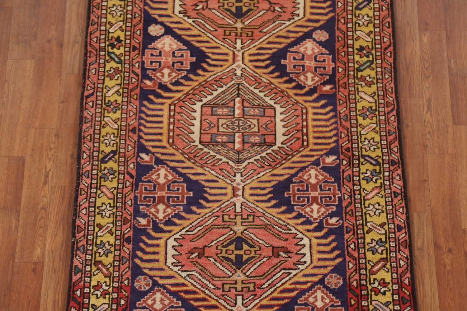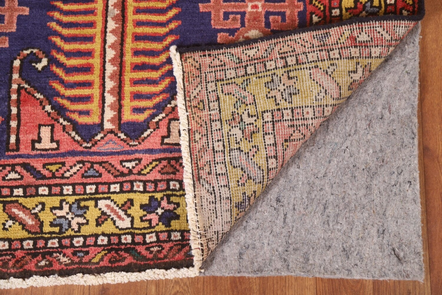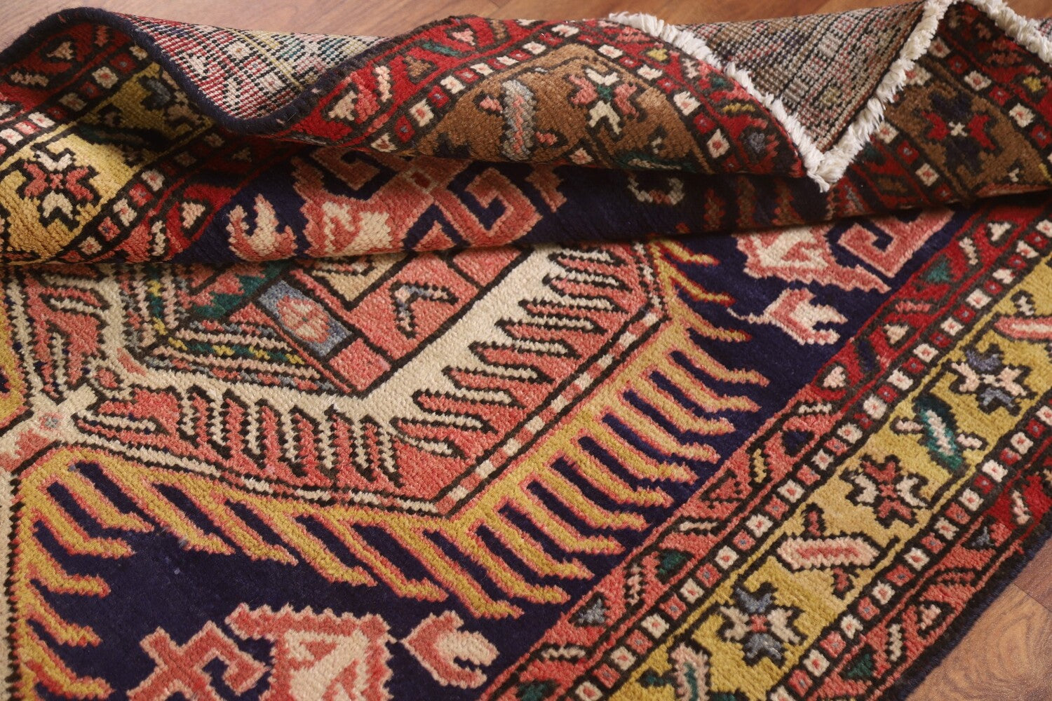 A Beautiful Genuine Persia ( Persia ) Gharajeh rug is Hand Knotted by skillful weavers in Persia ( Persia ) with 100% Wool Material. This rug is in Very Good condition. dimensions are 10' 5'' X 3' 3'' in foot and 318 X 99 in centimeter. the primary color is Navy Blue & Blues.