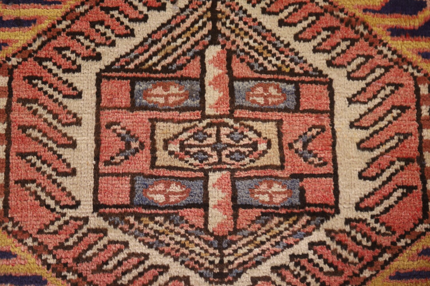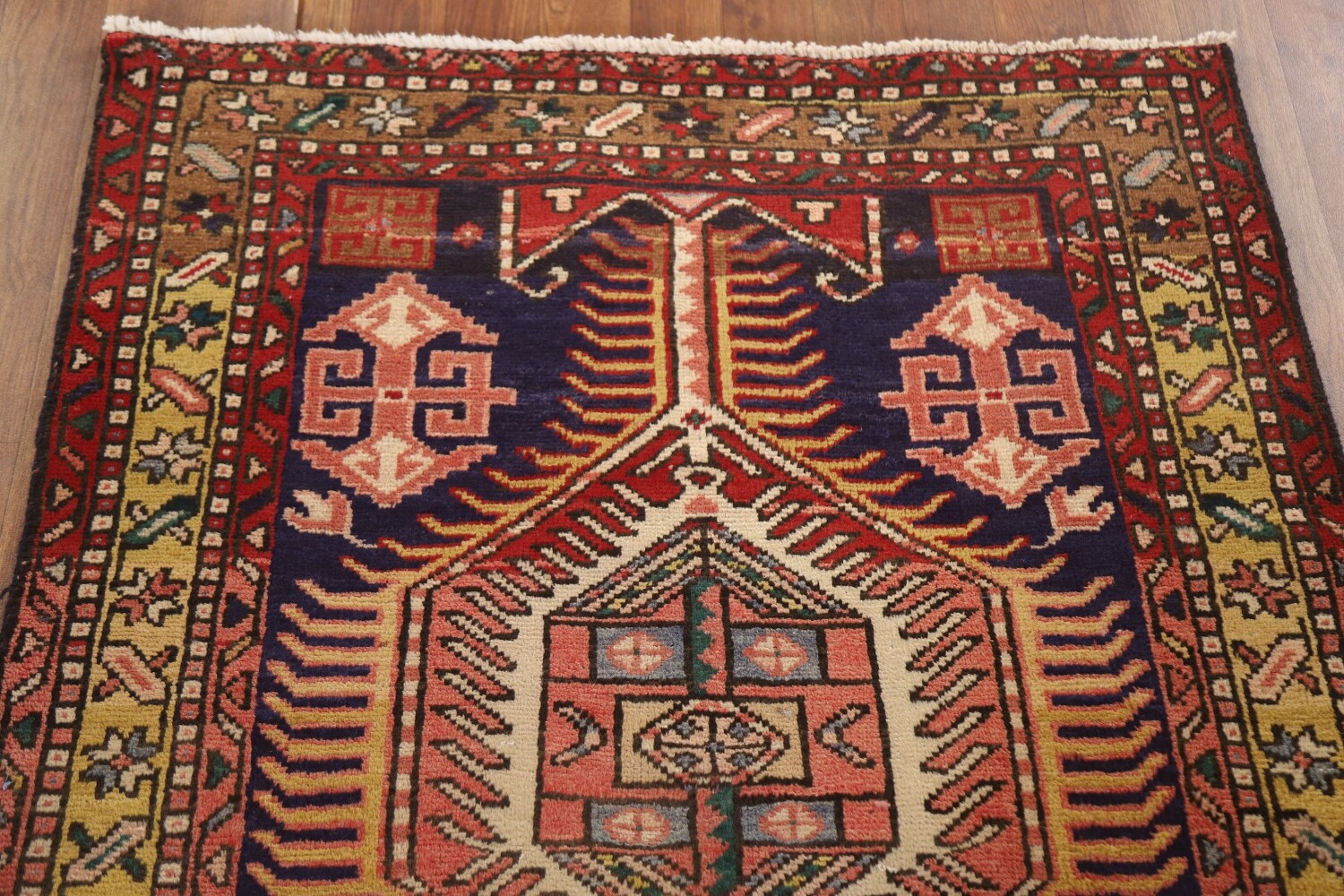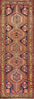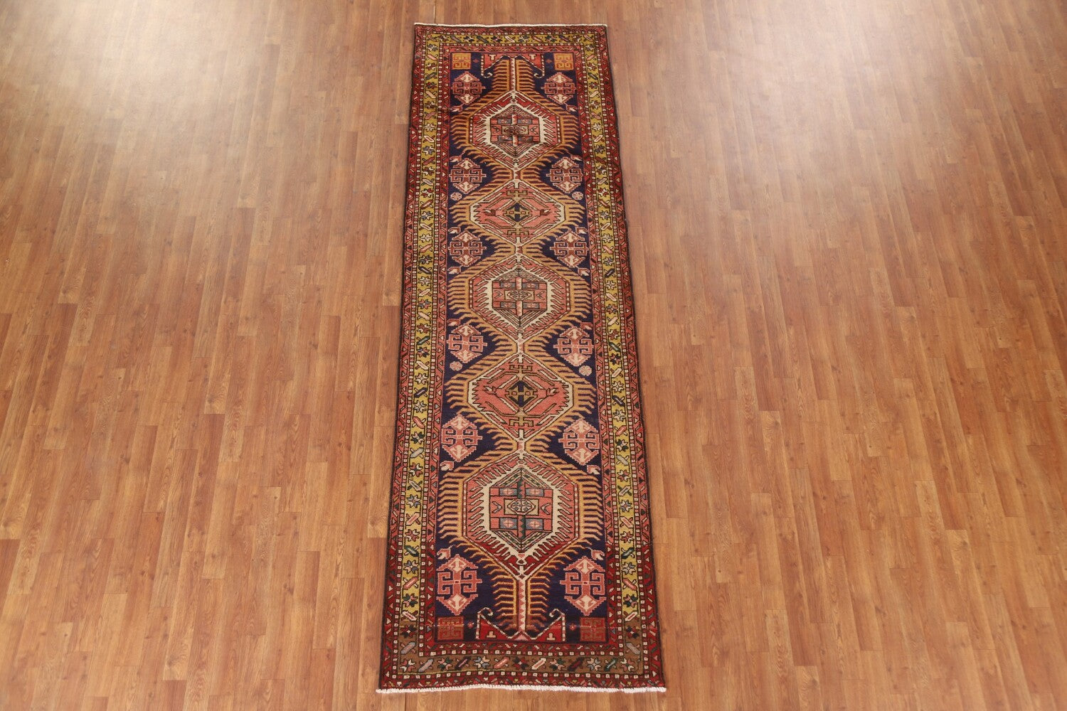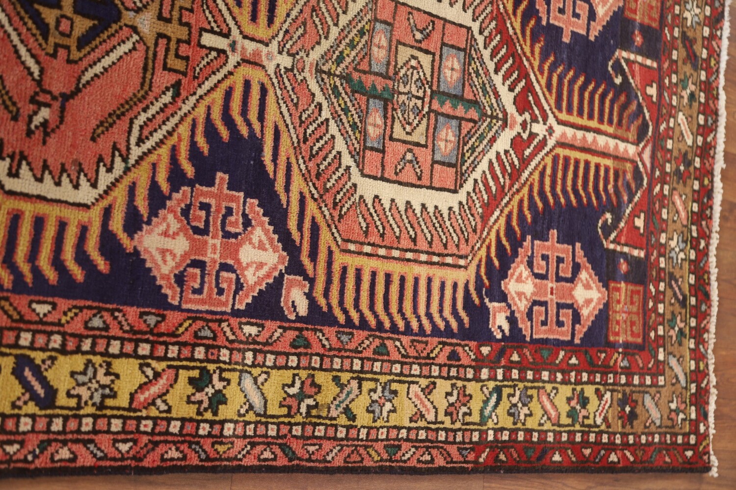 A Beautiful Genuine Persia ( Persia ) Gharajeh rug is Hand Knotted by skillful weavers in Persia ( Persia ) with 100% Wool Material. This rug is in Very Good condition. dimensions are 10' 5'' X 3' 3'' in foot and 318 X 99 in centimeter. the primary color is Navy Blue & Blues.