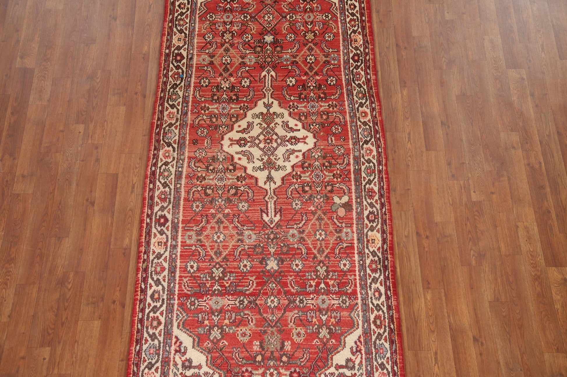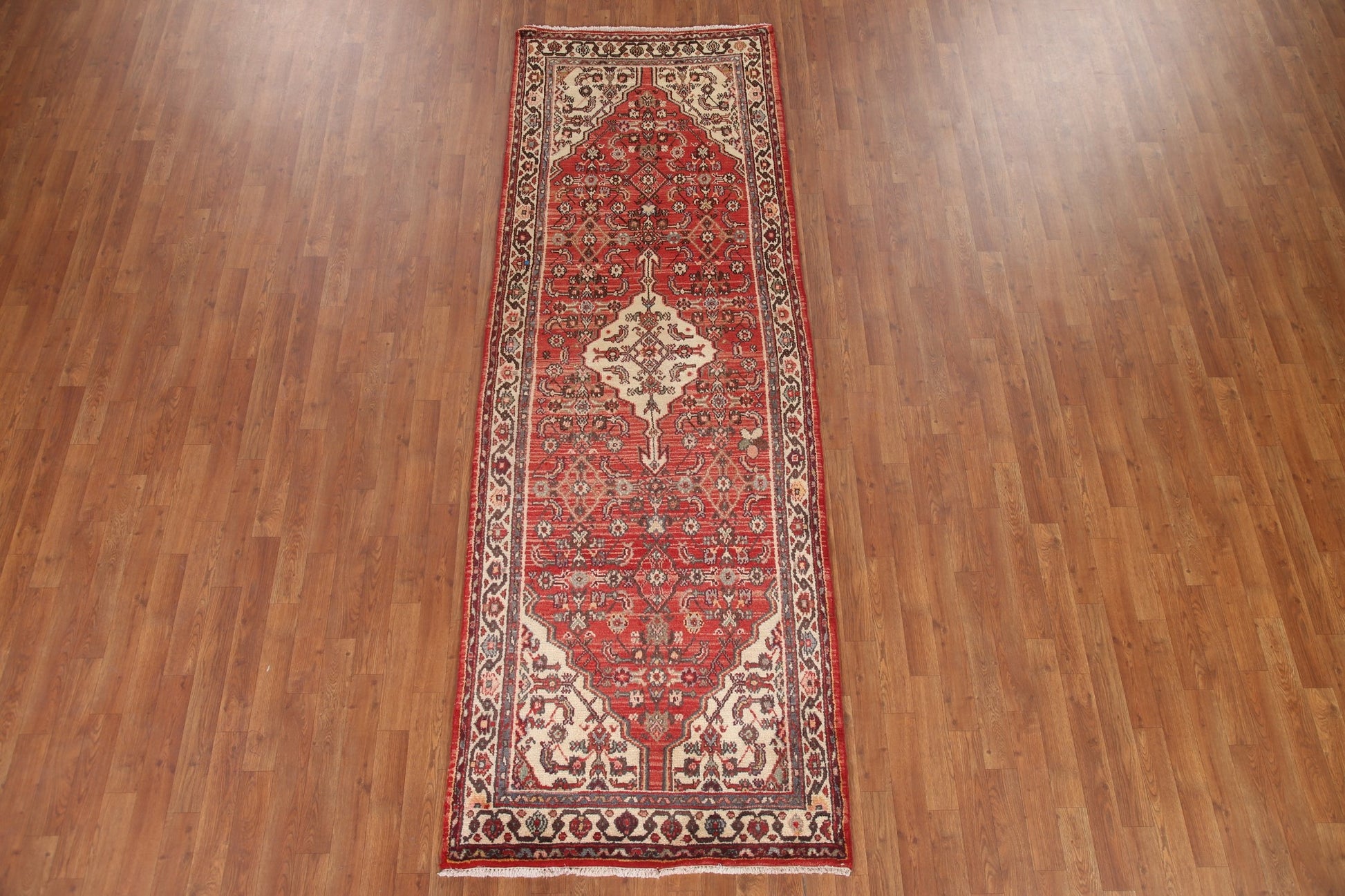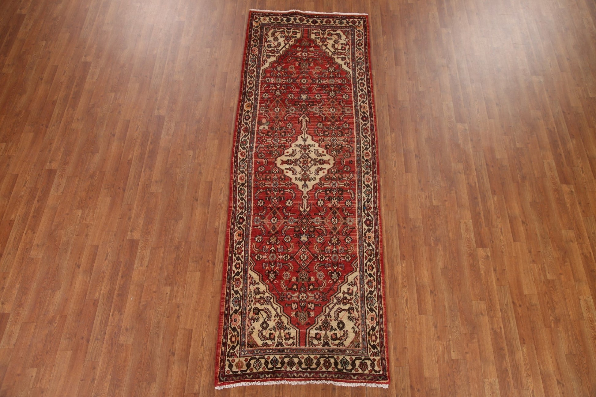 A Beautiful Genuine Persia ( Persia ) Hamedan rug is Hand Knotted by skillful weavers in Persia ( Persia ) with 100% Wool Material. This rug is in Very Good (Abrash) condition. dimensions are 9' 9'' X 3' 5'' in foot and 297 X 104 in centimeter. the primary color is Red.