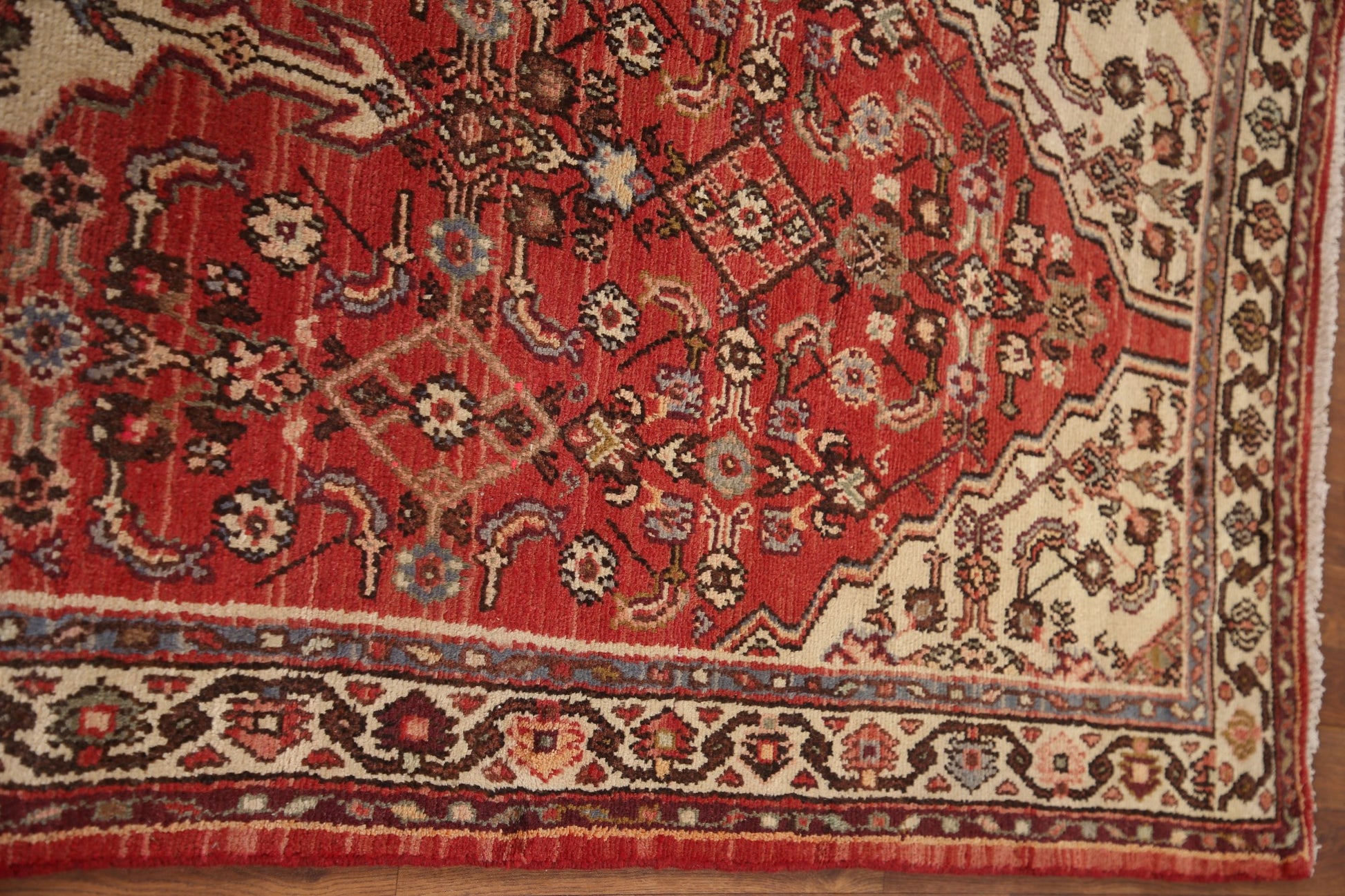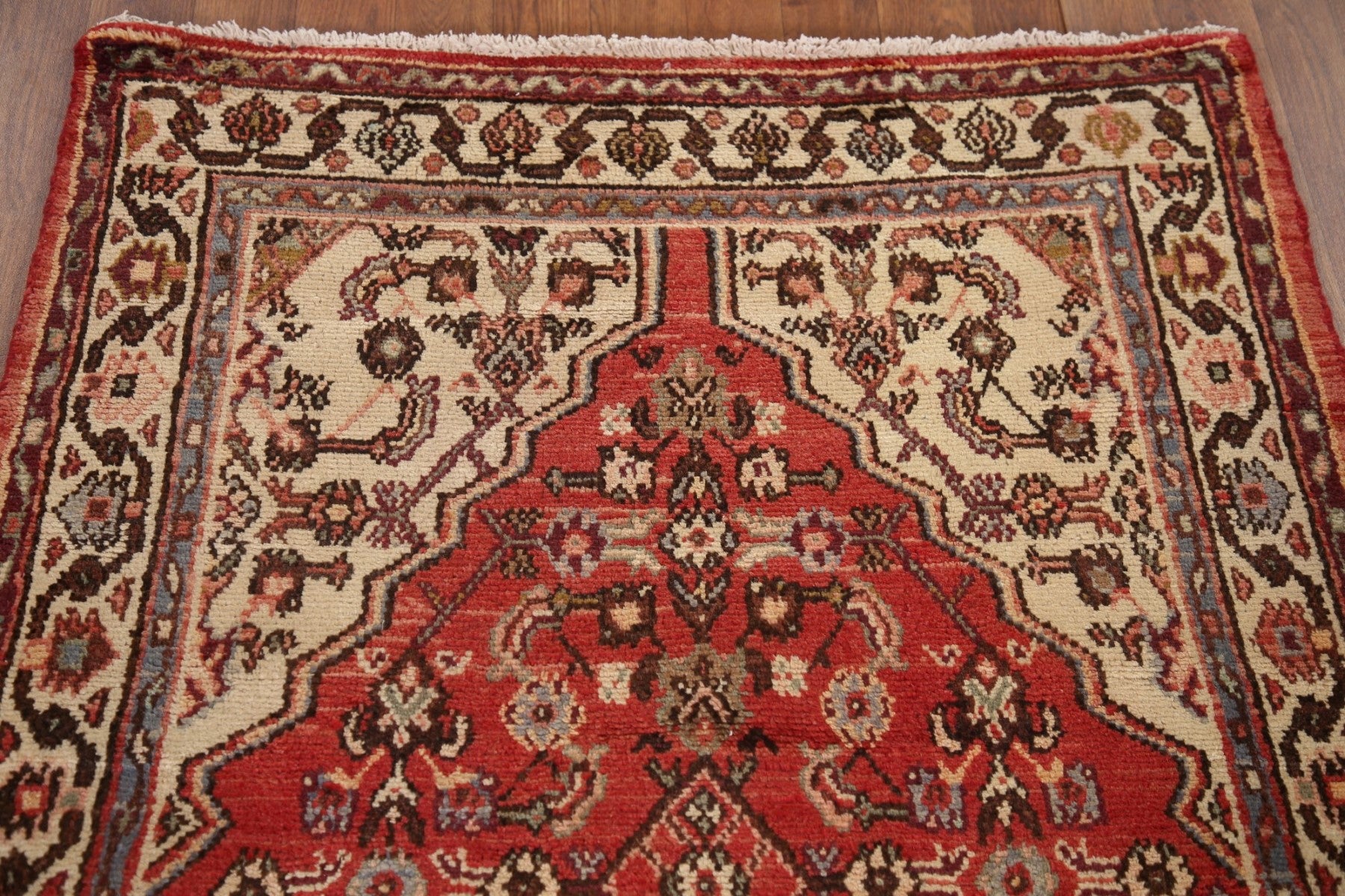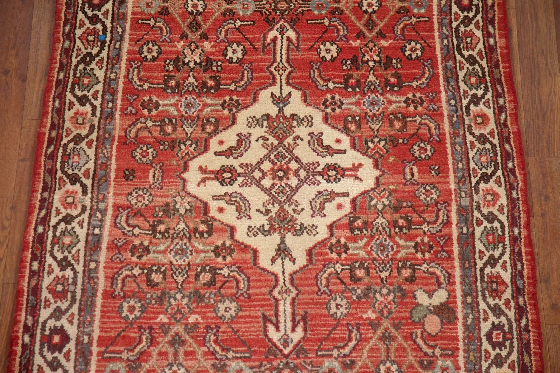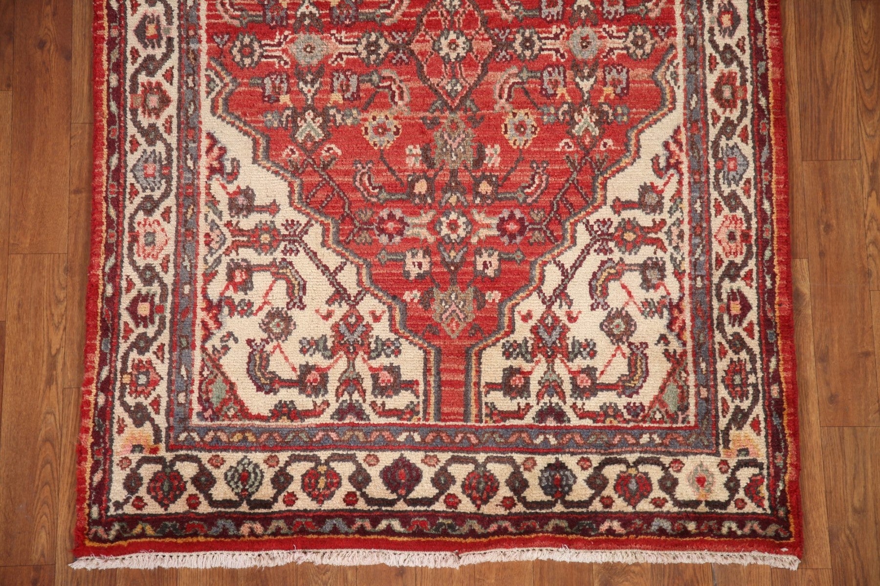 A Beautiful Genuine Persia ( Persia ) Hamedan rug is Hand Knotted by skillful weavers in Persia ( Persia ) with 100% Wool Material. This rug is in Very Good (Abrash) condition. dimensions are 9' 9'' X 3' 5'' in foot and 297 X 104 in centimeter. the primary color is Red.