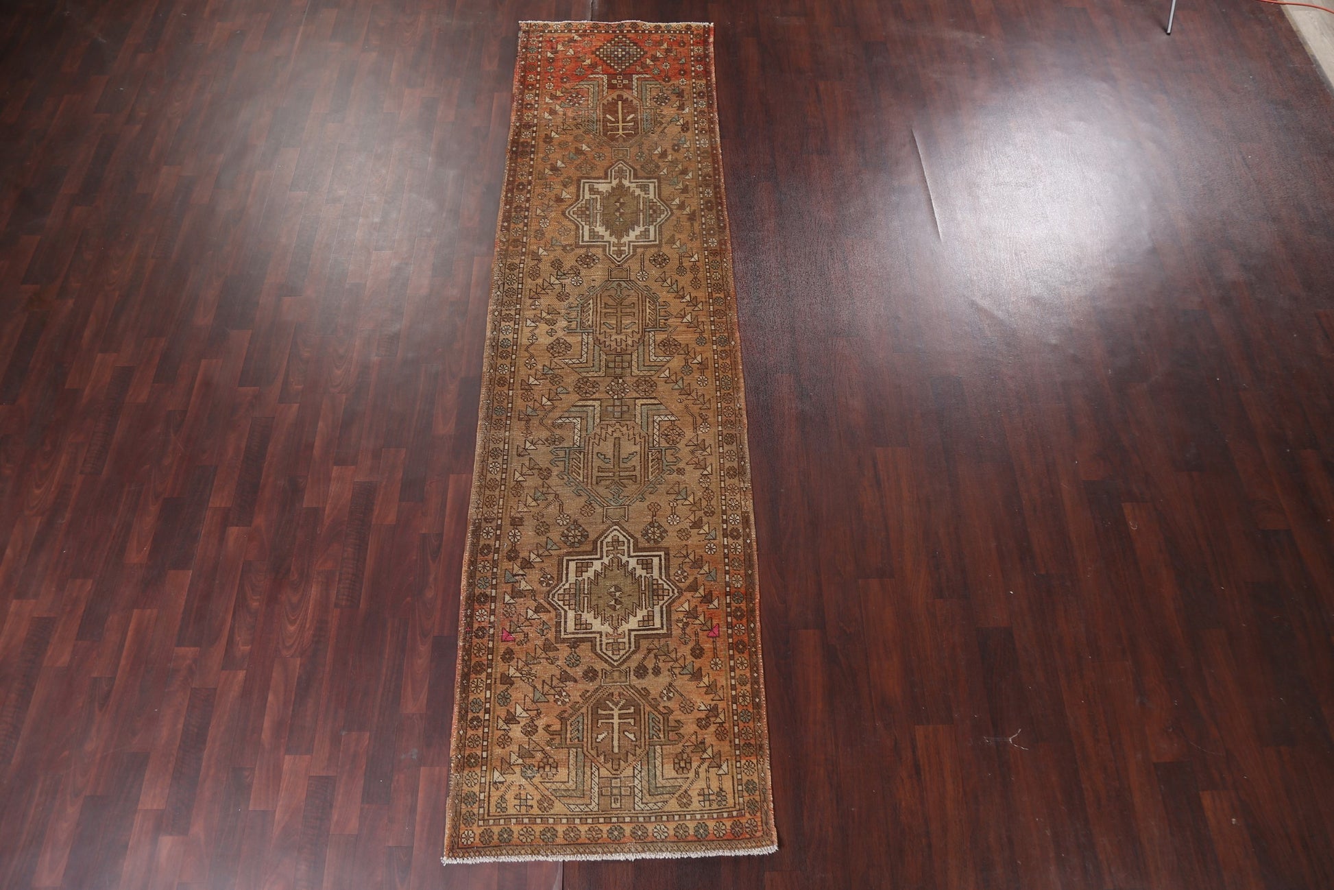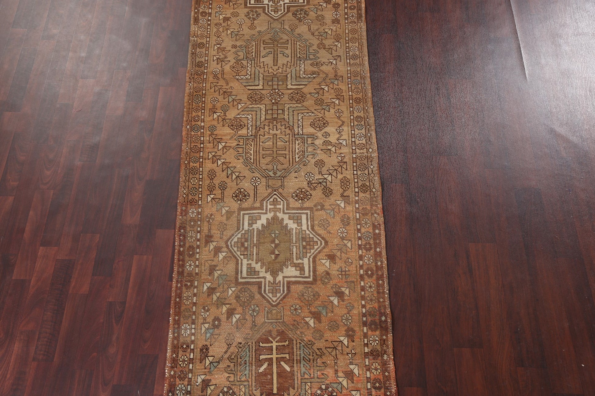 A Beautiful Genuine Persia ( Persia ) Hamedan rug is Hand Knotted by skillful weavers in Persia ( Persia ) with 100% Wool Material. This rug is in Very Good (Evenly Low Pile) condition. dimensions are 12' 4'' X 3' 2'' in foot and 376 X 97 in centimeter. the primary color is Brown.