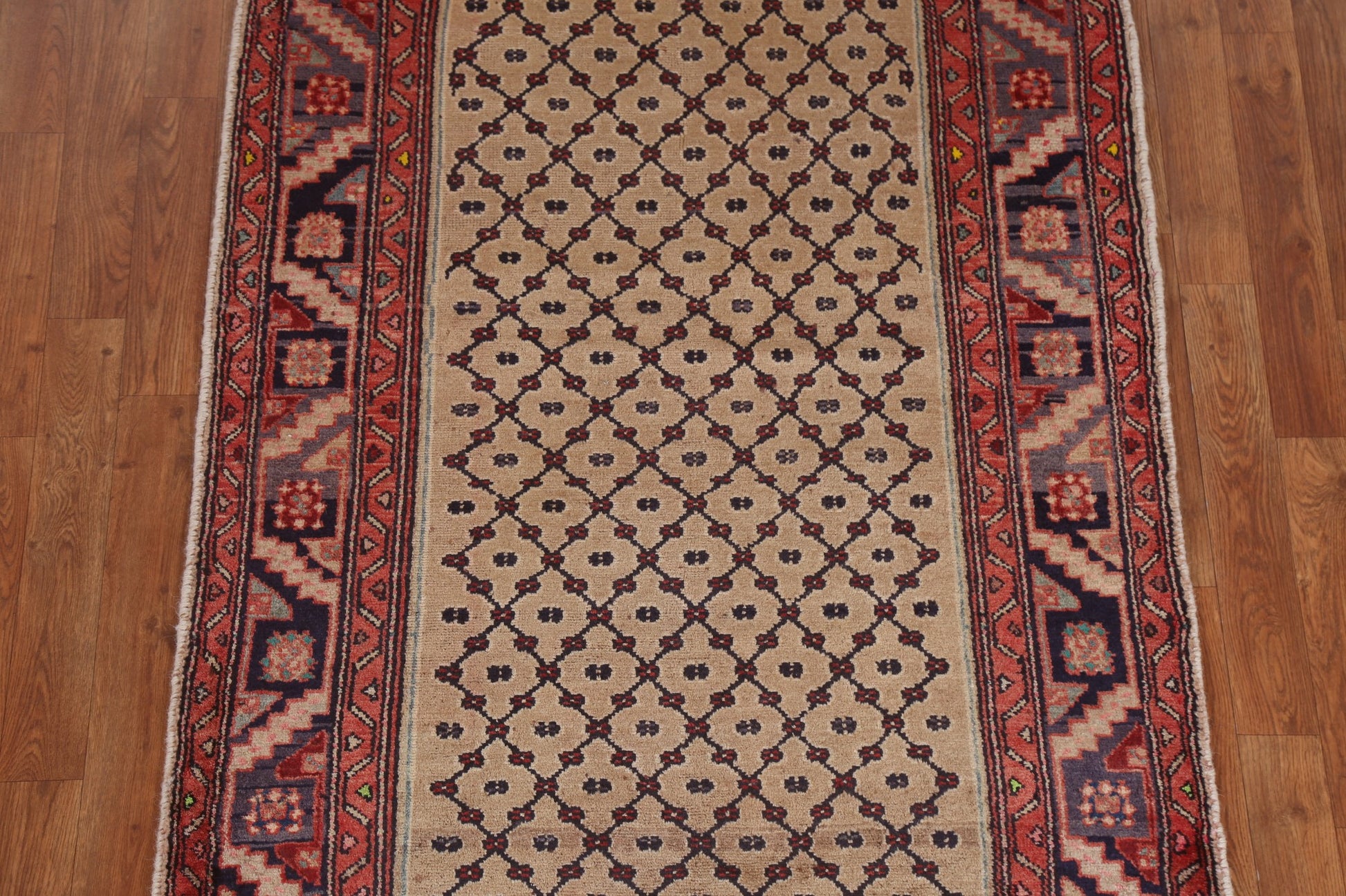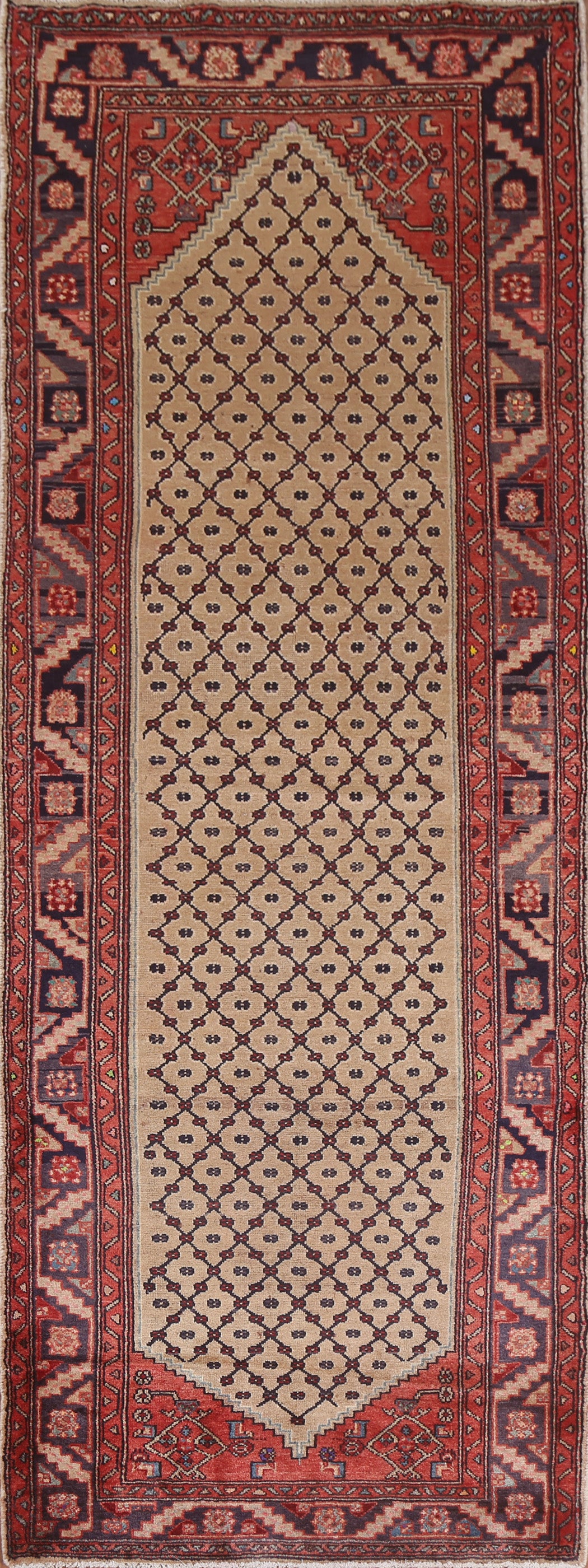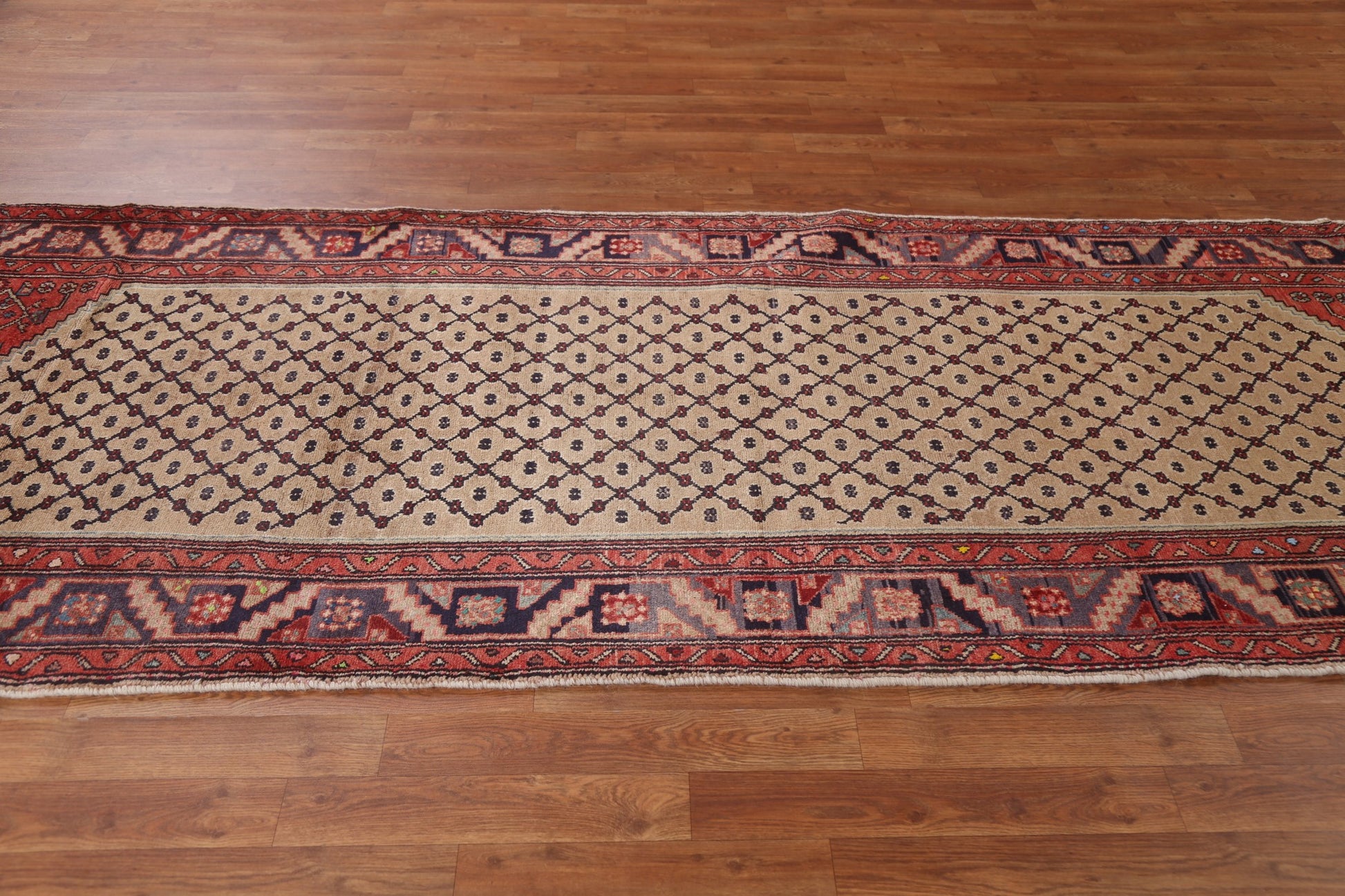 A Beautiful Genuine Persia ( Persia ) Hamedan rug is Hand Knotted by skillful weavers in Persia ( Persia ) with 100% Wool Material. This rug is in Excellent ( Abrash ) condition. dimensions are 9' 7'' X 3' 6'' in foot and 292 X 107 in centimeter. the primary color is Beige & Ivories.