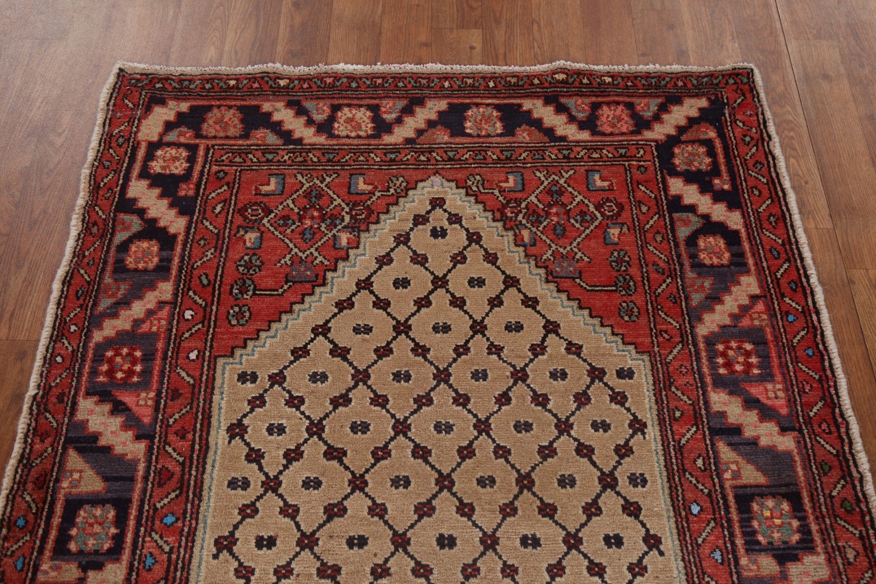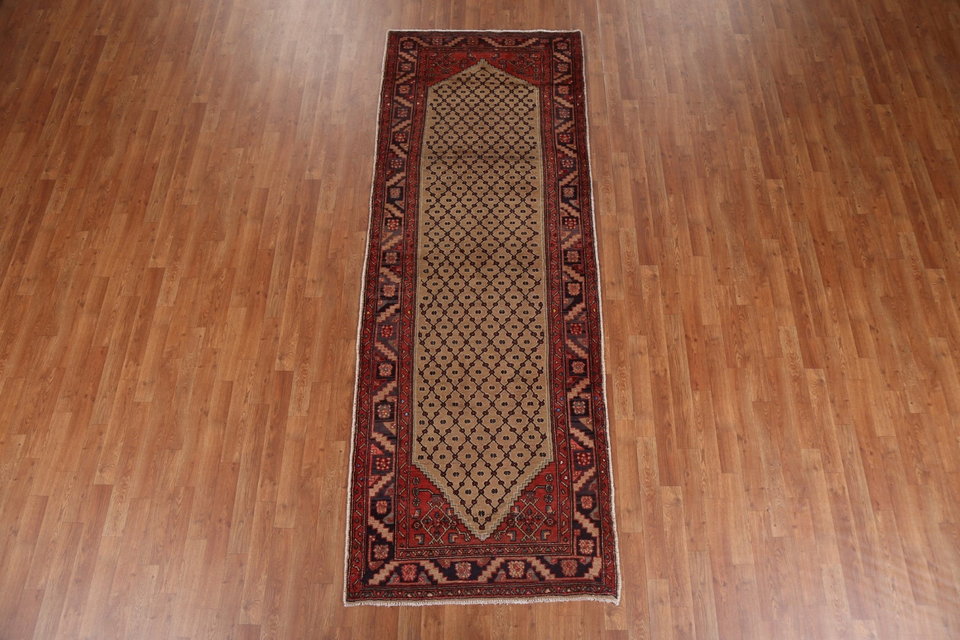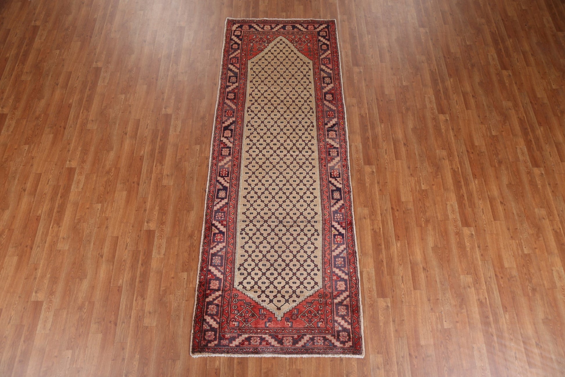 A Beautiful Genuine Persia ( Persia ) Hamedan rug is Hand Knotted by skillful weavers in Persia ( Persia ) with 100% Wool Material. This rug is in Excellent ( Abrash ) condition. dimensions are 9' 7'' X 3' 6'' in foot and 292 X 107 in centimeter. the primary color is Beige & Ivories.