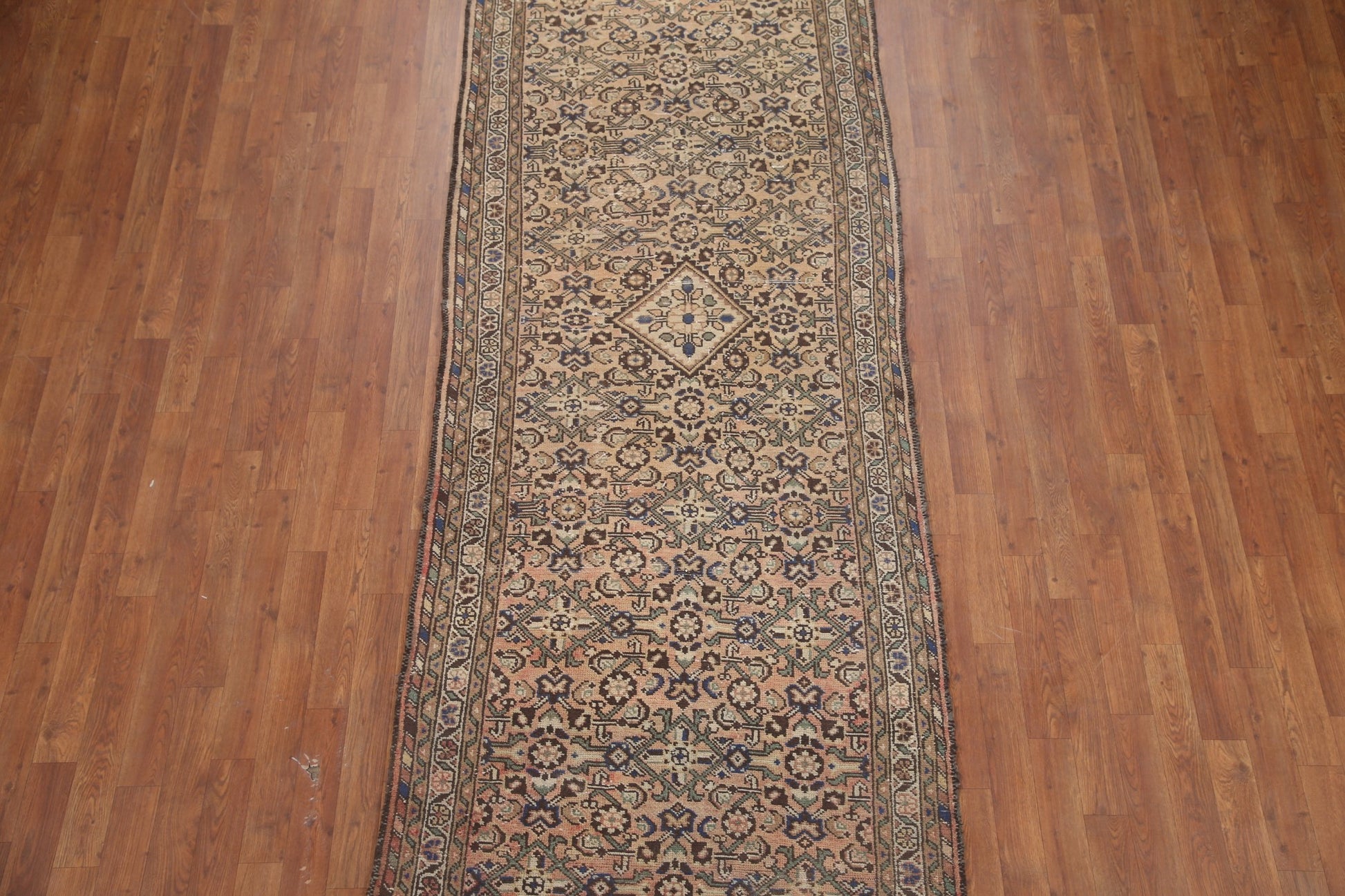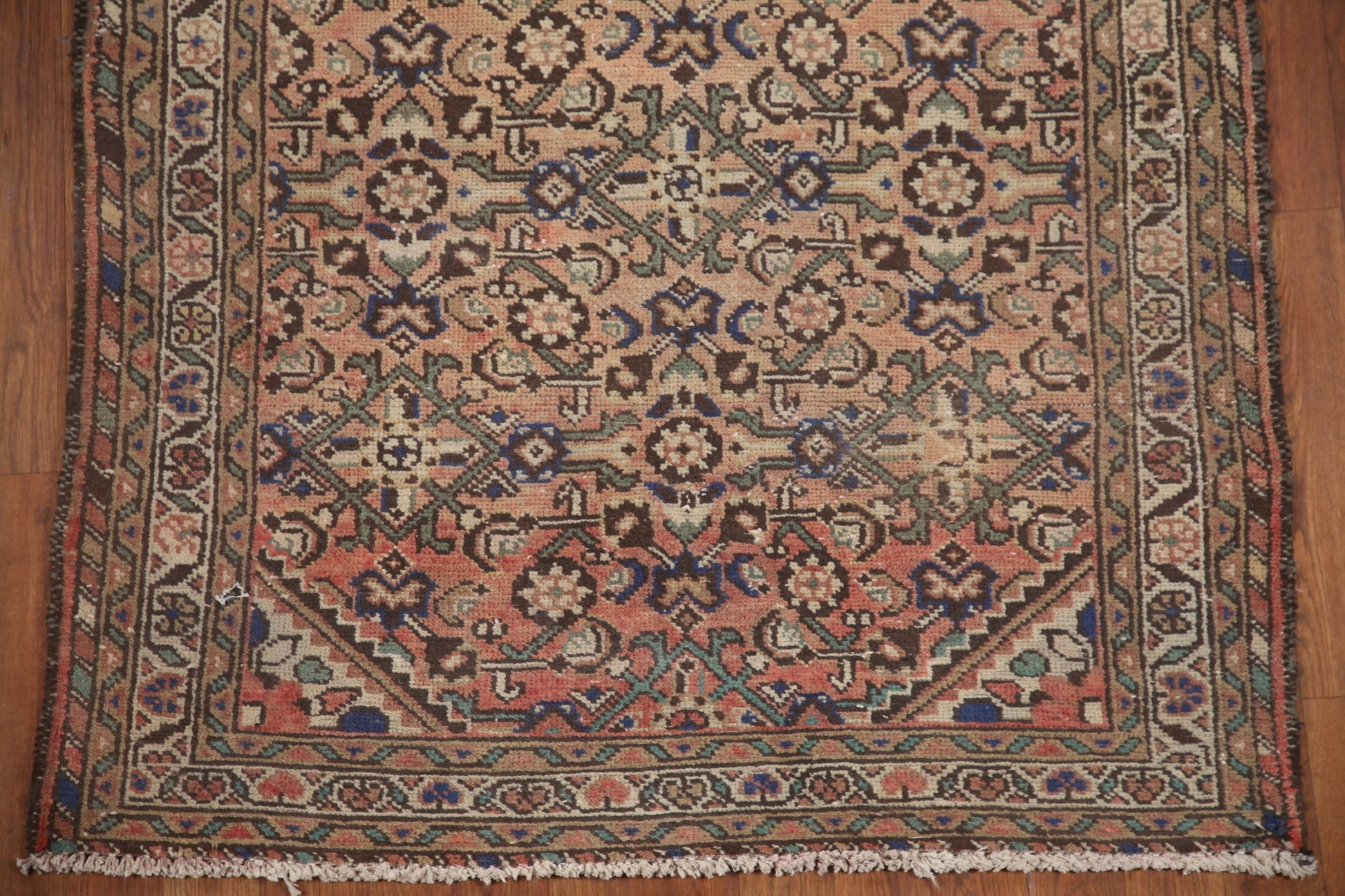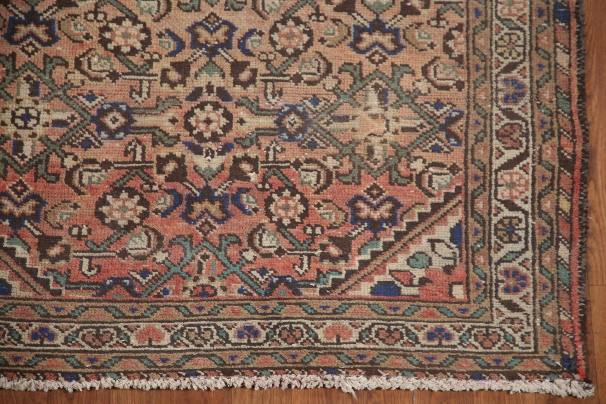 A Beautiful Genuine Persia ( Persia ) Hamedan rug is Hand Knotted by skillful weavers in Persia ( Persia ) with 100% Wool Material. This rug is in Very Good (Evenly Low Pile-Abrash) condition. dimensions are 11' 3'' X 3' 6'' in foot and 343 X 107 in centimeter. the primary color is Peach.