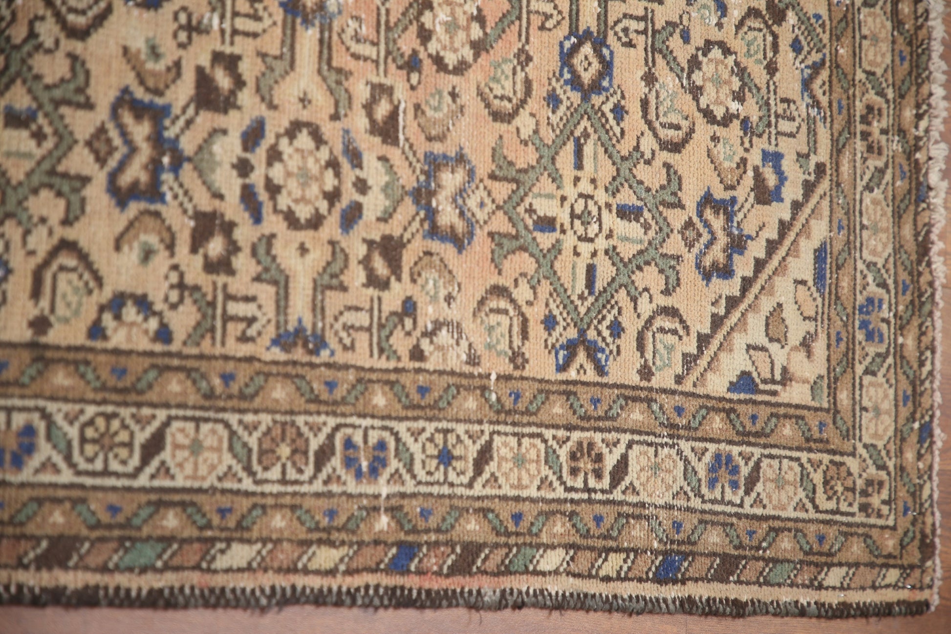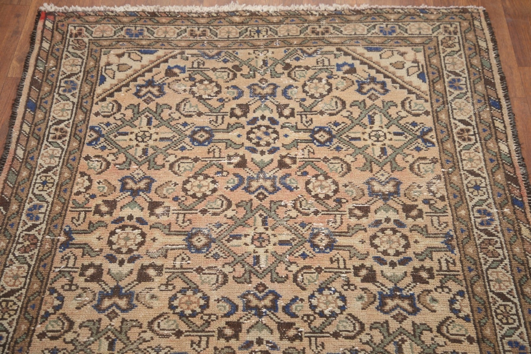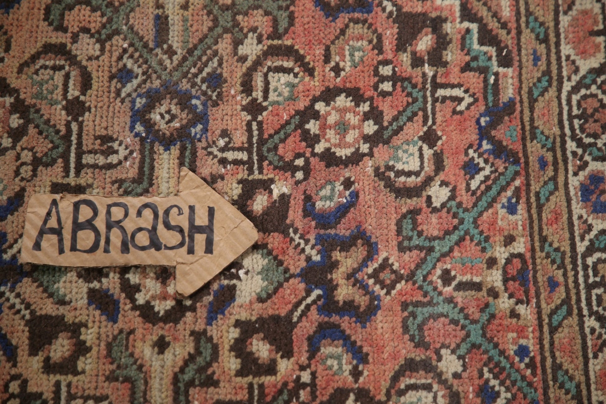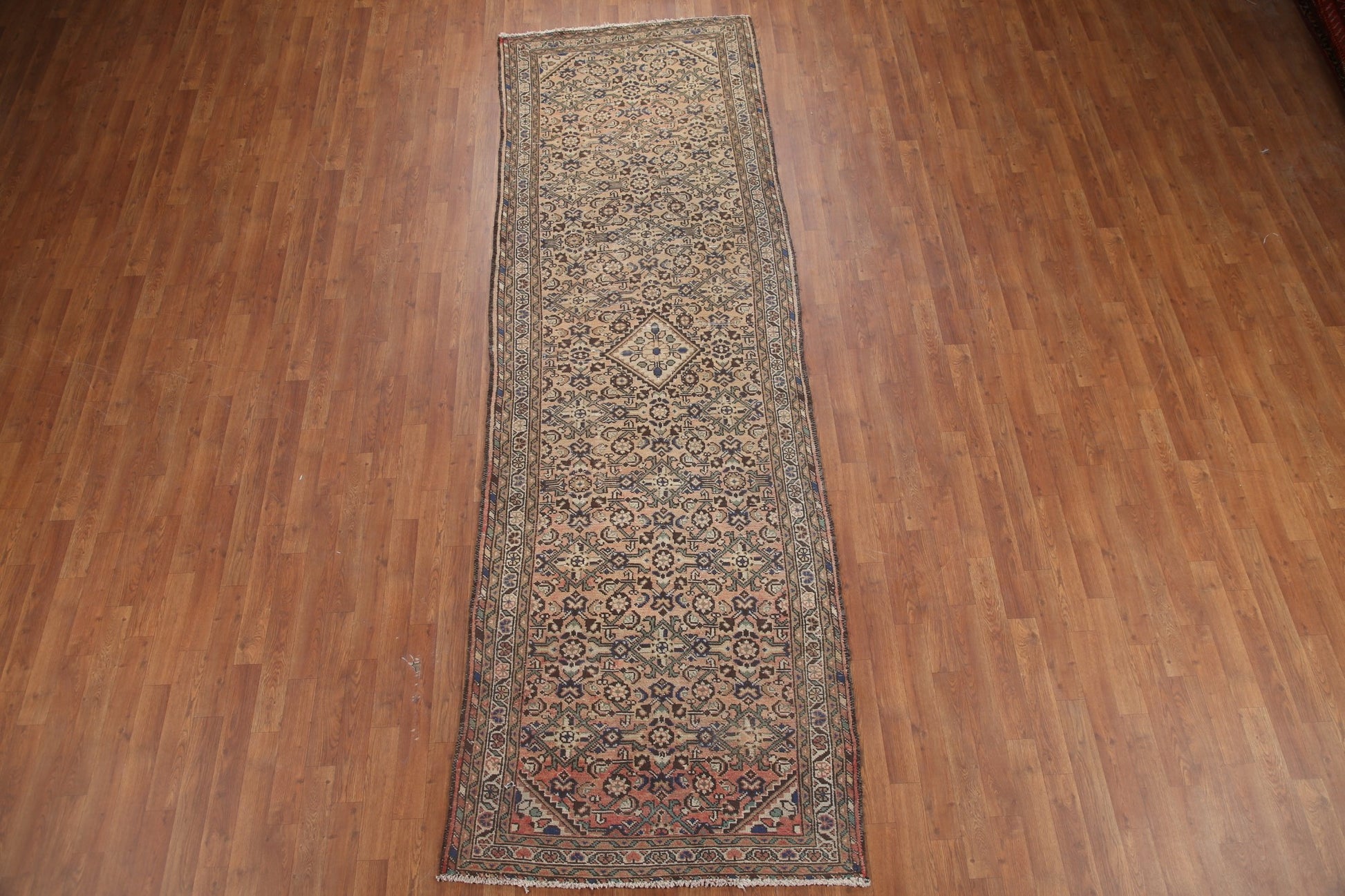 A Beautiful Genuine Persia ( Persia ) Hamedan rug is Hand Knotted by skillful weavers in Persia ( Persia ) with 100% Wool Material. This rug is in Very Good (Evenly Low Pile-Abrash) condition. dimensions are 11' 3'' X 3' 6'' in foot and 343 X 107 in centimeter. the primary color is Peach.