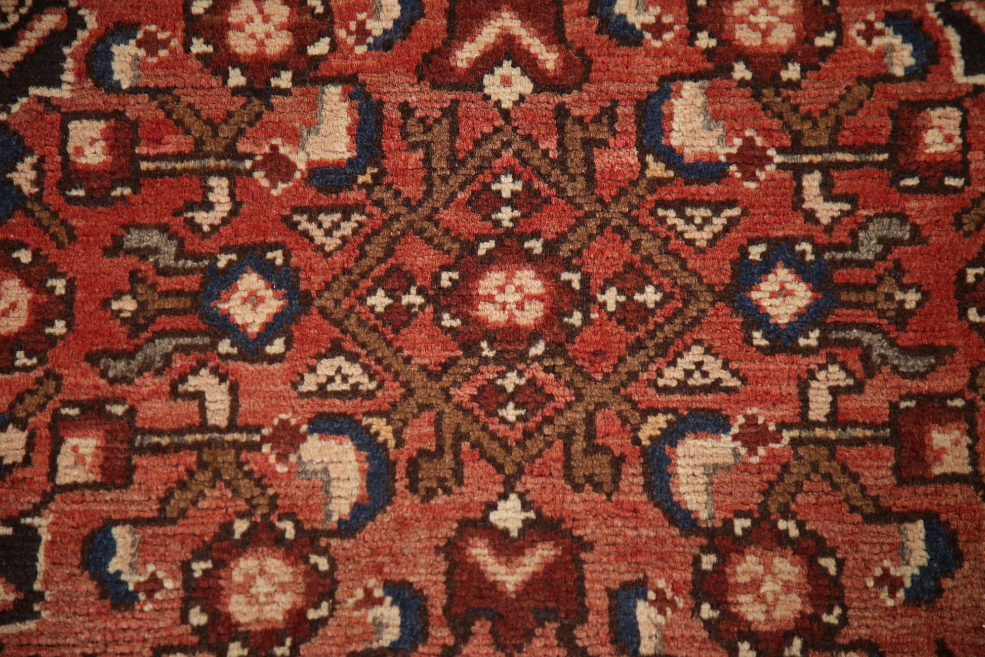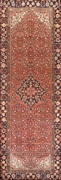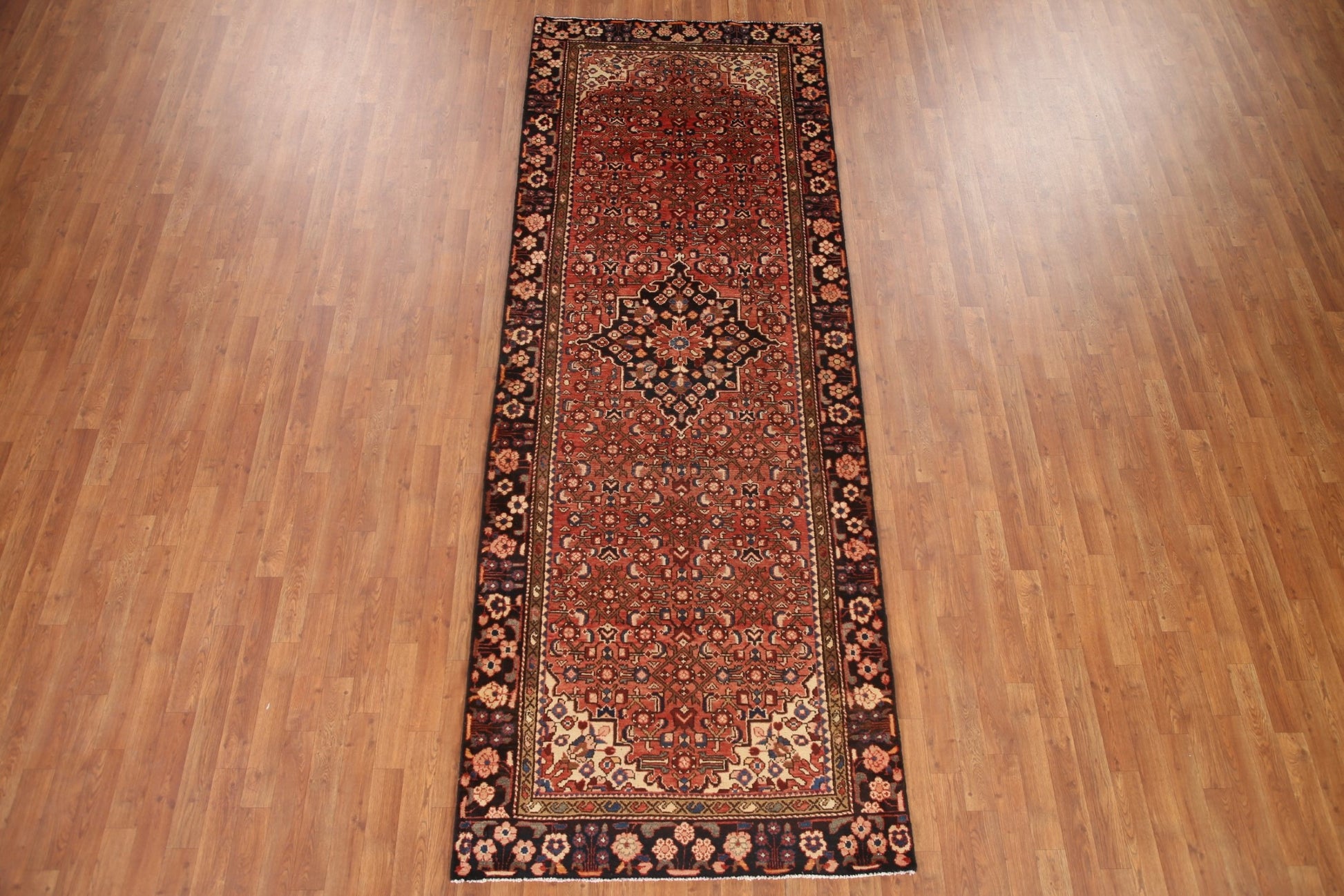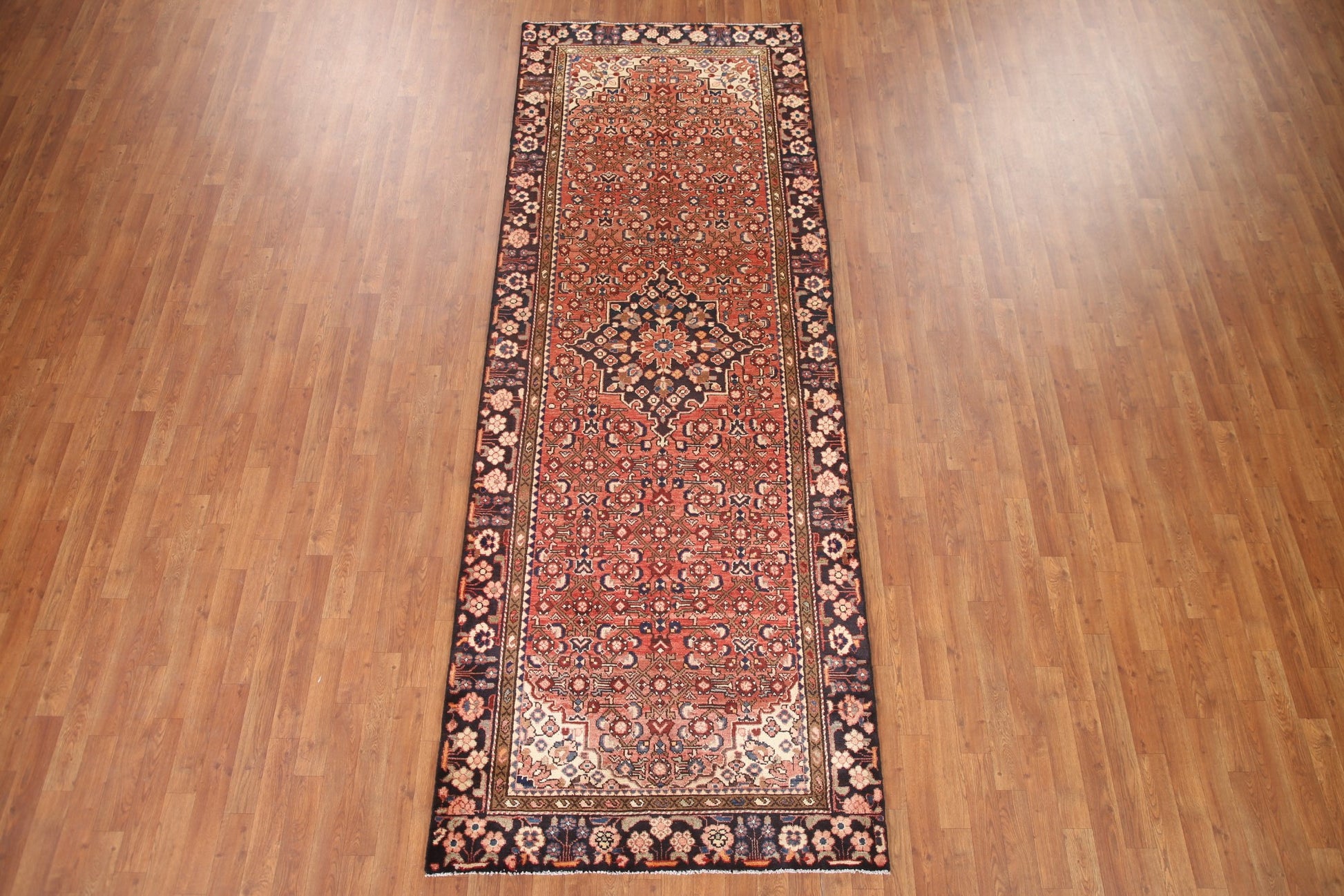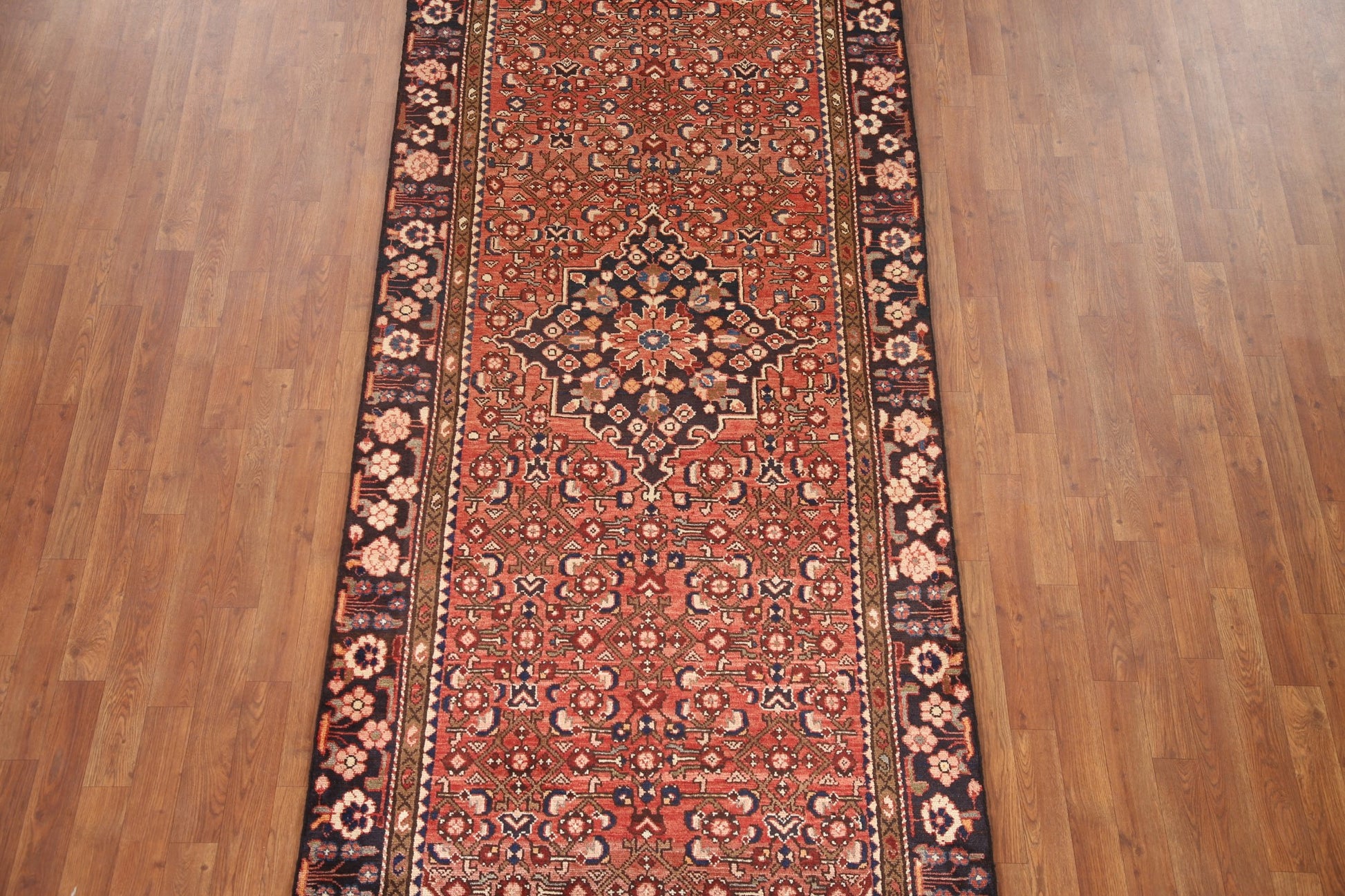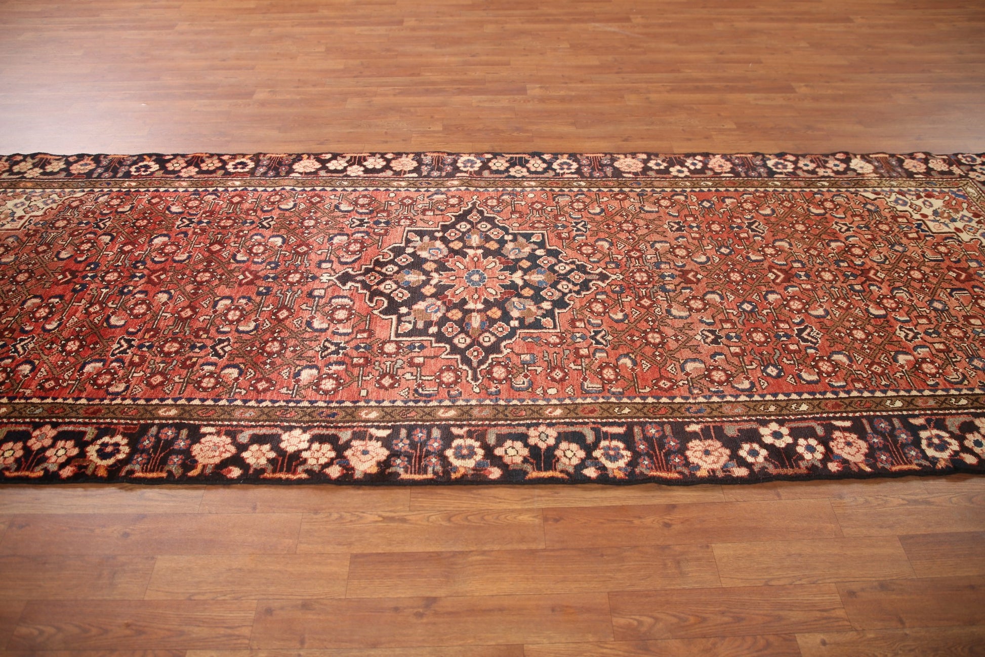 A Beautiful Genuine Persia ( Persia ) Hamedan rug is Hand Knotted by skillful weavers in Persia ( Persia ) with 100% Wool Material. This rug is in Very Good (Abrash) condition. dimensions are 11' 0'' X 4' 0'' in foot and 335 X 122 in centimeter. the primary color is Red.
