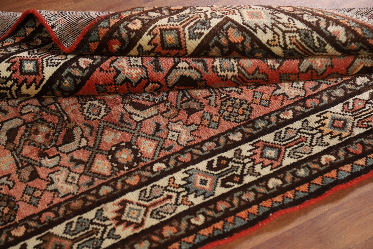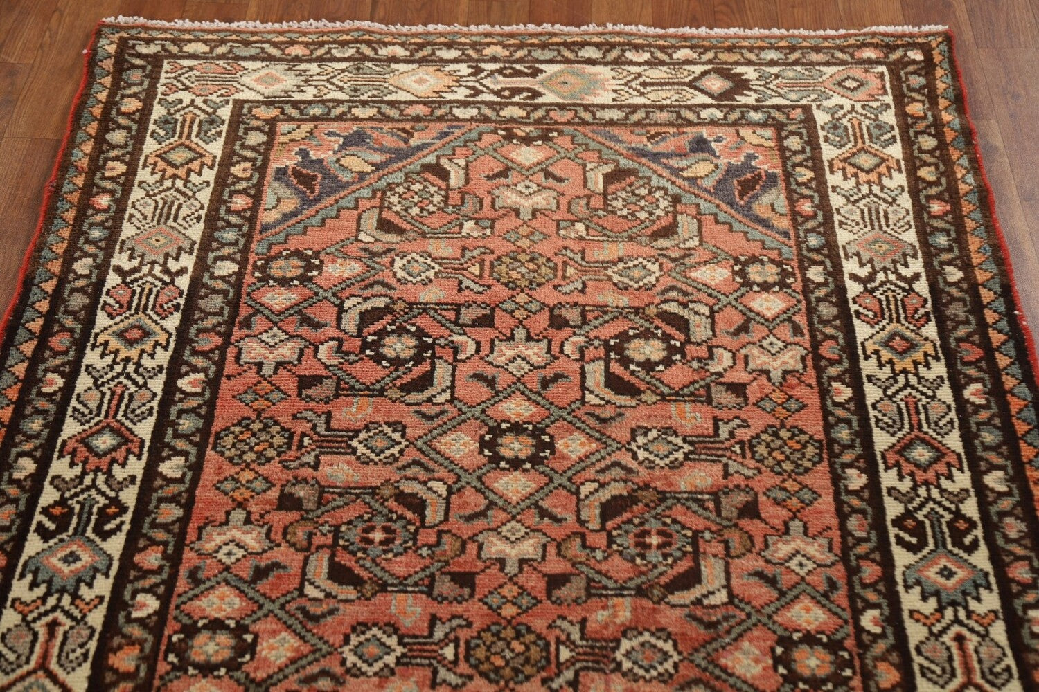 A Beautiful Genuine Persia ( Persia ) Hamedan rug is Hand Knotted by skillful weavers in Persia ( Persia ) with 100% Wool Material. This rug is in Very Good condition. dimensions are 10' 8'' X 3' 6'' in foot and 325 X 107 in centimeter. the primary color is Pink.