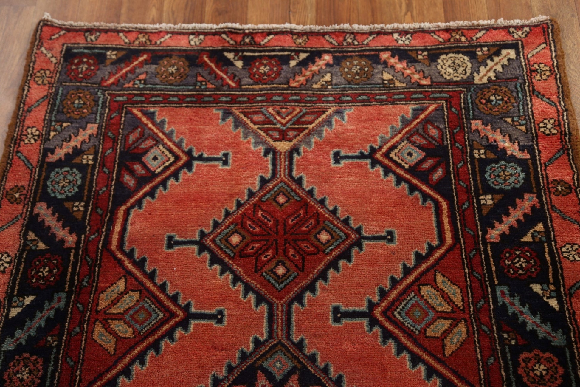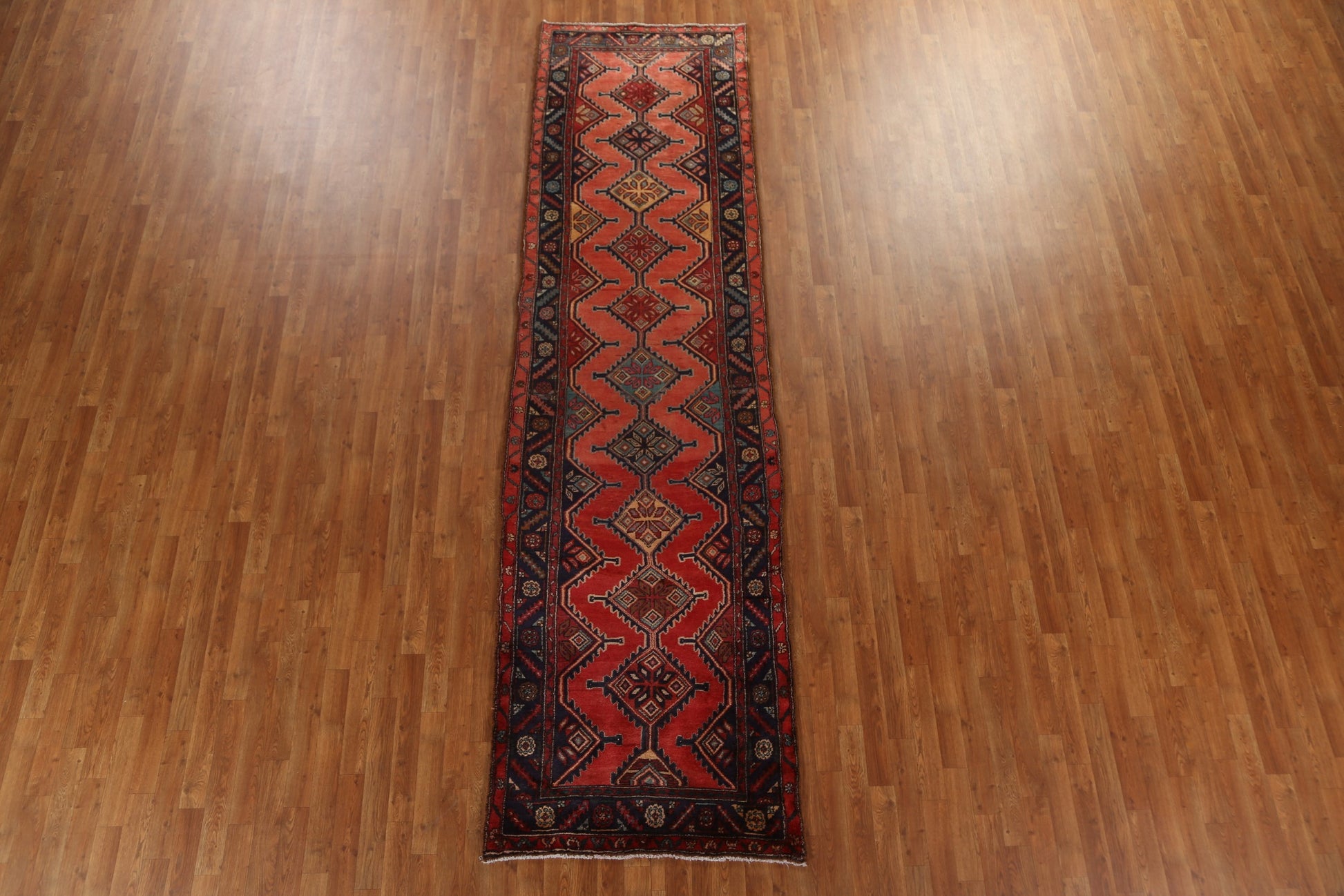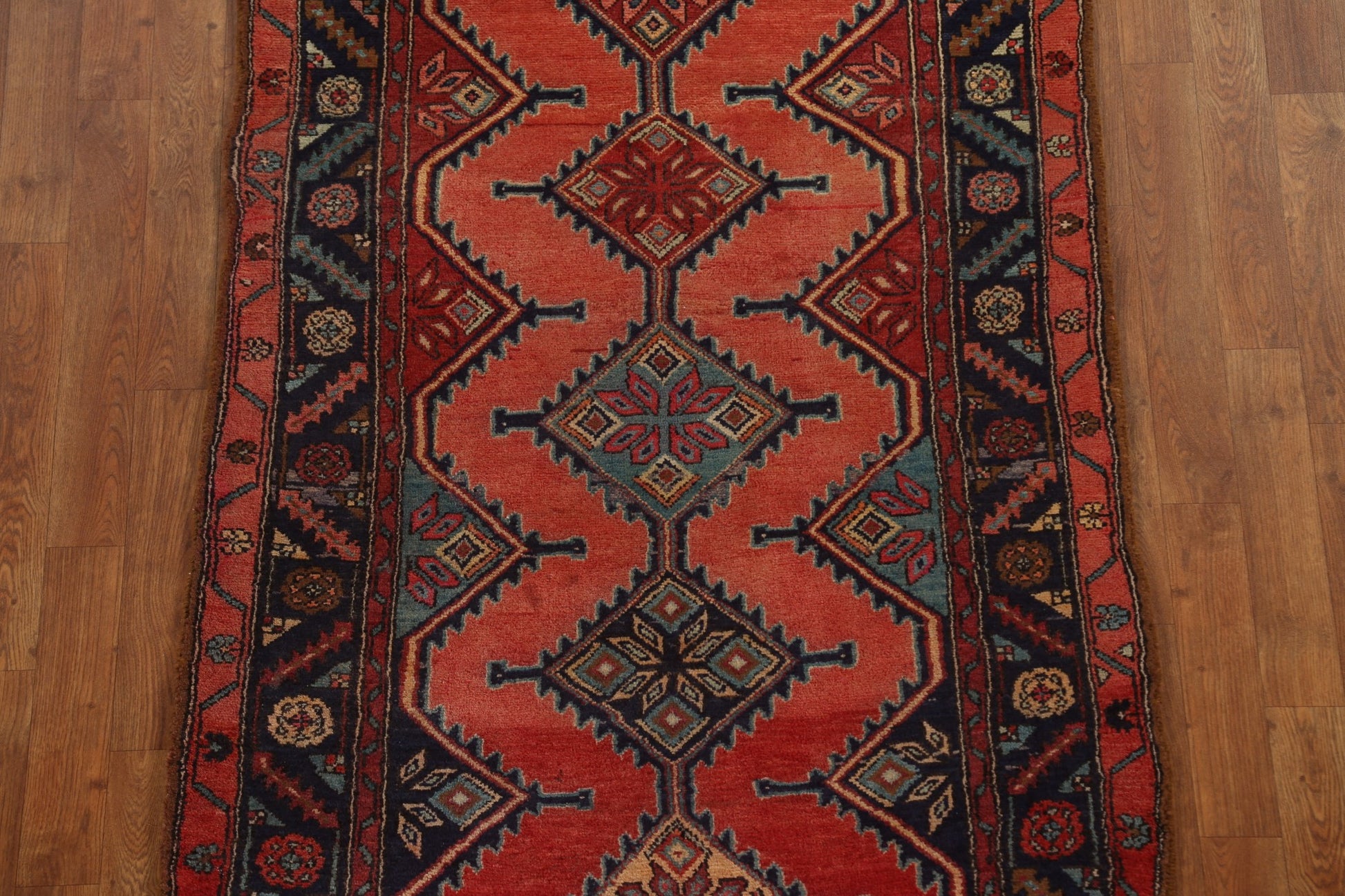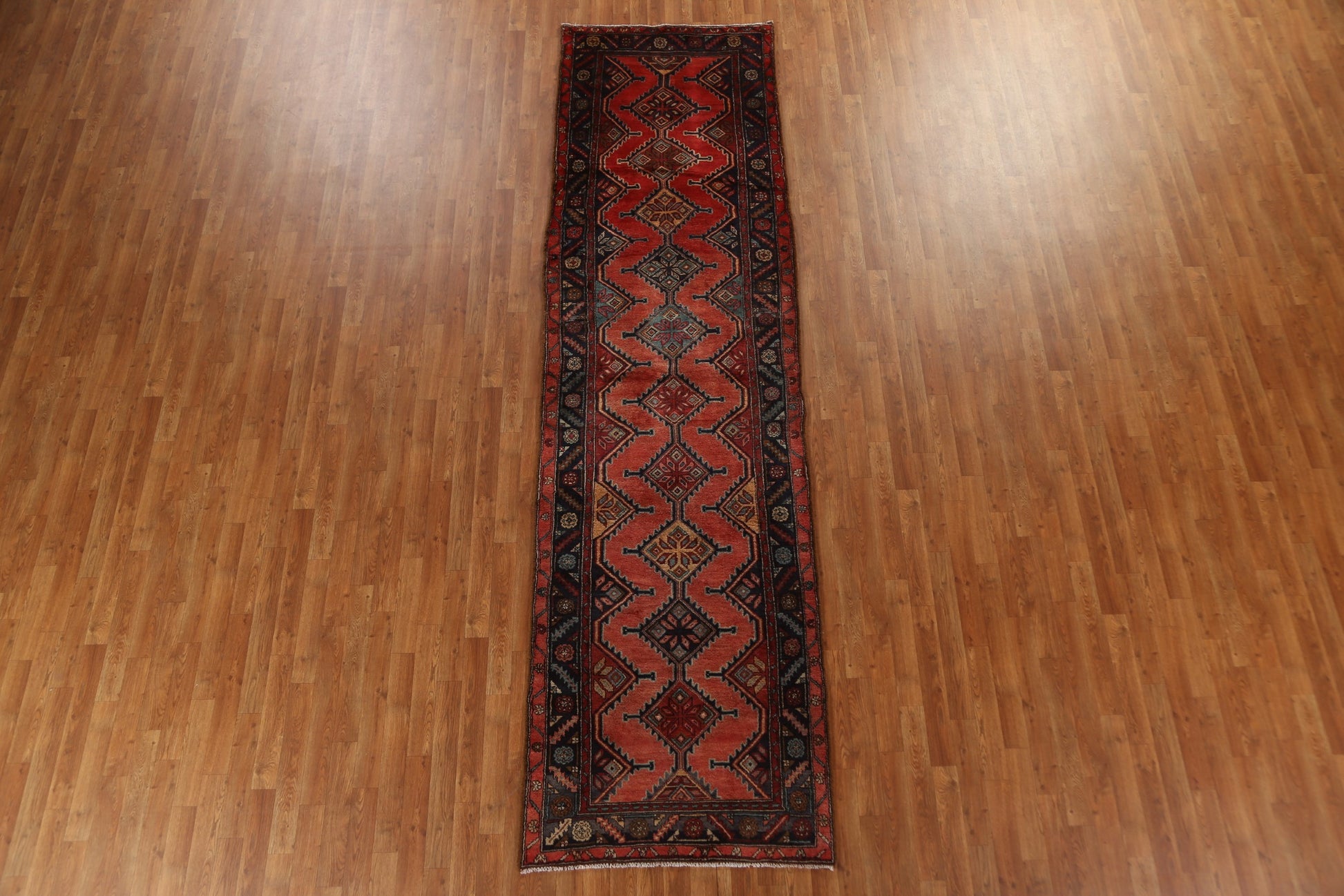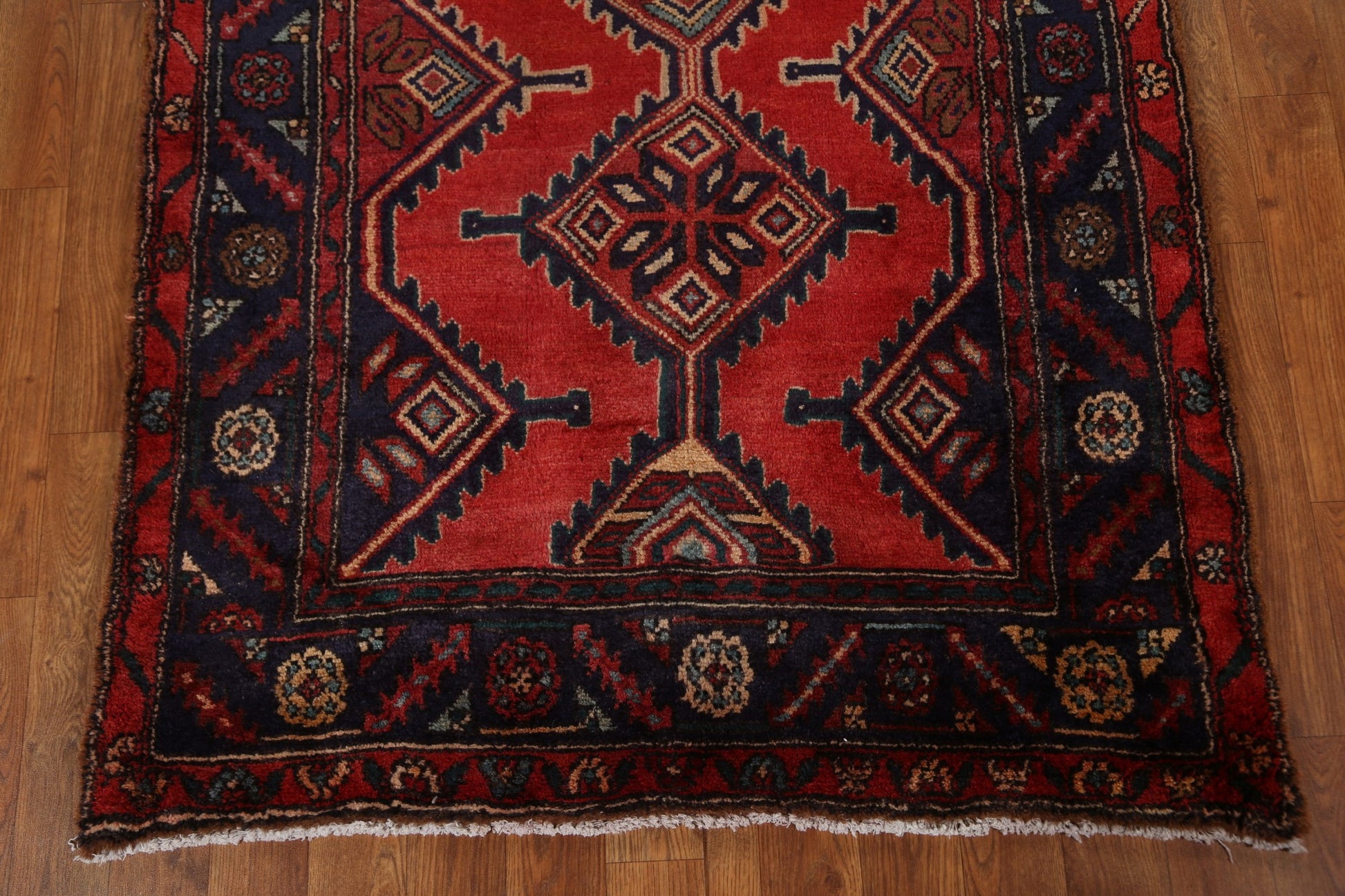 A Beautiful Genuine Persia ( Persia ) Hamedan rug is Hand Knotted by skillful weavers in Persia ( Persia ) with 100% Wool Material. This rug is in Very Good condition. dimensions are 12' 3'' X 3' 6'' in foot and 373 X 107 in centimeter. the primary color is Red.