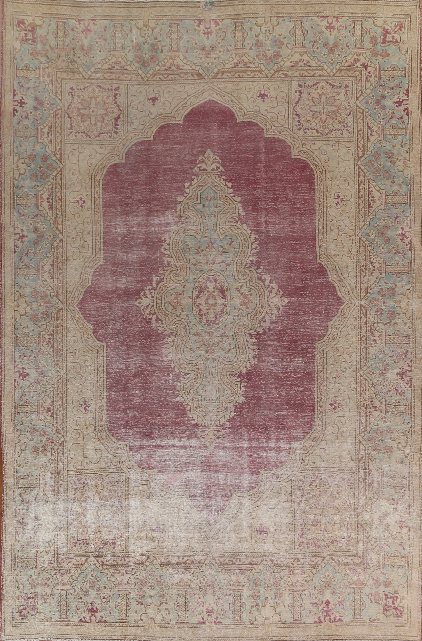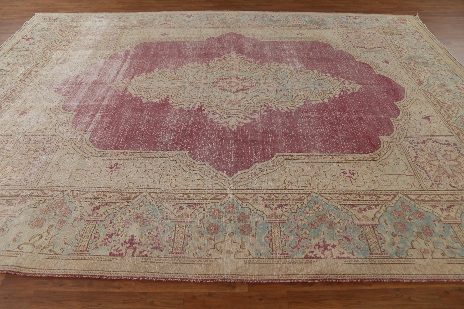 A Beautiful Genuine Persia ( Persia ) Kerman rug is Hand Knotted by skillful weavers in Persia ( Persia ) with 100% Wool Material. This rug is in Very Good (Evenly Low Pile) condition. dimensions are 13' 0'' X 9' 7'' in foot and 396 X 292 in centimeter. the primary color is Red.
