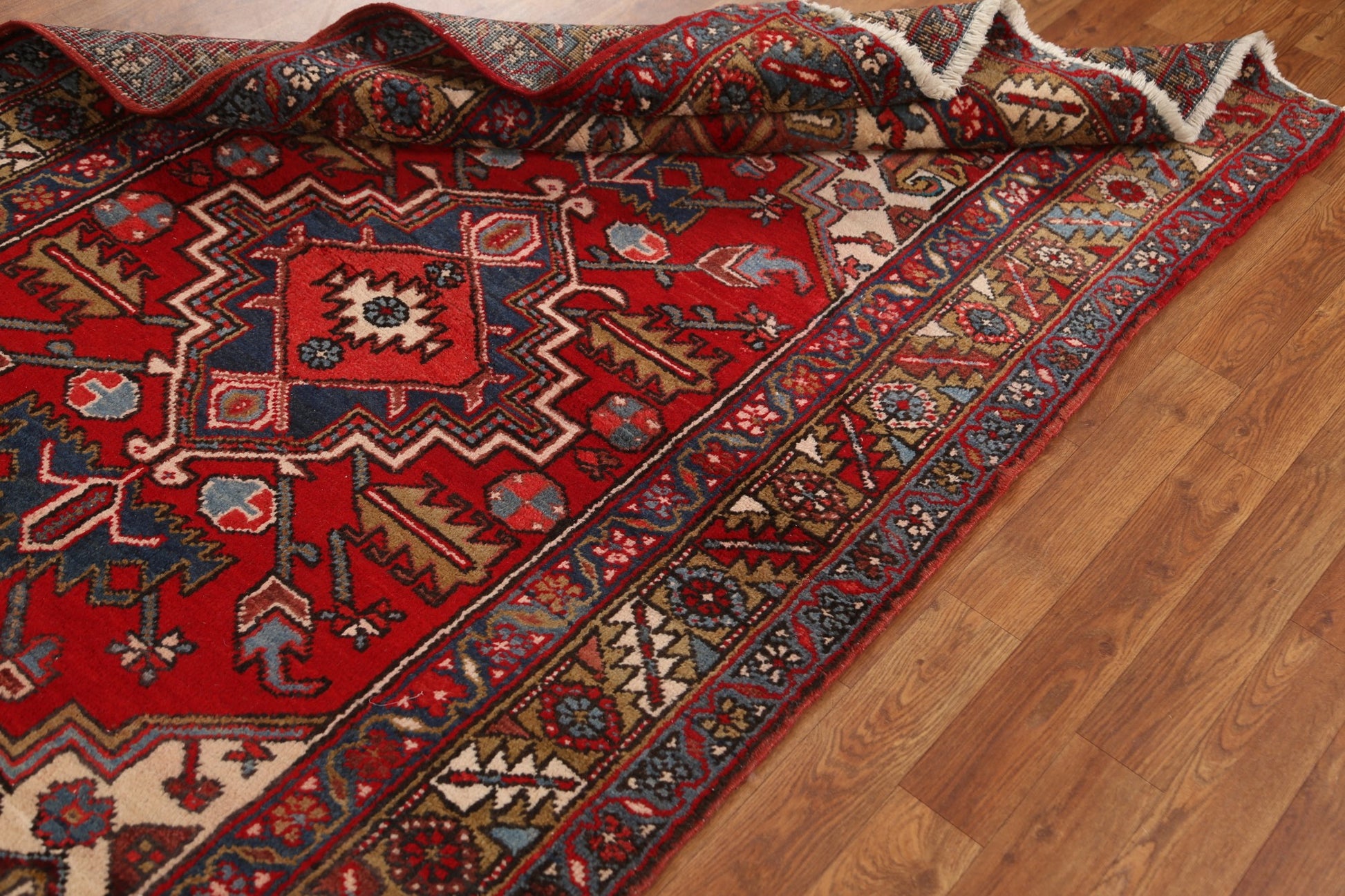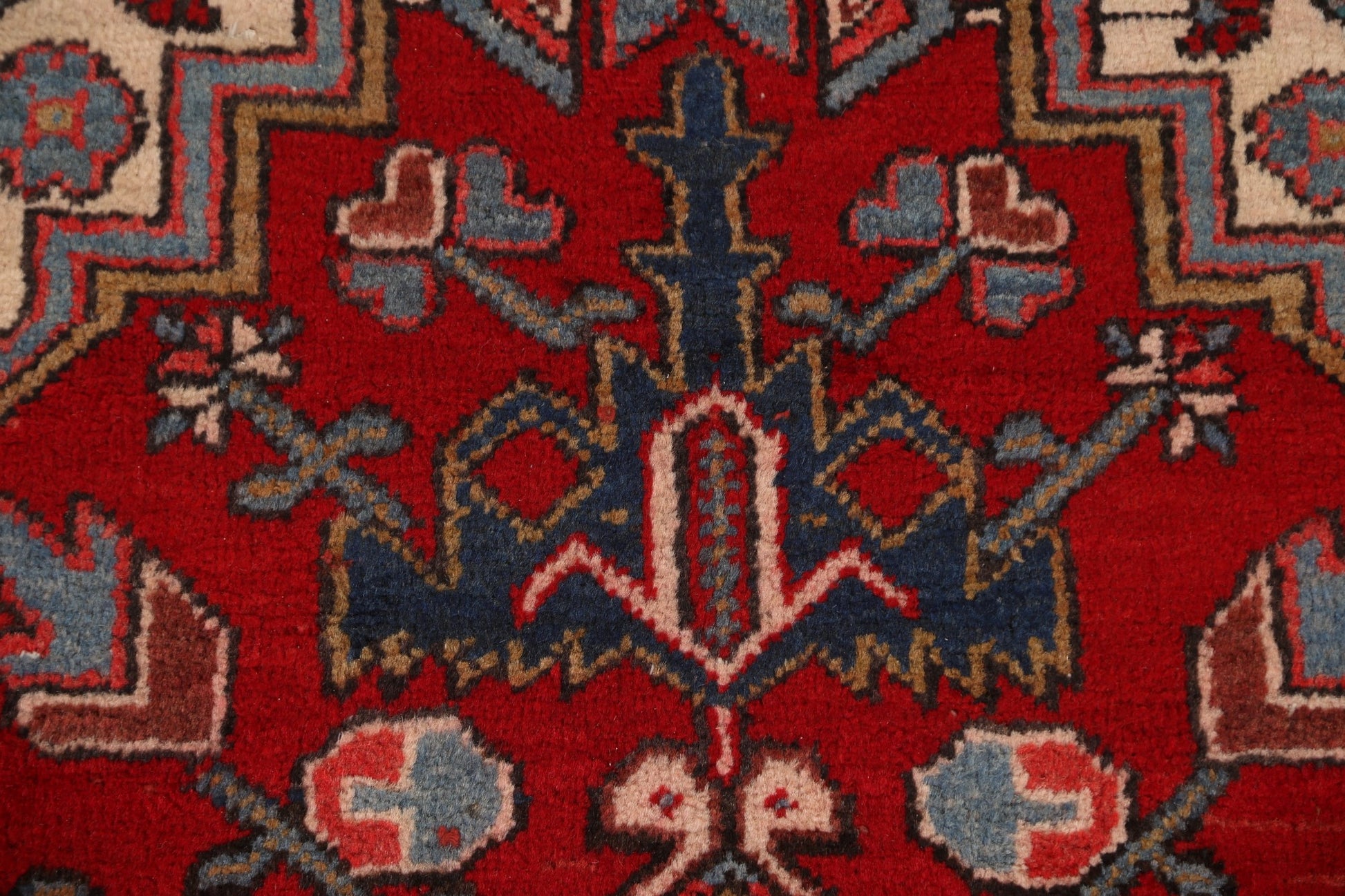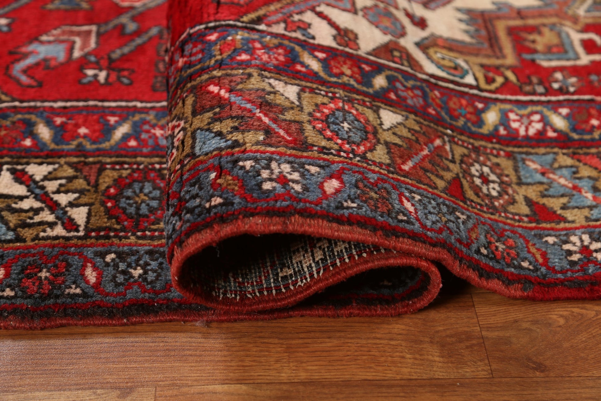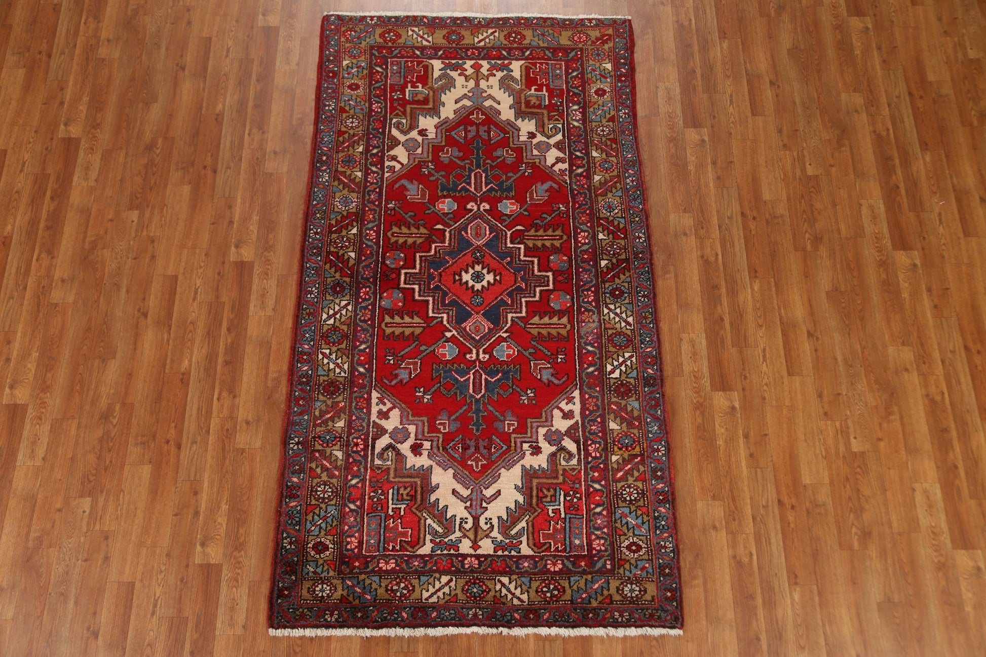 A Beautiful Genuine Persia ( Persia ) Heriz rug is Hand Knotted by skillful weavers in Persia ( Persia ) with 100% Wool Material. This rug is in Very Good (Small Bleeding) condition. dimensions are 7' 3'' X 3' 10'' in foot and 221 X 117 in centimeter. the primary color is Red.