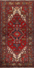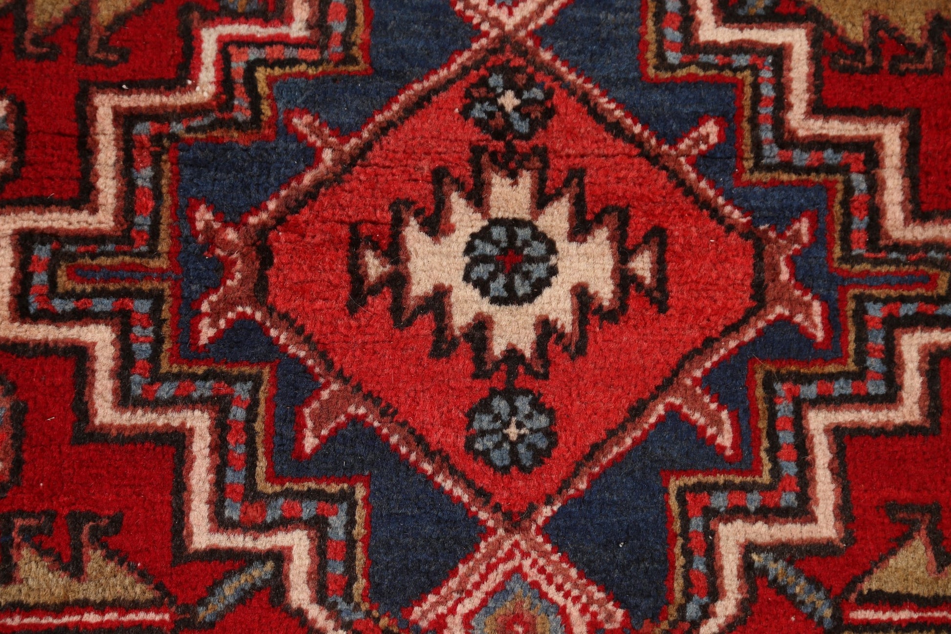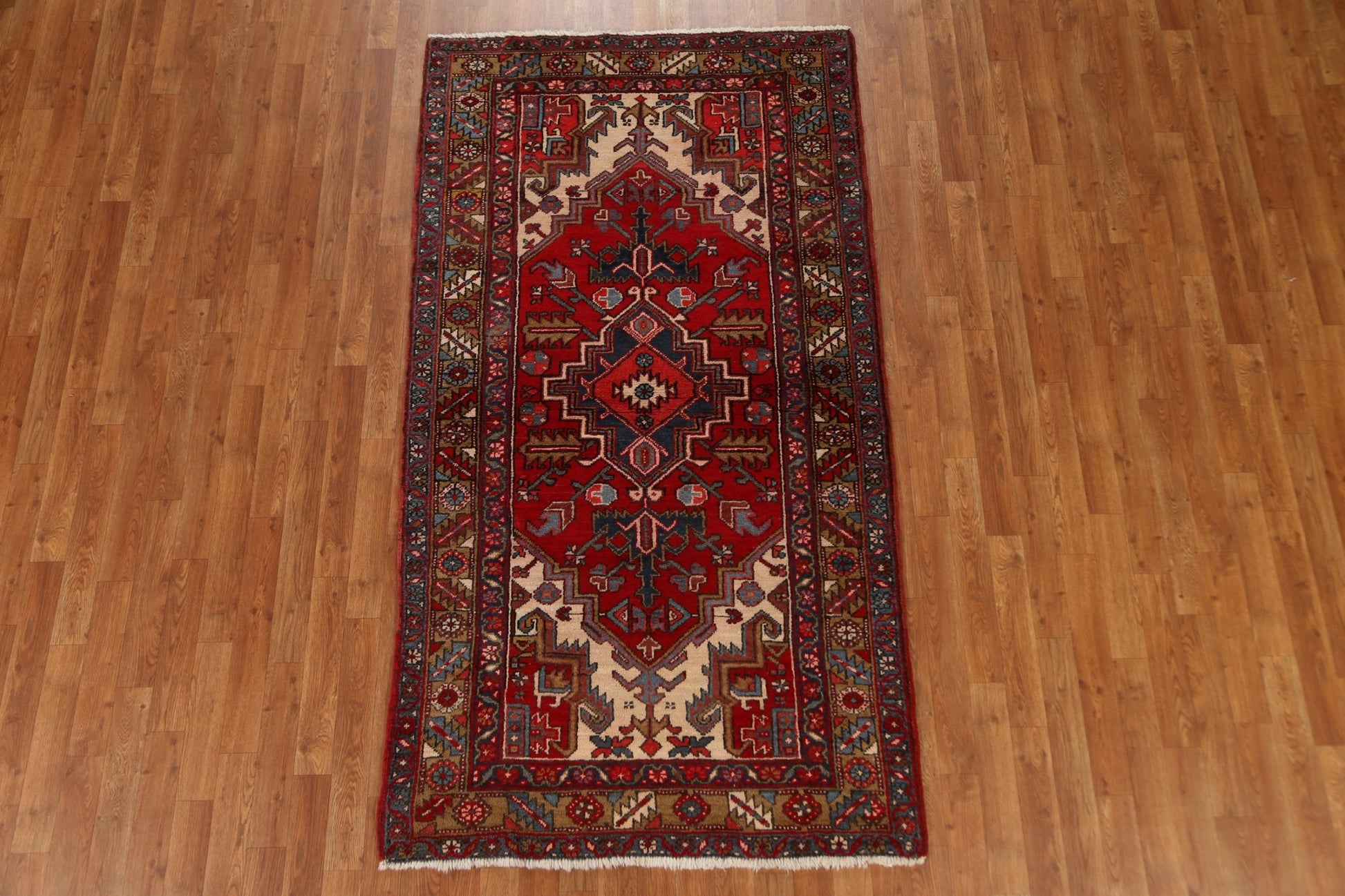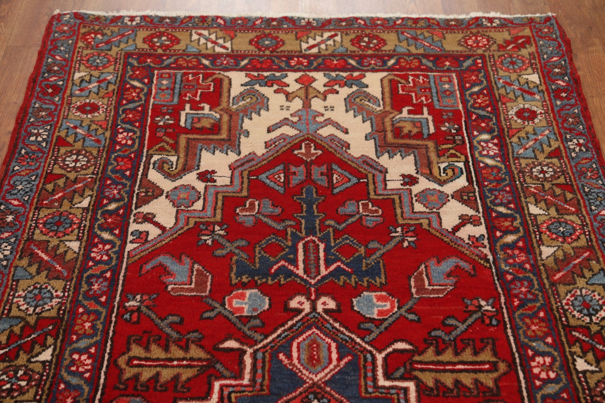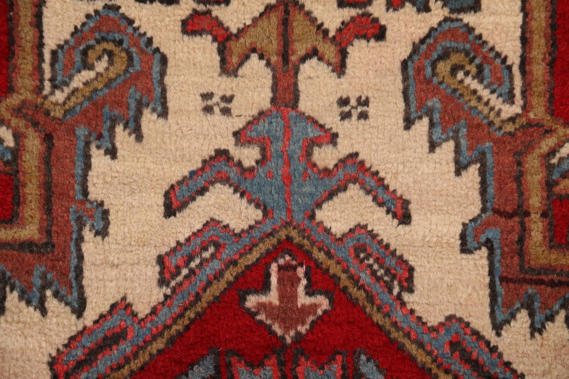 A Beautiful Genuine Persia ( Persia ) Heriz rug is Hand Knotted by skillful weavers in Persia ( Persia ) with 100% Wool Material. This rug is in Very Good (Small Bleeding) condition. dimensions are 7' 3'' X 3' 10'' in foot and 221 X 117 in centimeter. the primary color is Red.