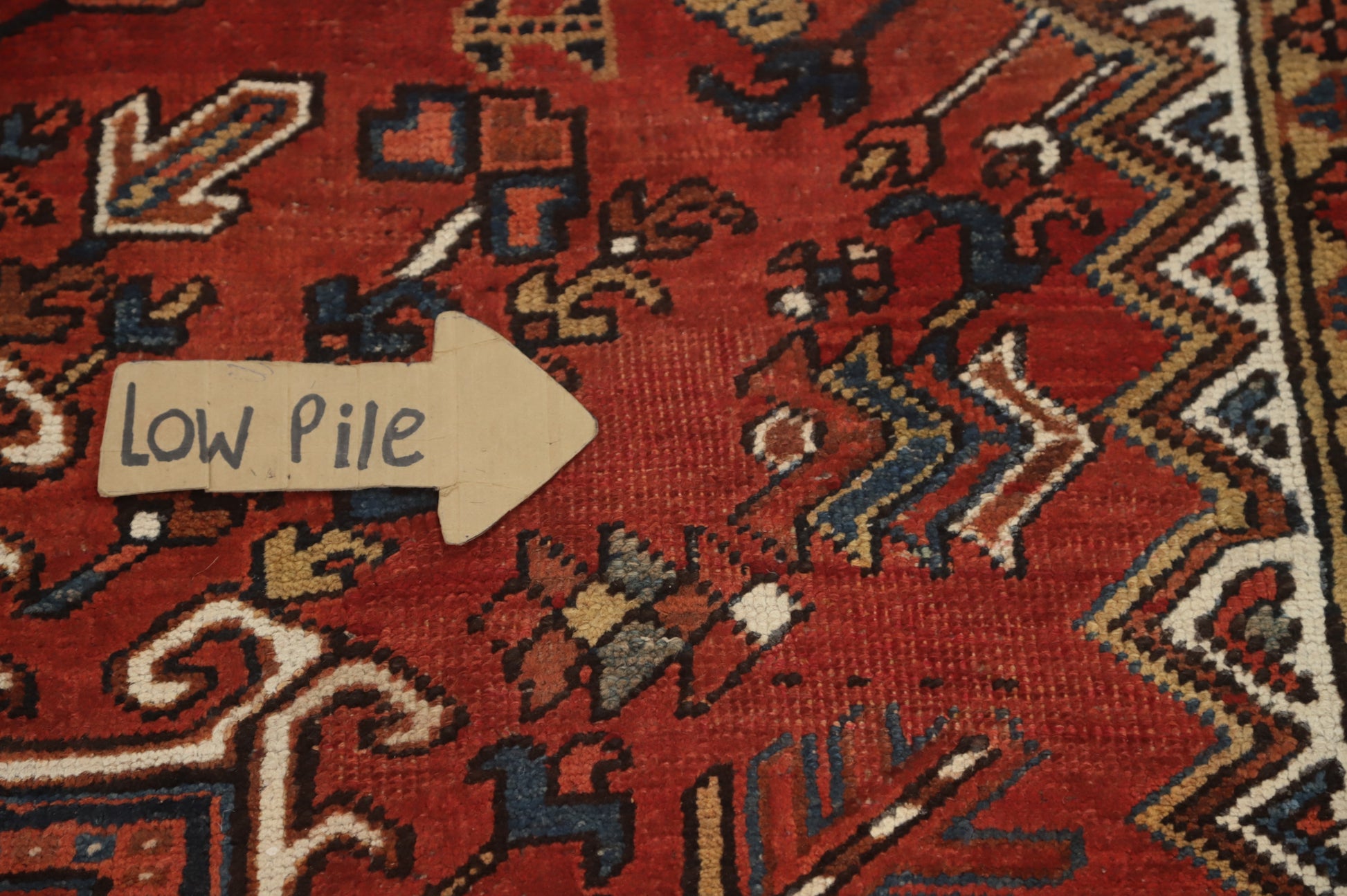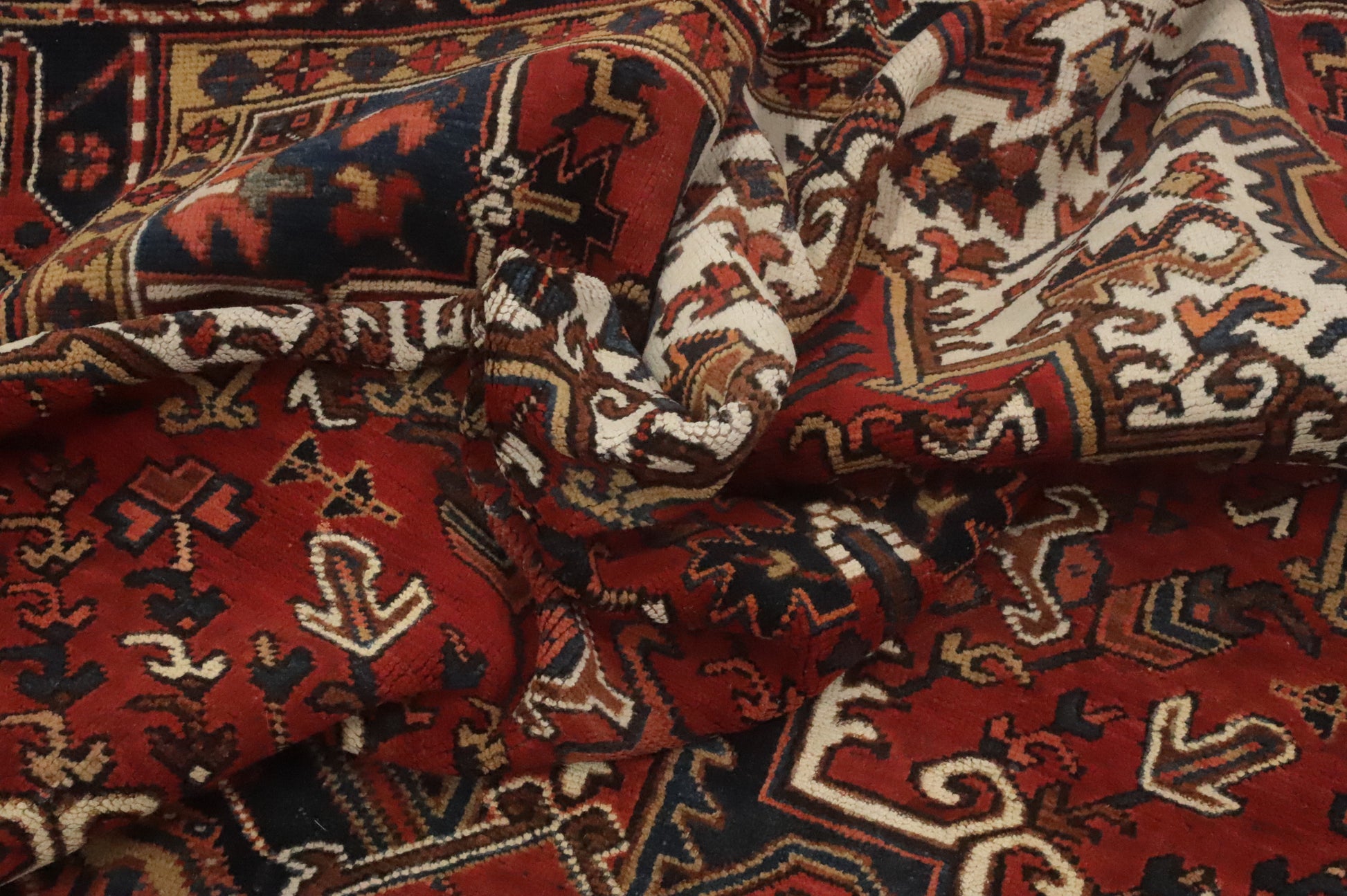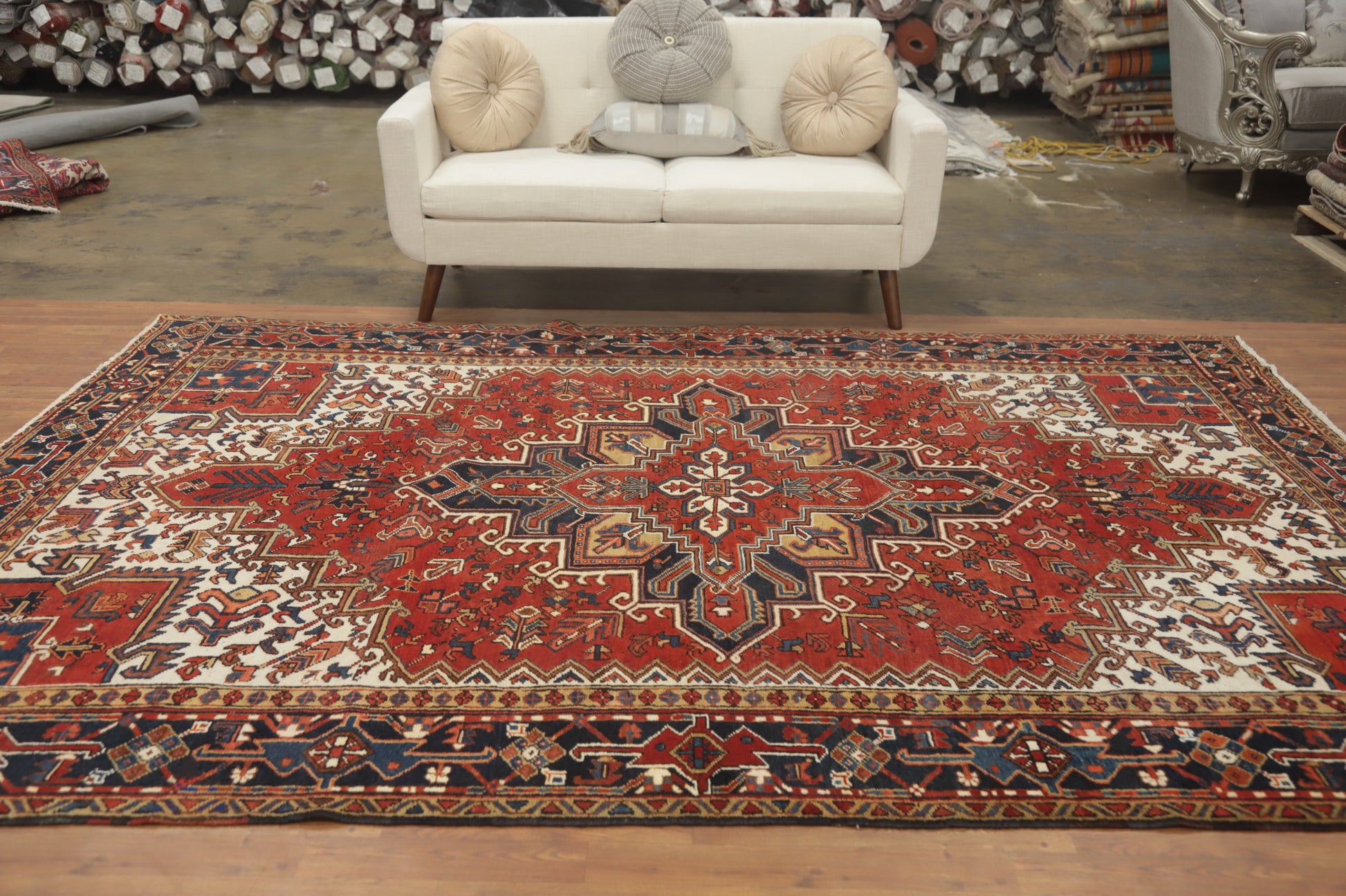 A Beautiful Genuine Persia ( Persia ) Heriz rug is Hand Knotted by skillful weavers in Persia ( Persia ) with 100% Wool Material. This rug is in Very Good ( Low Pile ) condition. dimensions are 10' 8'' X 7' 6'' in foot and 325 X 229 in centimeter. the primary color is Oranges & Rust.