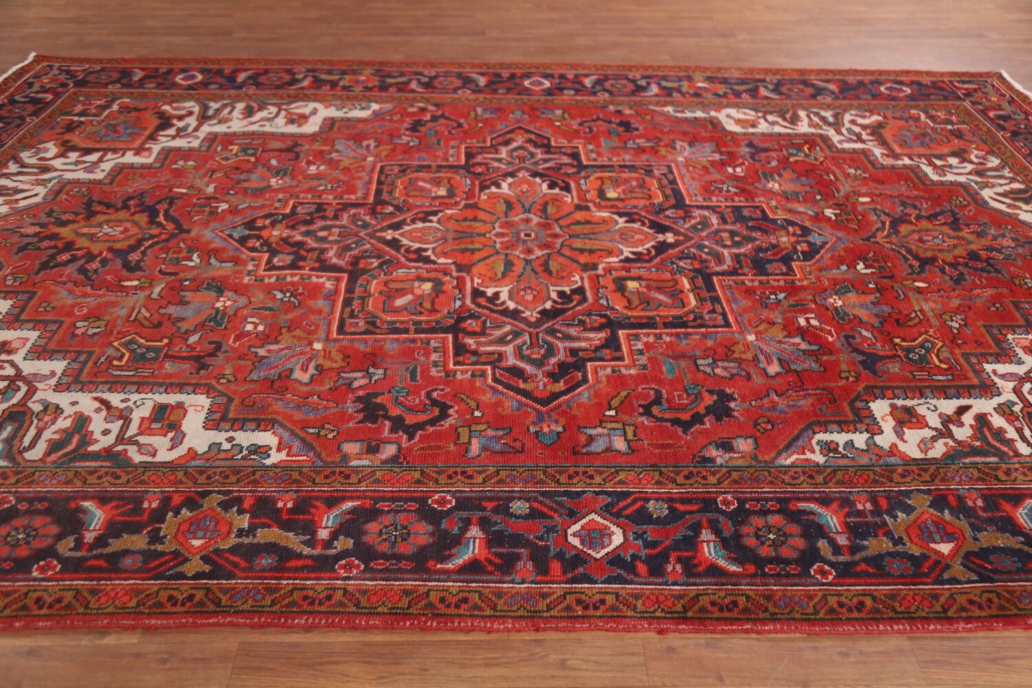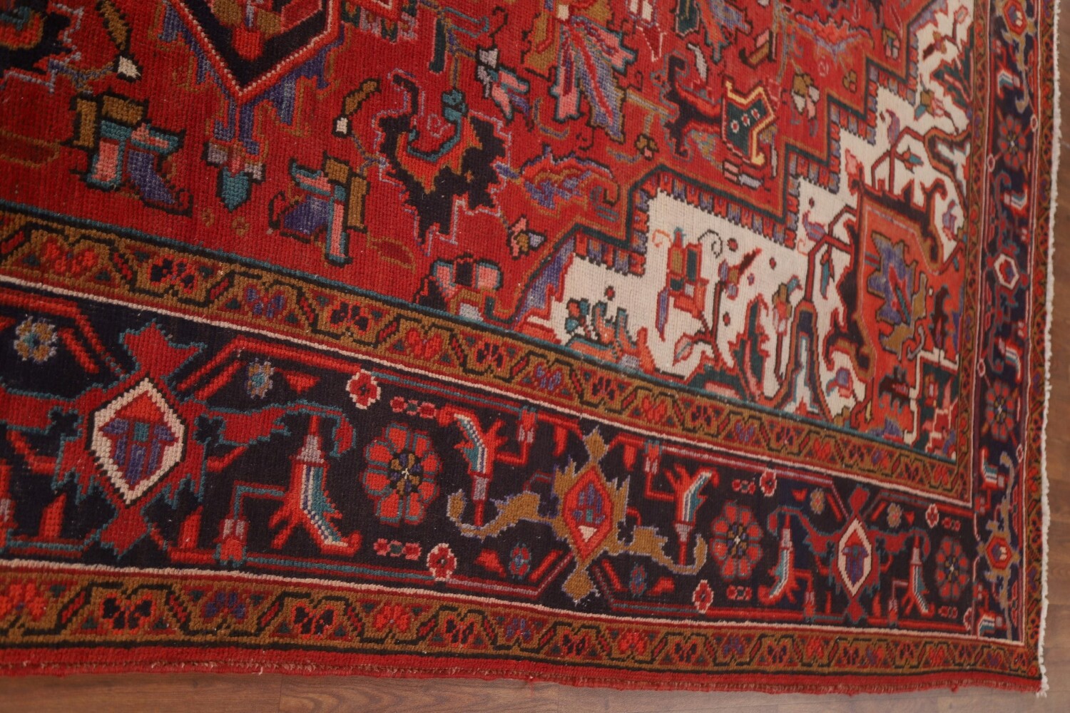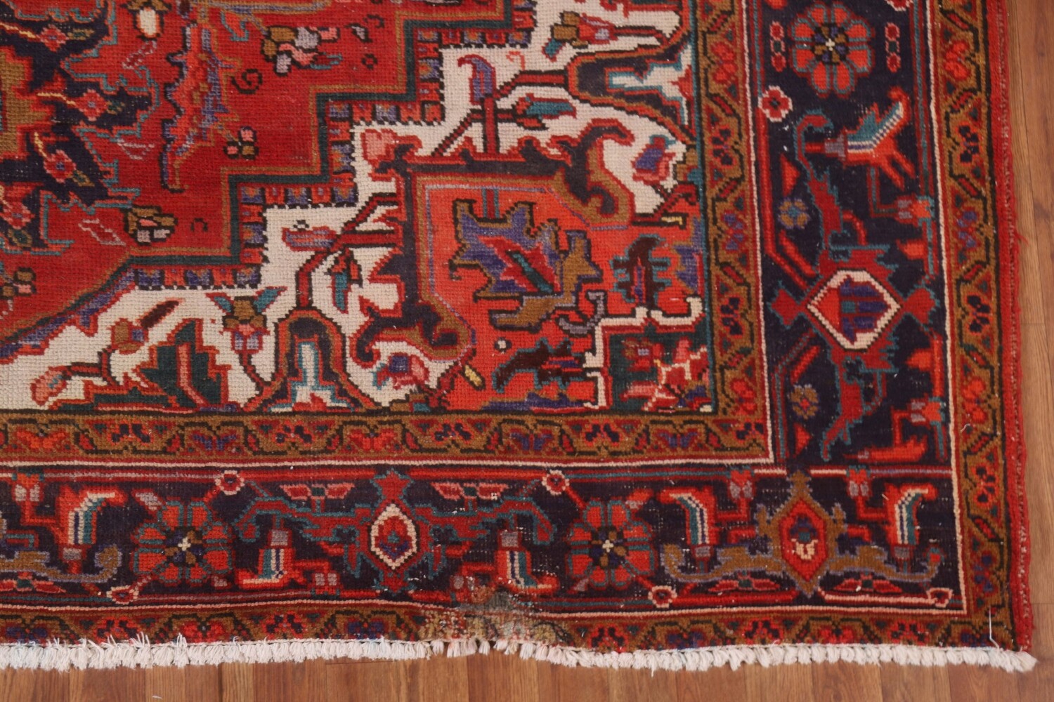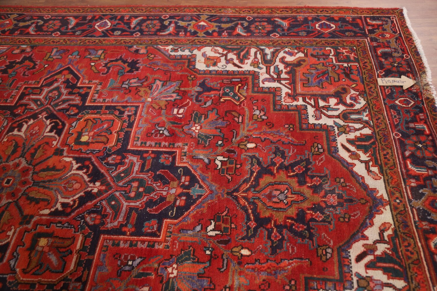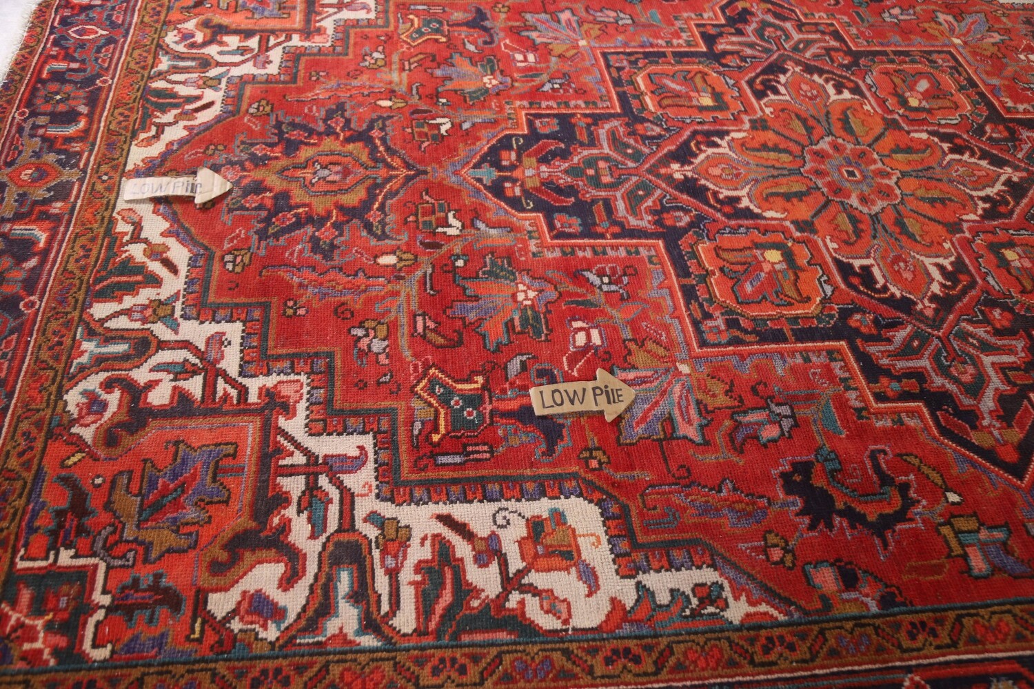 A Beautiful Genuine Persia ( Persia ) Heriz rug is Hand Knotted by skillful weavers in Persia ( Persia ) with 100% Wool Material. This rug is in Very Good (Low Pile-Repair) condition. dimensions are 12' 3'' X 8' 4'' in foot and 373 X 254 in centimeter. the primary color is Red.