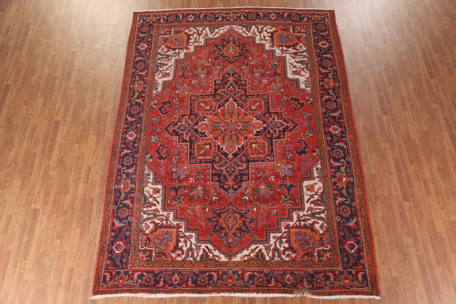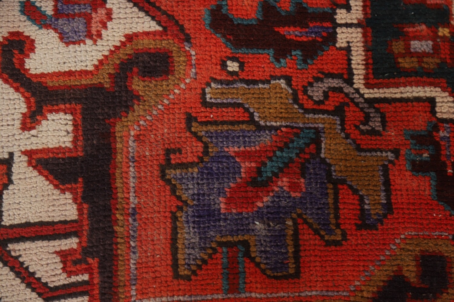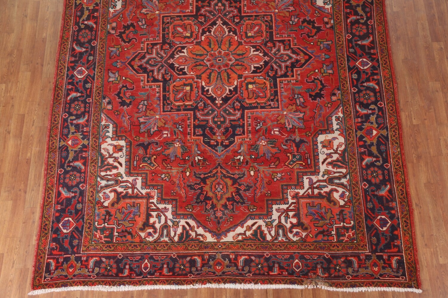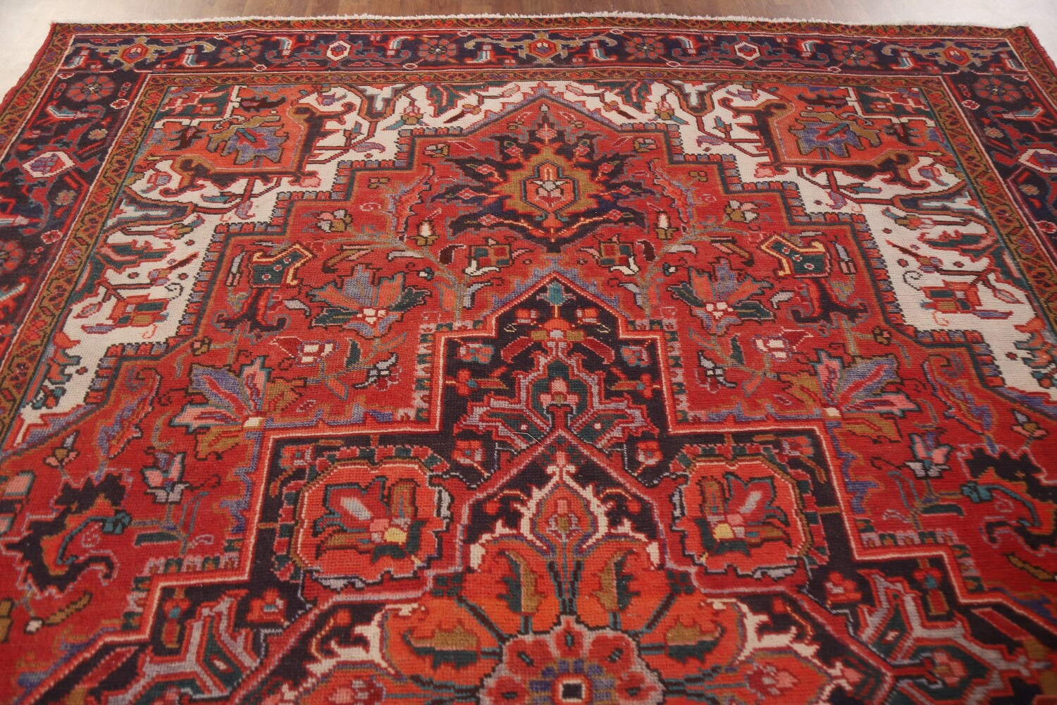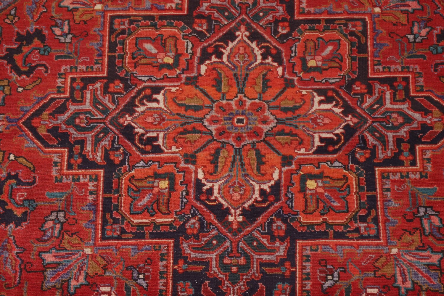 A Beautiful Genuine Persia ( Persia ) Heriz rug is Hand Knotted by skillful weavers in Persia ( Persia ) with 100% Wool Material. This rug is in Very Good (Low Pile-Repair) condition. dimensions are 12' 3'' X 8' 4'' in foot and 373 X 254 in centimeter. the primary color is Red.
