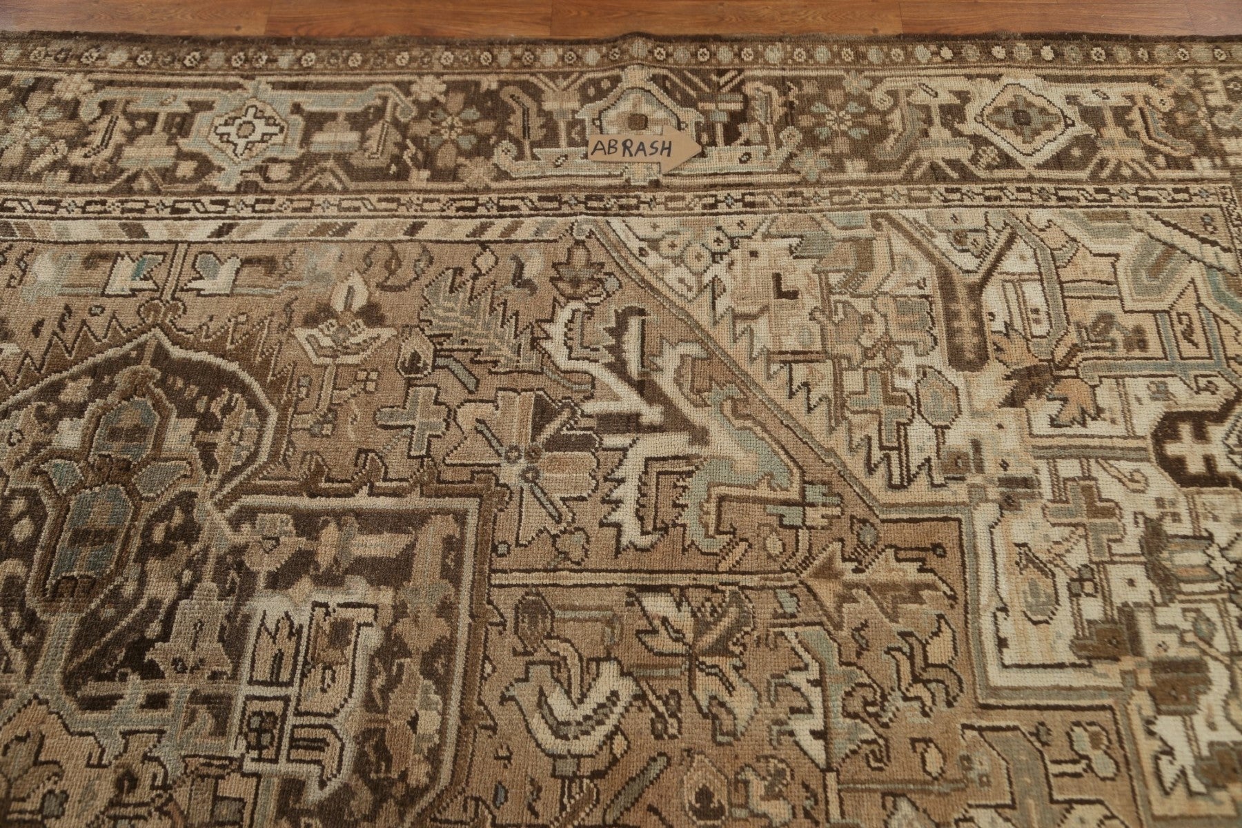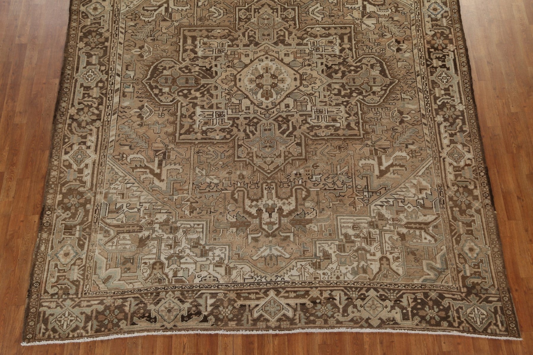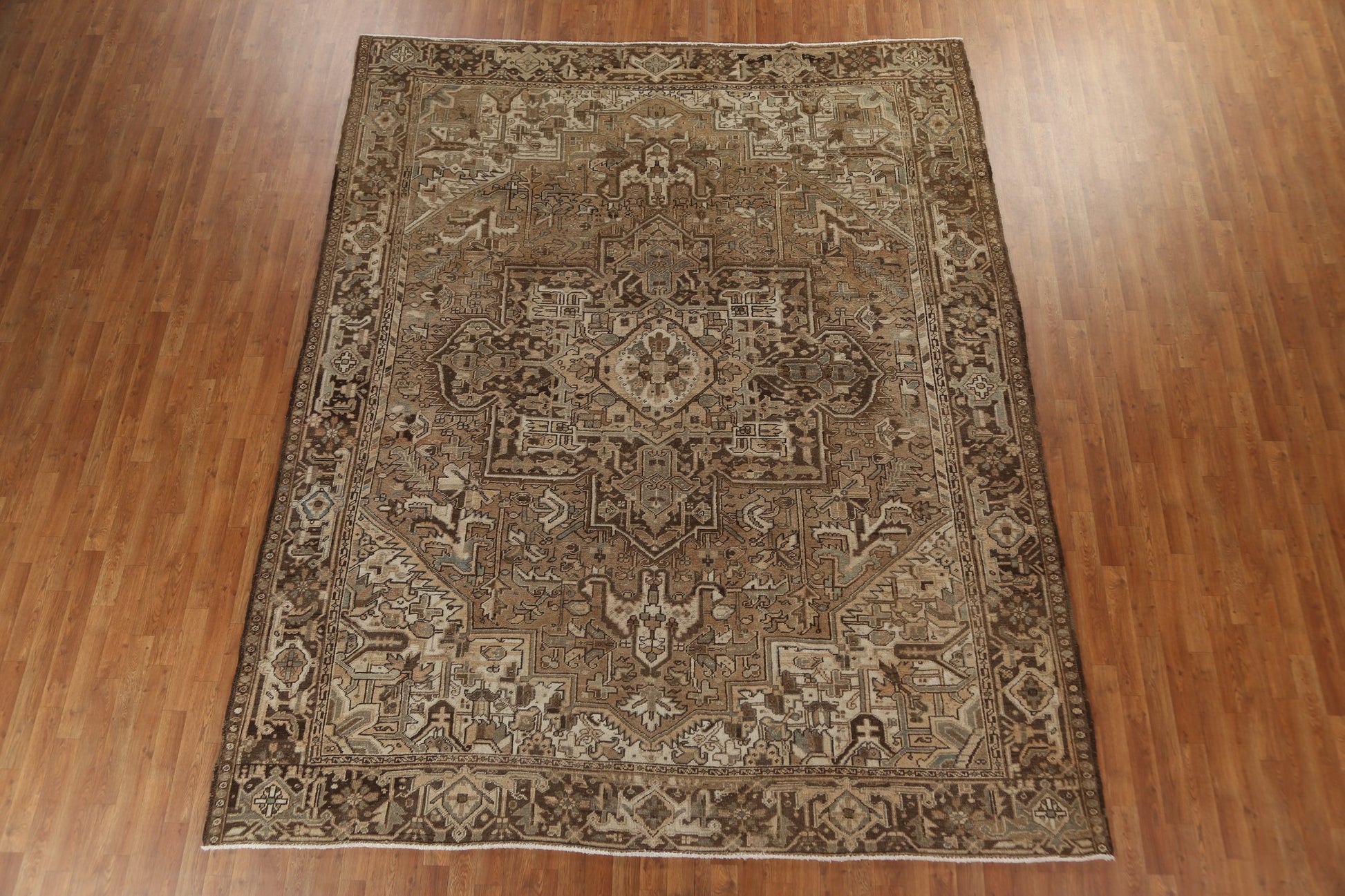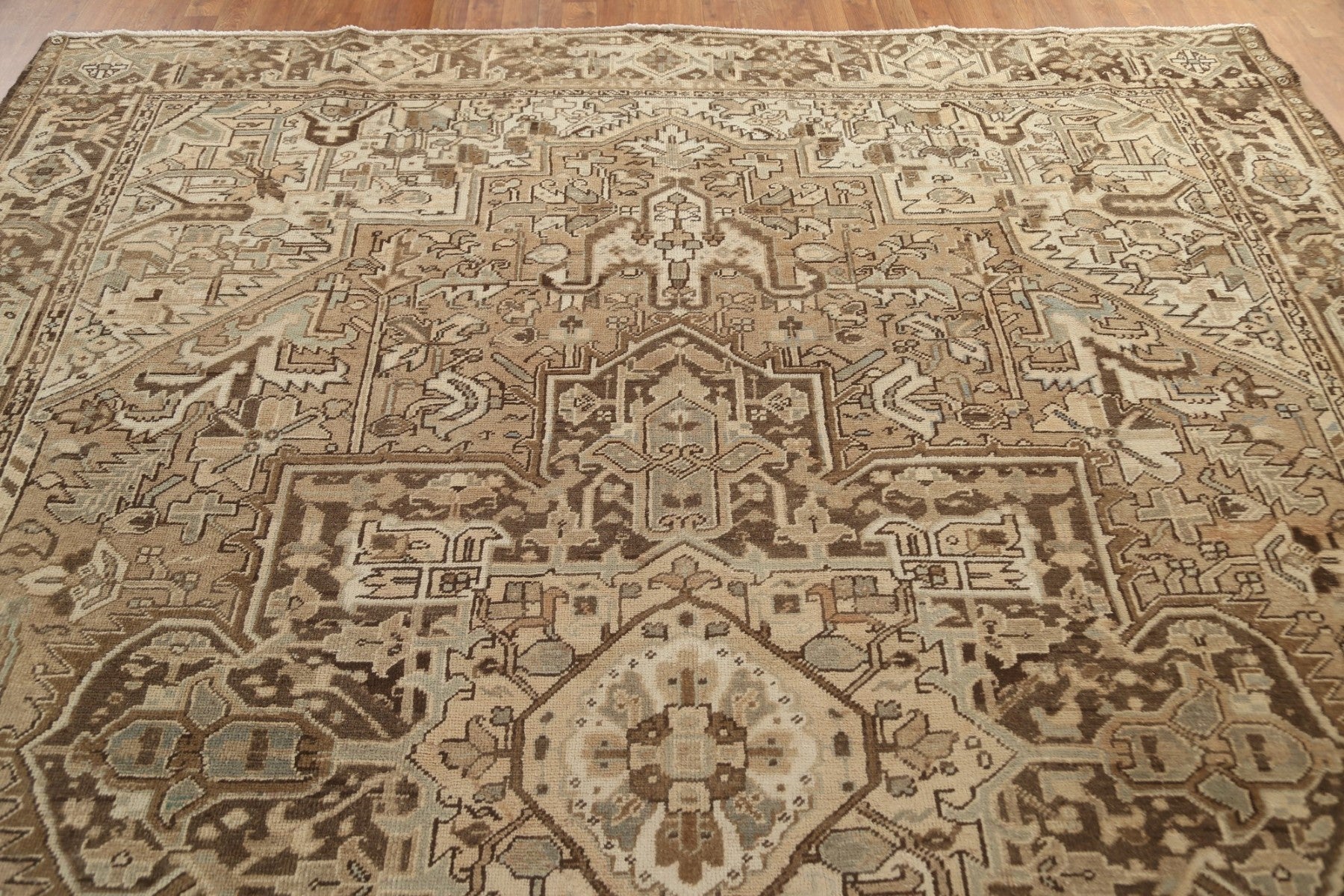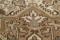 A Beautiful Genuine Persia ( Persia ) Heriz rug is Hand Knotted by skillful weavers in Persia ( Persia ) with 100% Wool Material. This rug is in Very Good (Low Pile-Abrash) condition. dimensions are 11' 2'' X 9' 1'' in foot and 340 X 277 in centimeter. the primary color is Beige & Ivories.