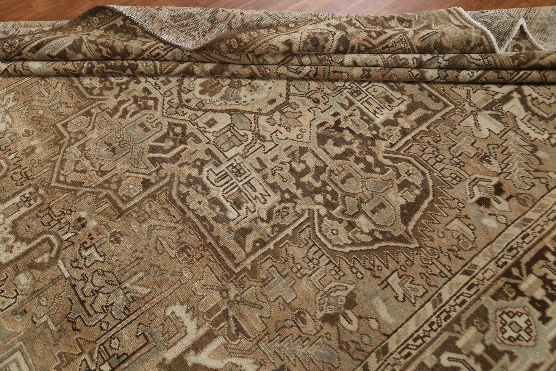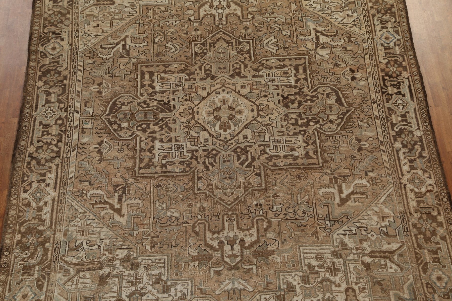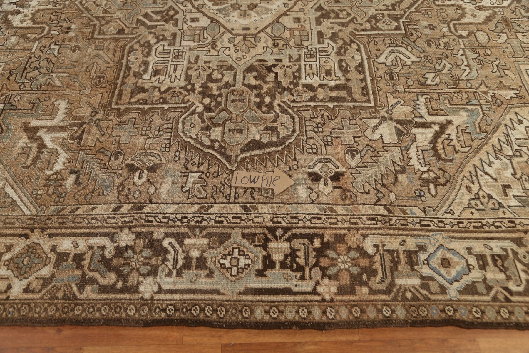 A Beautiful Genuine Persia ( Persia ) Heriz rug is Hand Knotted by skillful weavers in Persia ( Persia ) with 100% Wool Material. This rug is in Very Good (Low Pile-Abrash) condition. dimensions are 11' 2'' X 9' 1'' in foot and 340 X 277 in centimeter. the primary color is Beige & Ivories.