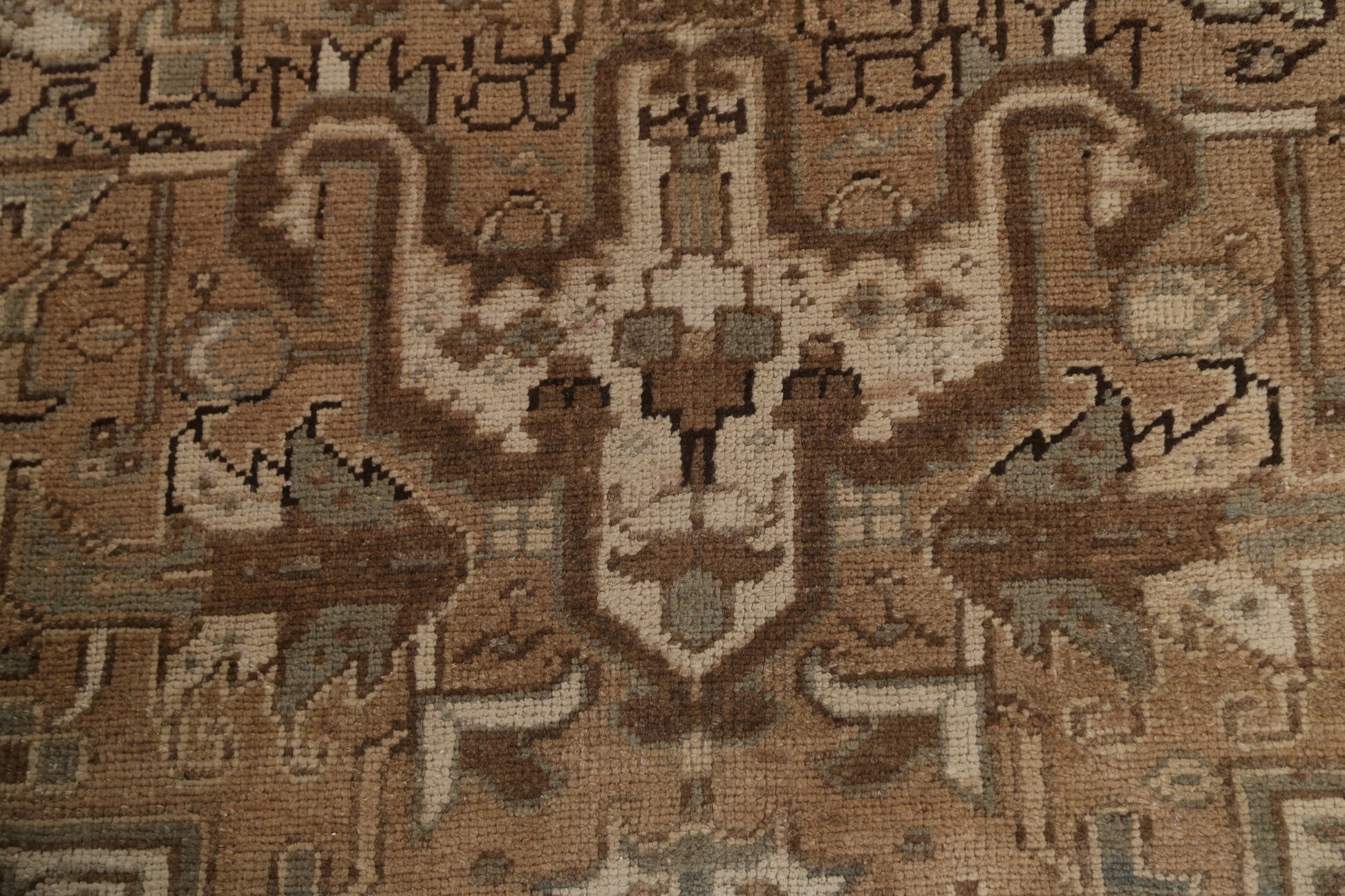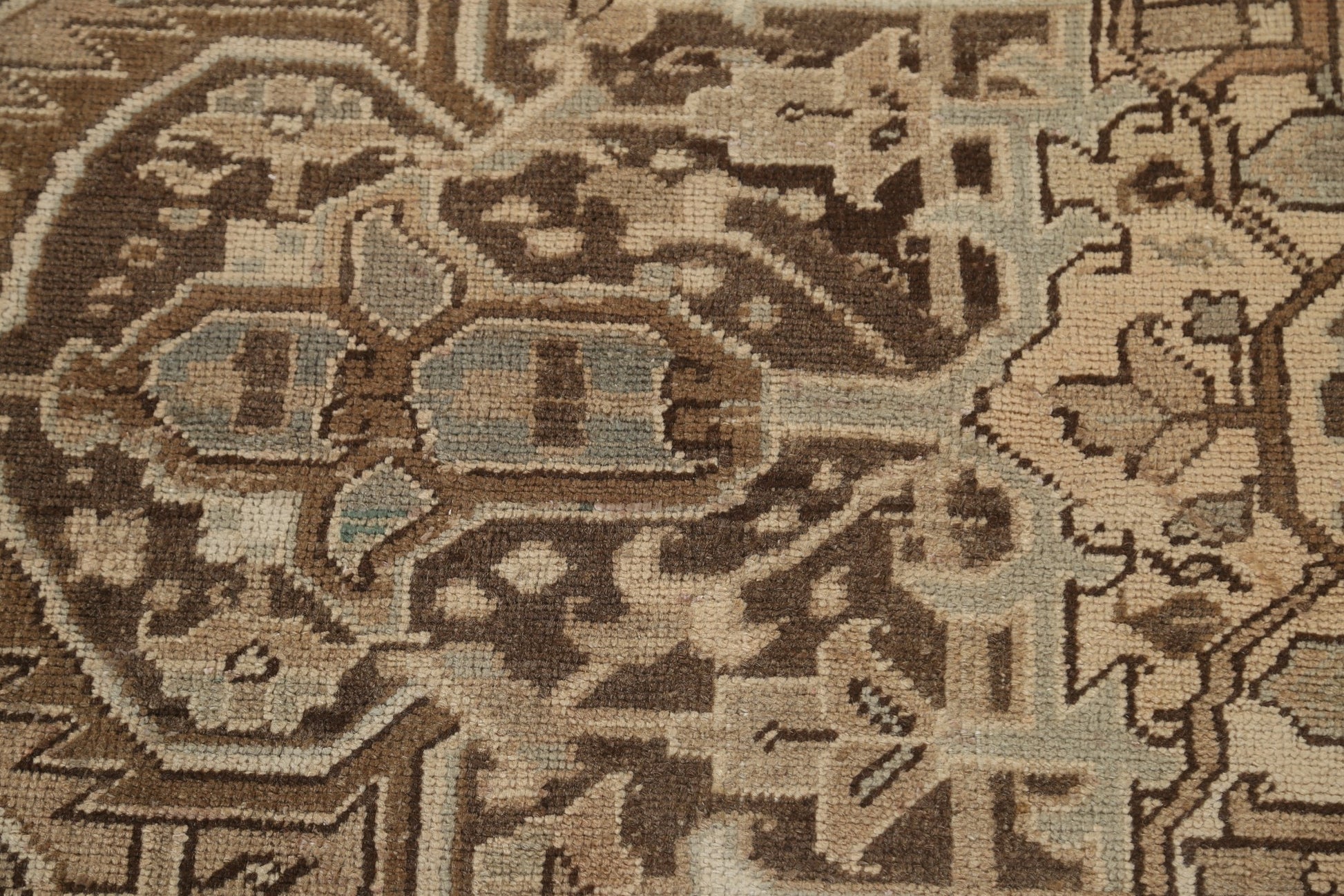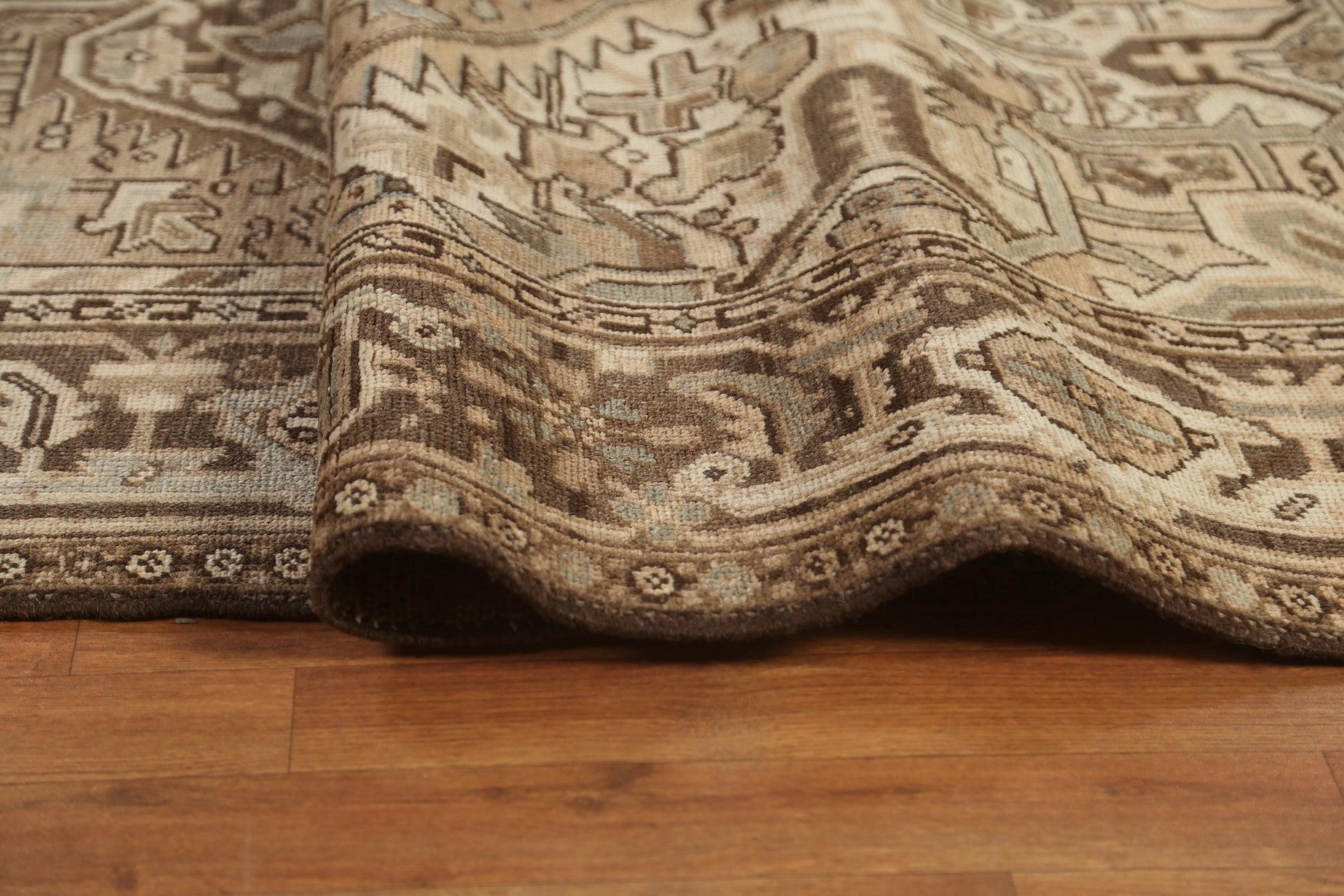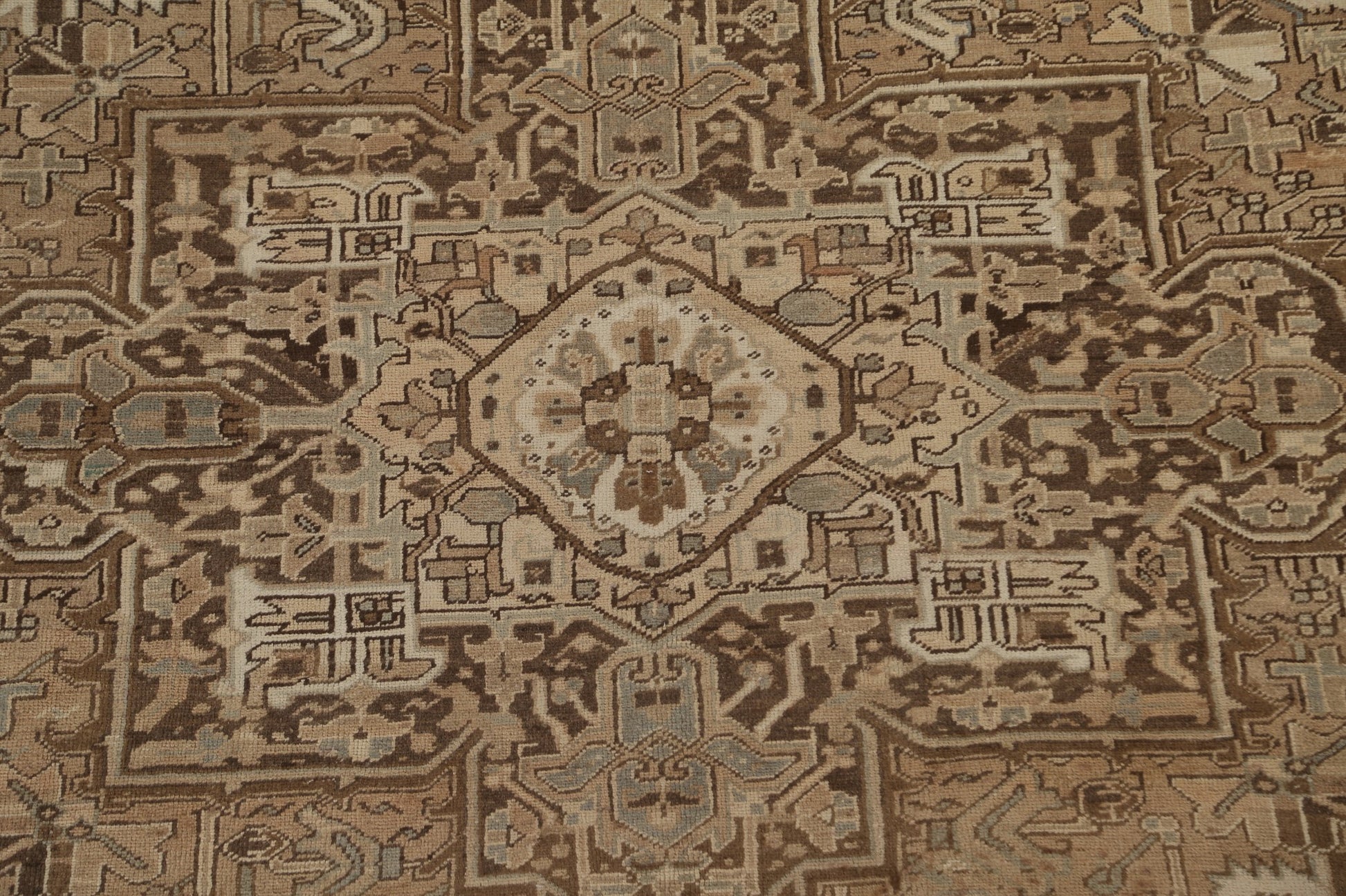 A Beautiful Genuine Persia ( Persia ) Heriz rug is Hand Knotted by skillful weavers in Persia ( Persia ) with 100% Wool Material. This rug is in Very Good (Low Pile-Abrash) condition. dimensions are 11' 2'' X 9' 1'' in foot and 340 X 277 in centimeter. the primary color is Beige & Ivories.