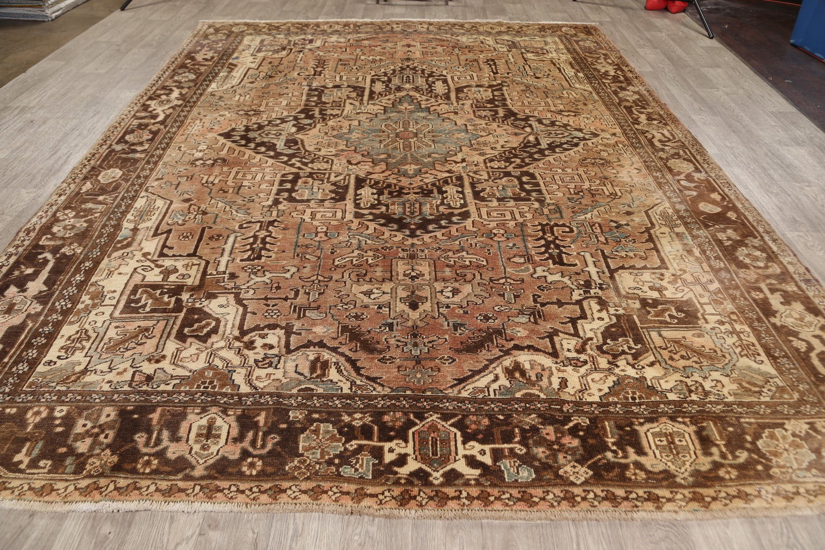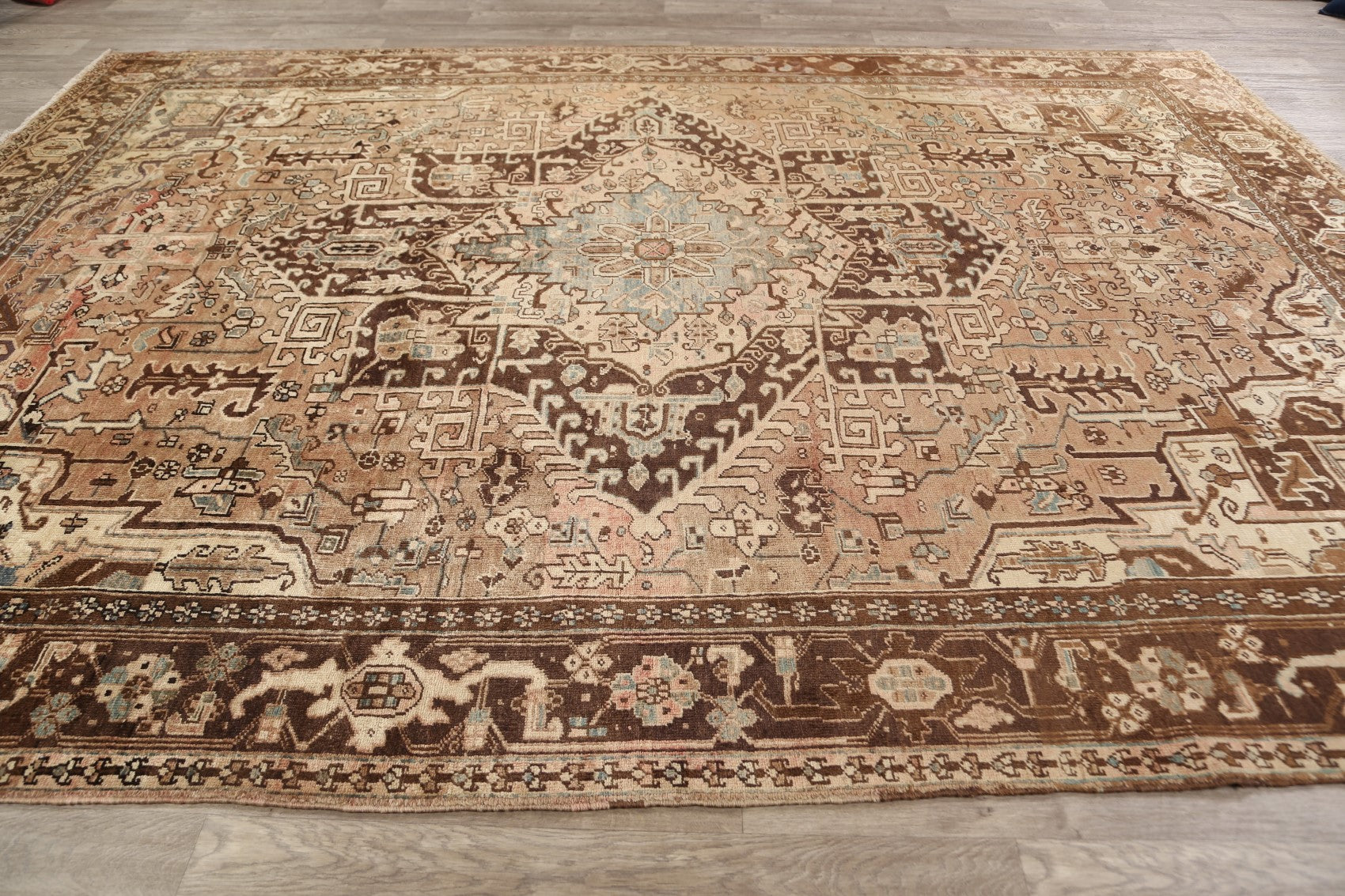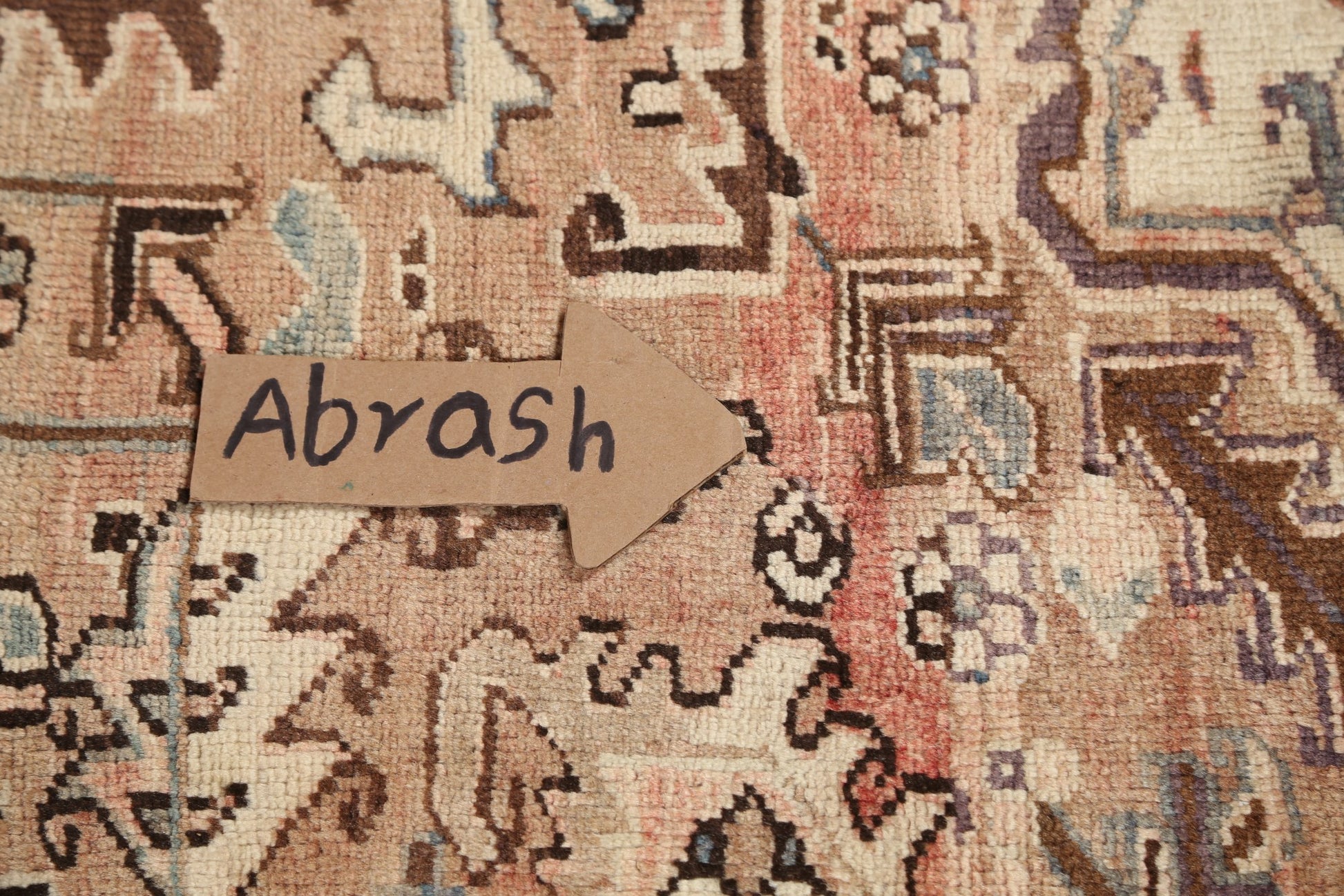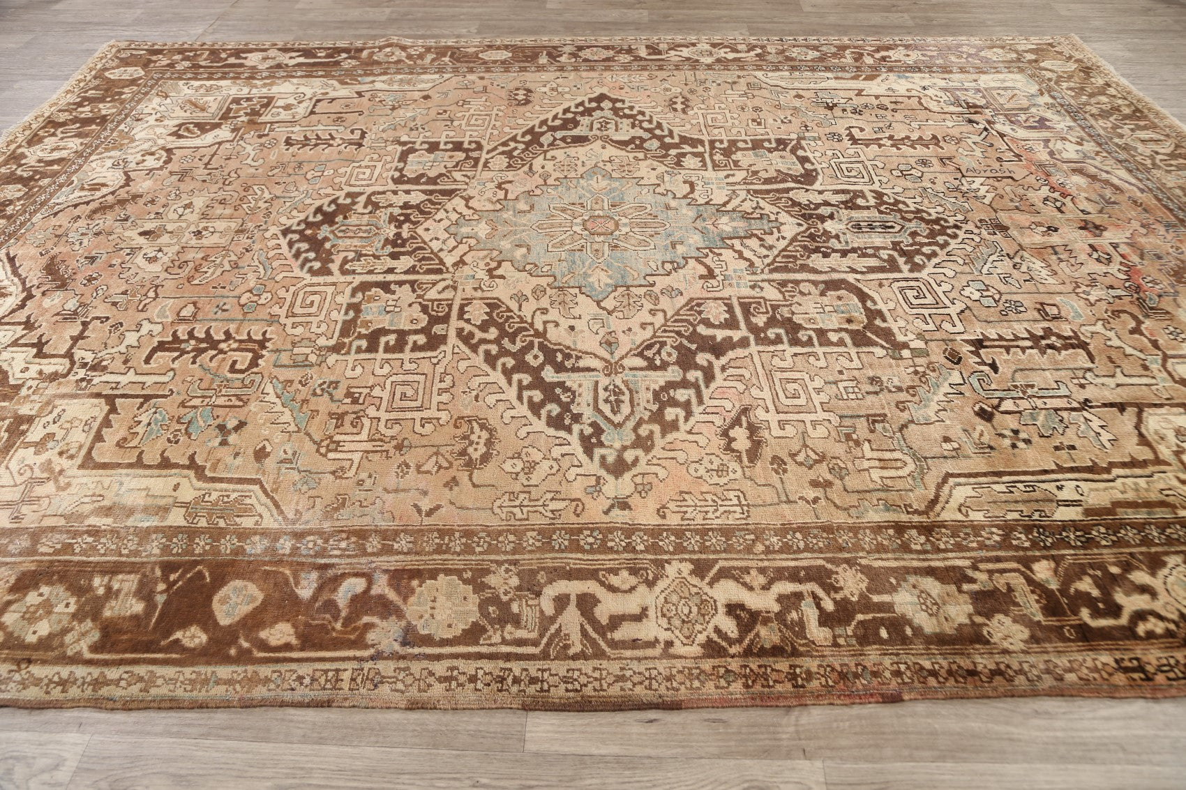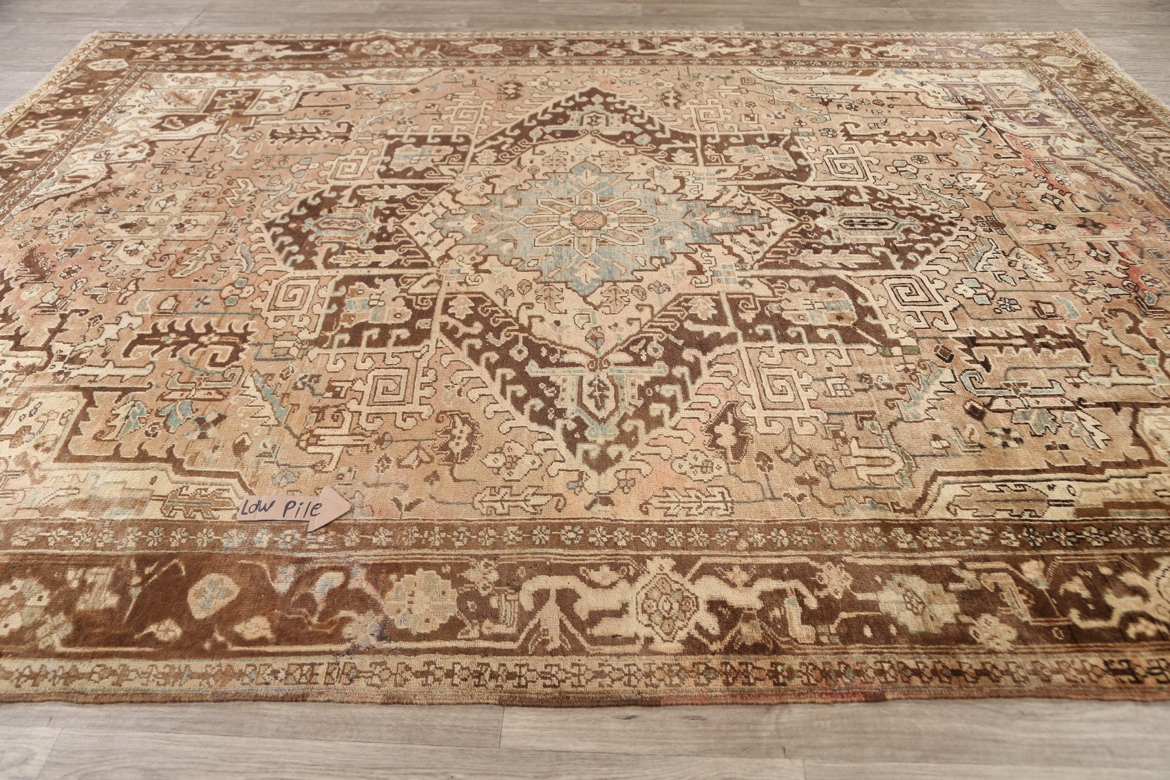 A Beautiful Genuine Persia ( Persia ) Heriz rug is Hand Knotted by skillful weavers in Persia ( Persia ) with 100% Wool Material. This rug is in Very Good (Low Pile-Abrash-Small Repair) condition. dimensions are 11' 7'' X 8' 7'' in foot and 353 X 262 in centimeter. the primary color is Beige & Ivories.