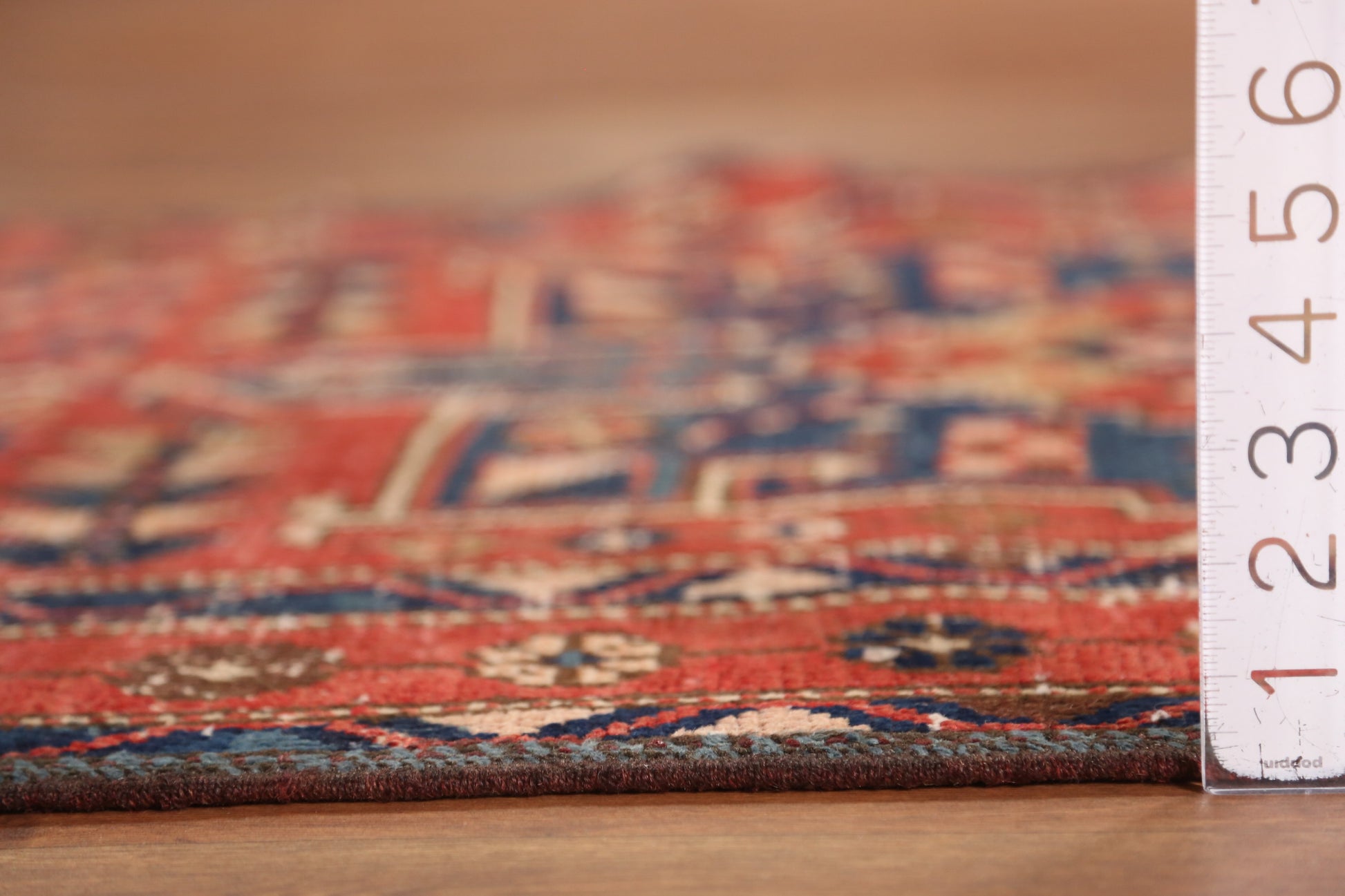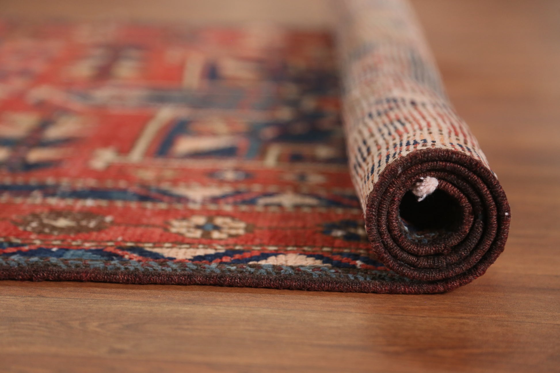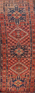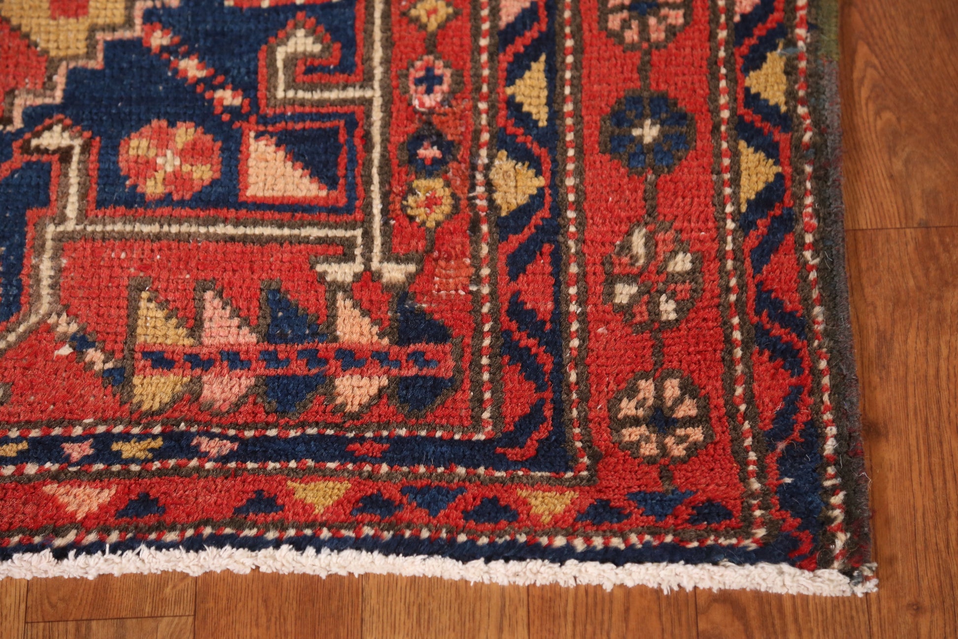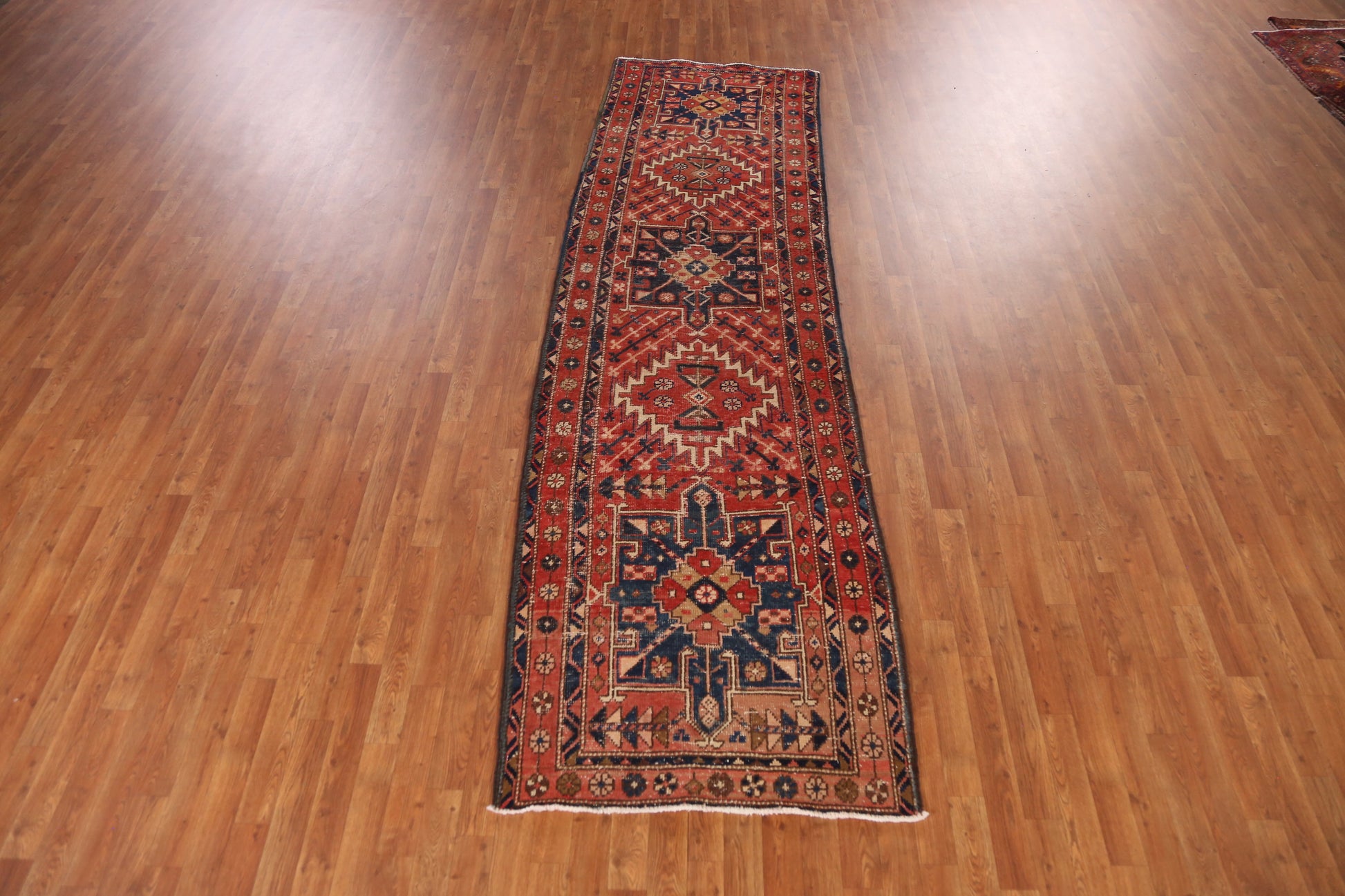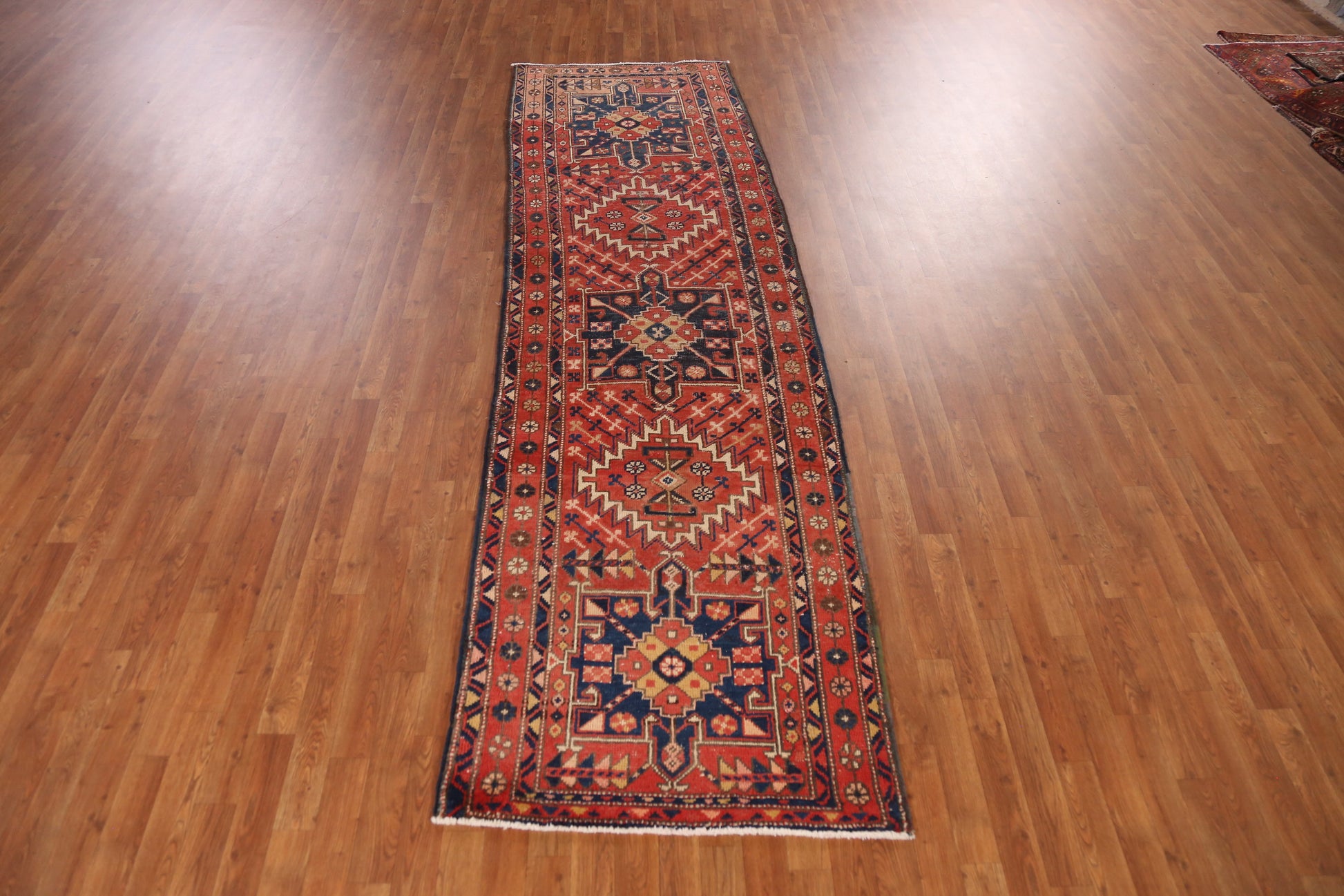 A Beautiful Genuine Persia ( Persia ) Heriz rug is Hand Knotted by skillful weavers in Persia ( Persia ) with 100% Wool Material. This rug is in Good (Evenly Low Pile) condition. dimensions are 11' 0'' X 3' 2'' in foot and 335 X 97 in centimeter. the primary color is Oranges & Rust.