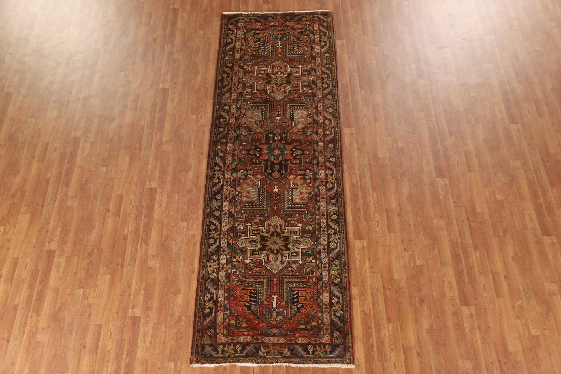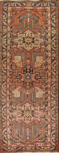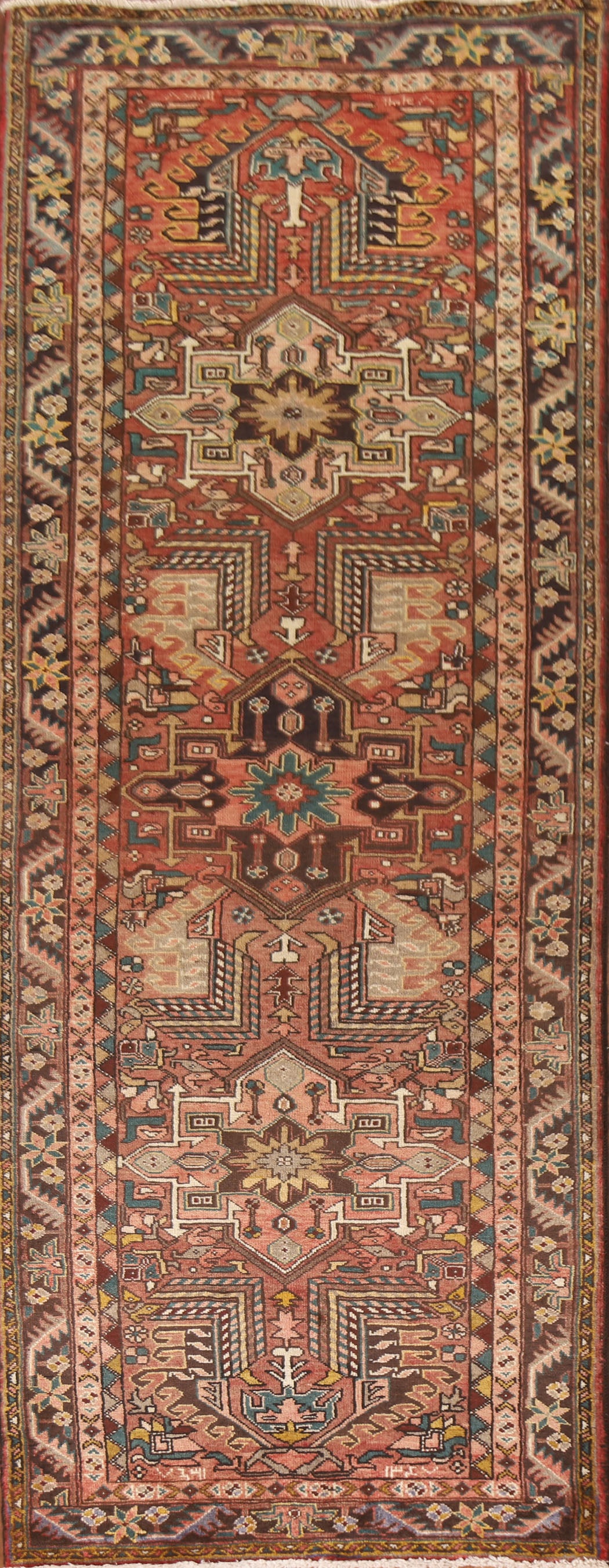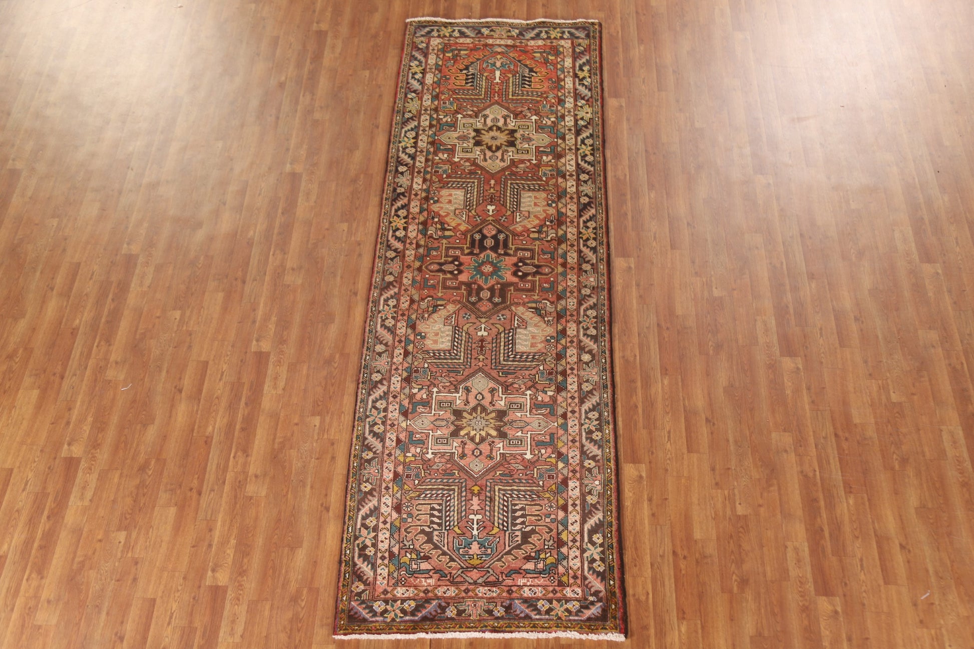 A Beautiful Genuine Persia ( Persia ) Heriz rug is Hand Knotted by skillful weavers in Persia ( Persia ) with 100% Wool Material. This rug is in Very Good condition. dimensions are 10' 7'' X 3' 5'' in foot and 323 X 104 in centimeter. the primary color is Oranges & Rust.
