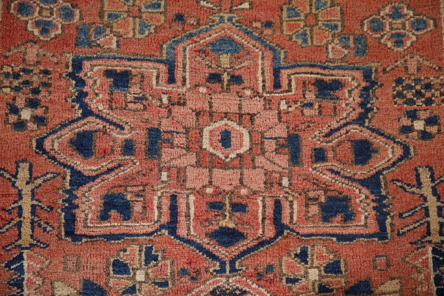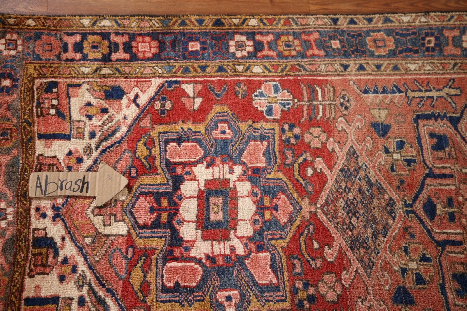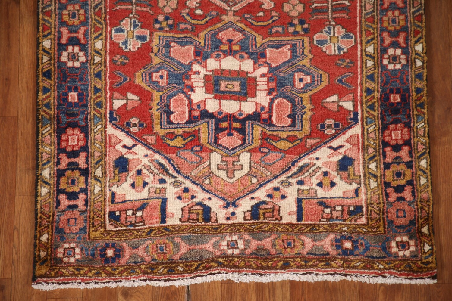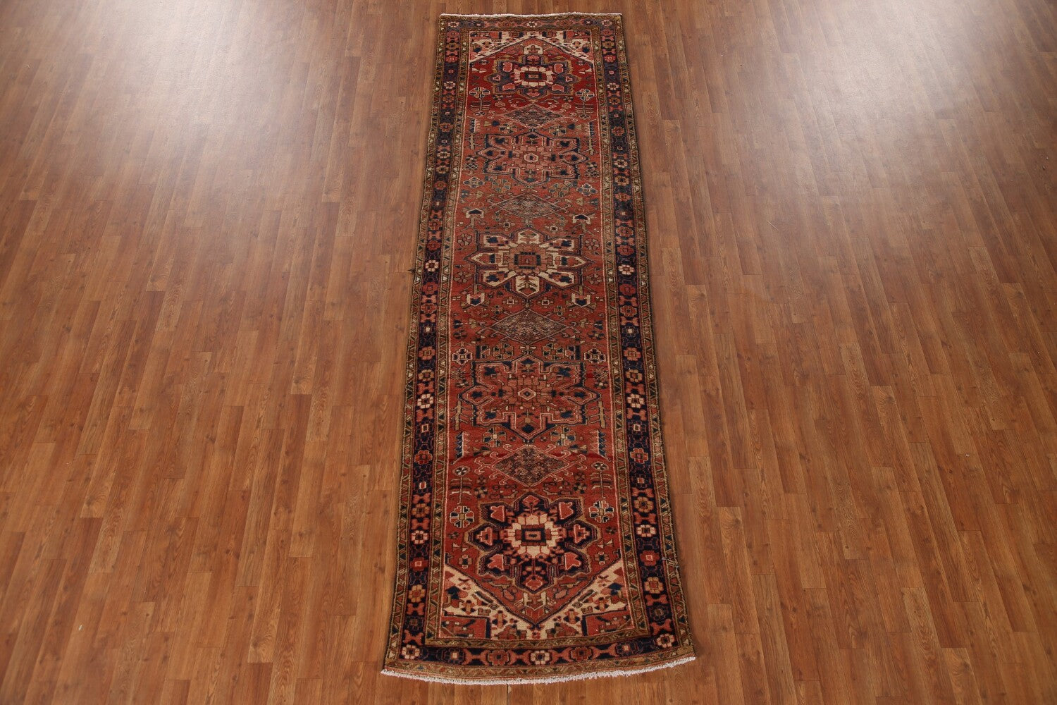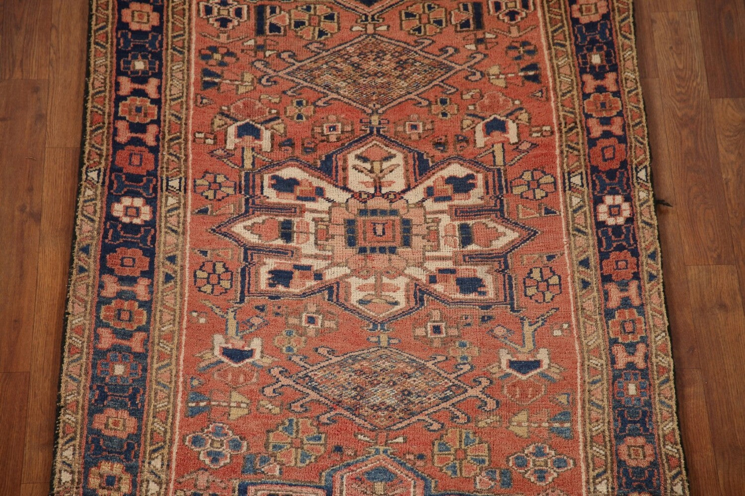 A Beautiful Genuine Persia ( Persia ) Heriz rug is Hand Knotted by skillful weavers in Persia ( Persia ) with 100% Wool Material. This rug is in Very Good (Low Pile-Abrash-Repair) condition. dimensions are 11' 2'' X 3' 3'' in foot and 340 X 99 in centimeter. the primary color is Coral.