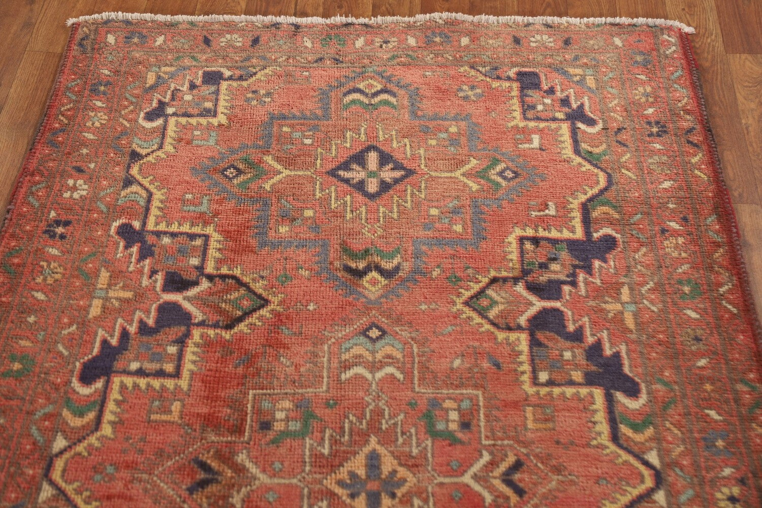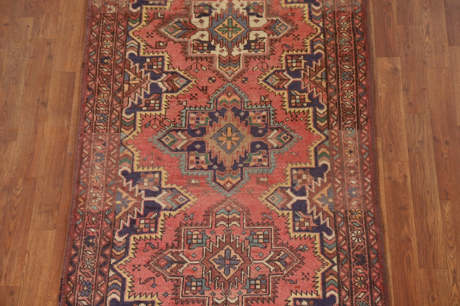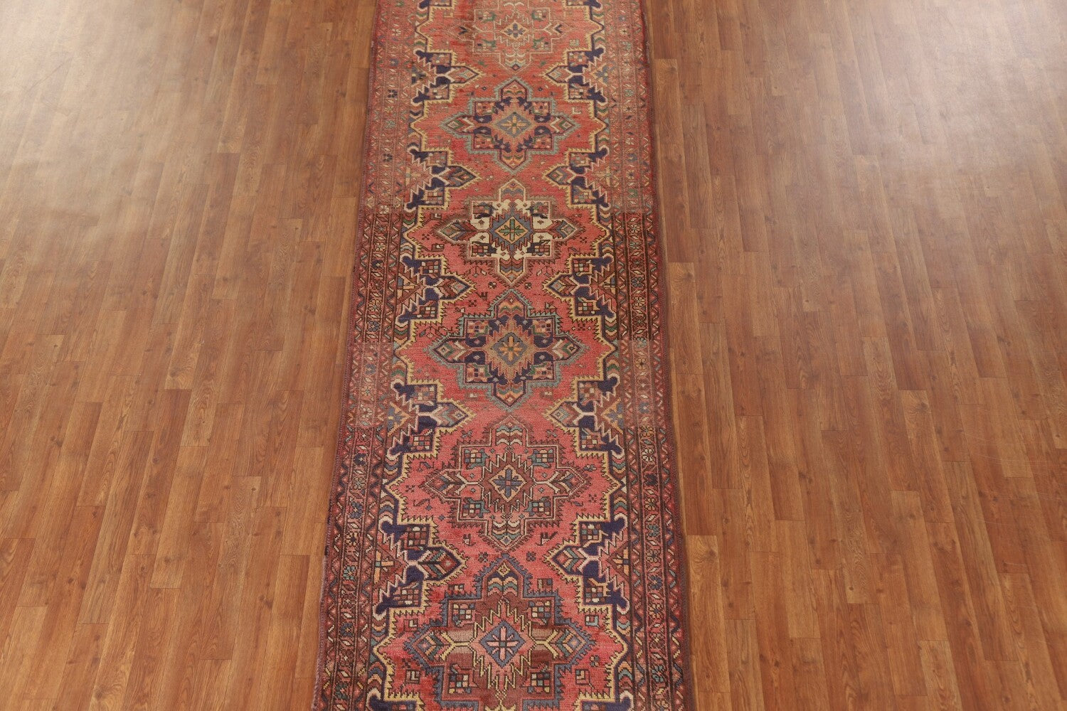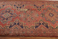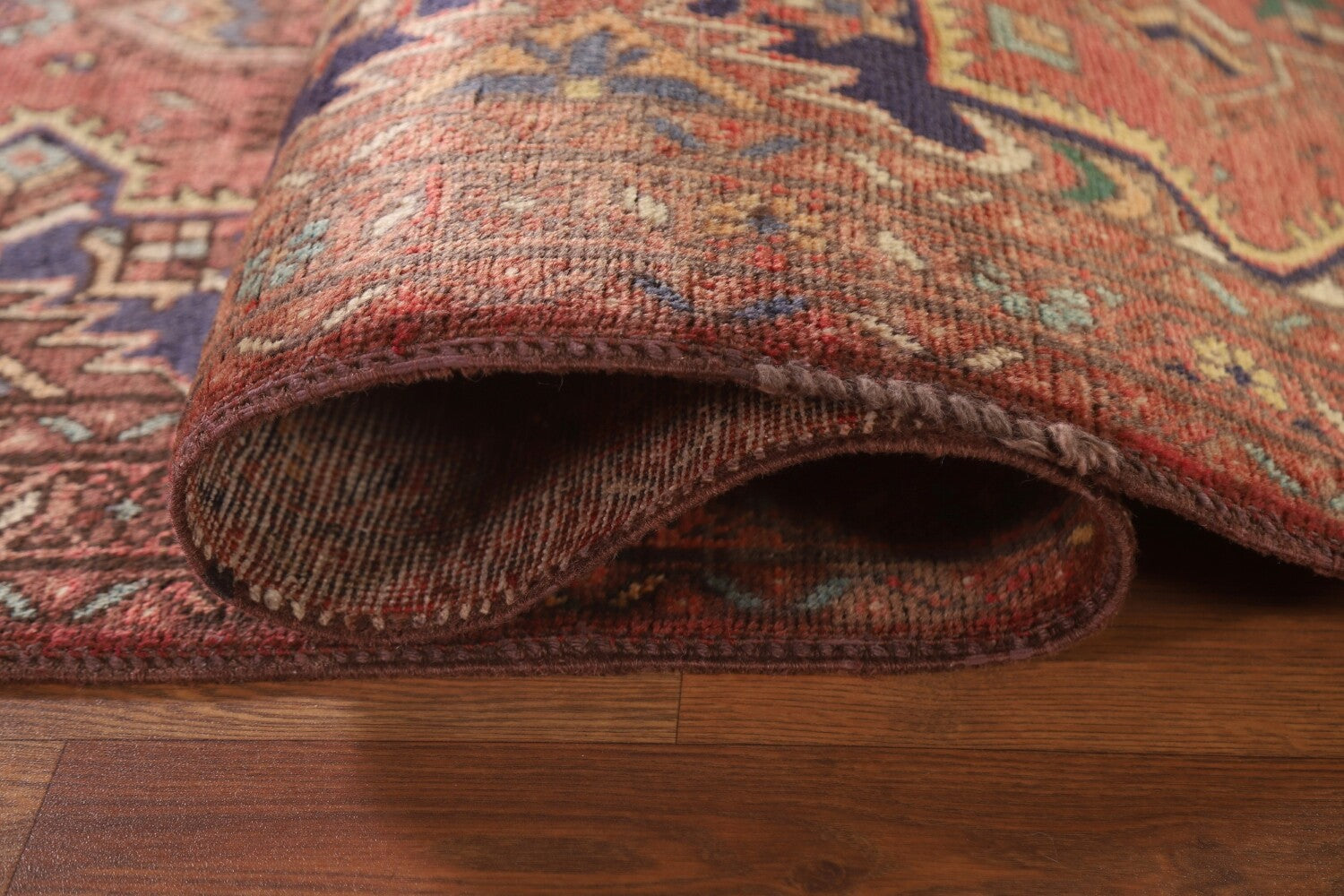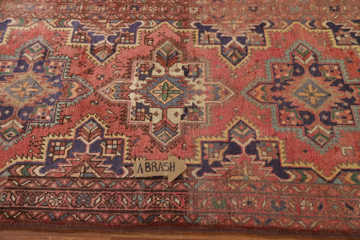 A Beautiful Genuine Persia ( Persia ) Heriz rug is Hand Knotted by skillful weavers in Persia ( Persia ) with 100% Wool Material. This rug is in Very Good (Low Pile-Abrash) condition. dimensions are 12' 7'' X 3' 3'' in foot and 384 X 99 in centimeter. the primary color is Pink.
