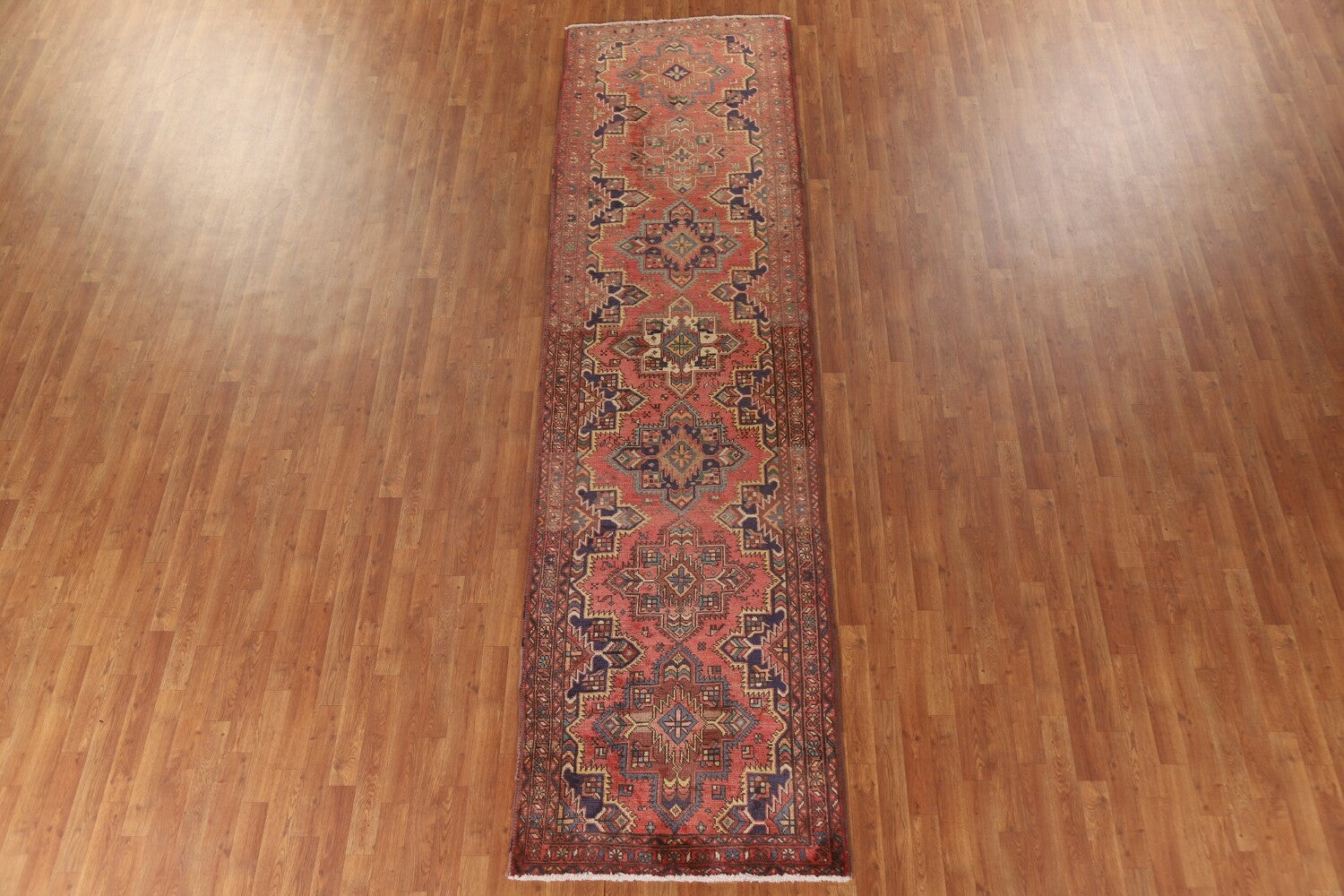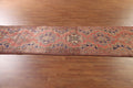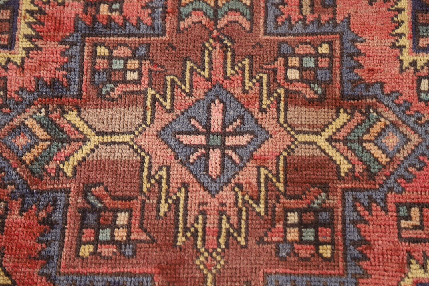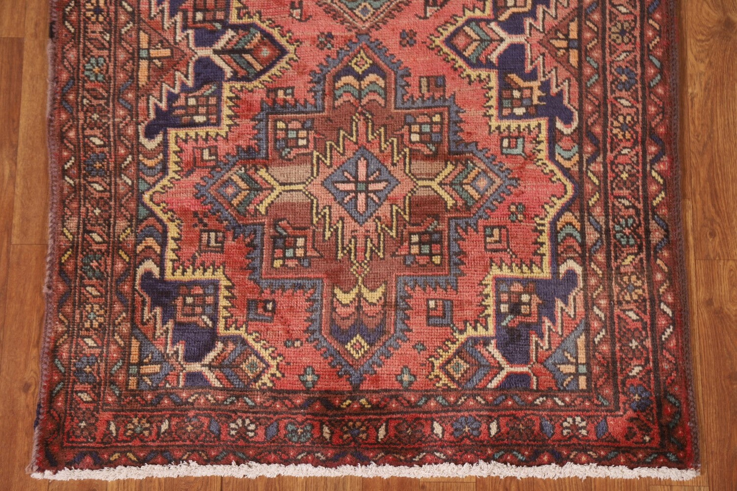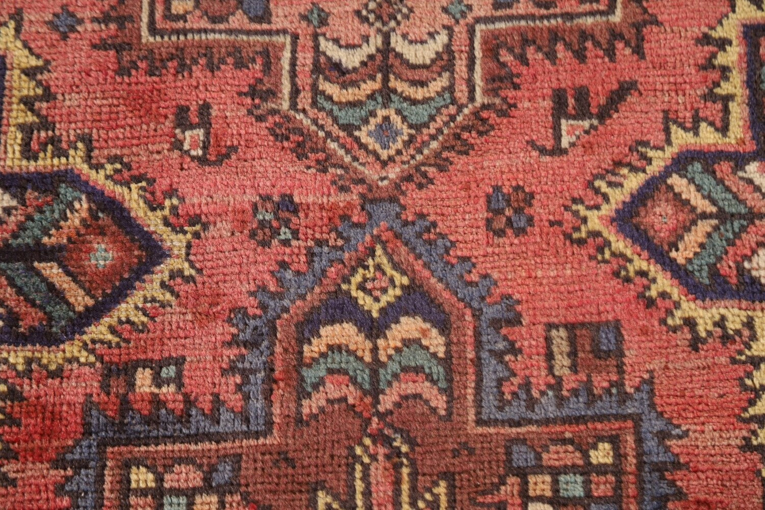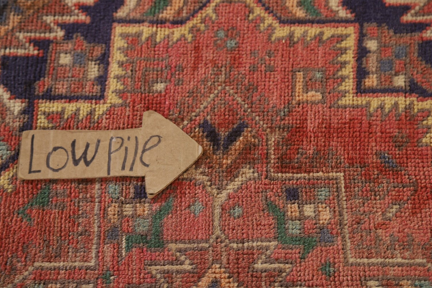 A Beautiful Genuine Persia ( Persia ) Heriz rug is Hand Knotted by skillful weavers in Persia ( Persia ) with 100% Wool Material. This rug is in Very Good (Low Pile-Abrash) condition. dimensions are 12' 7'' X 3' 3'' in foot and 384 X 99 in centimeter. the primary color is Pink.