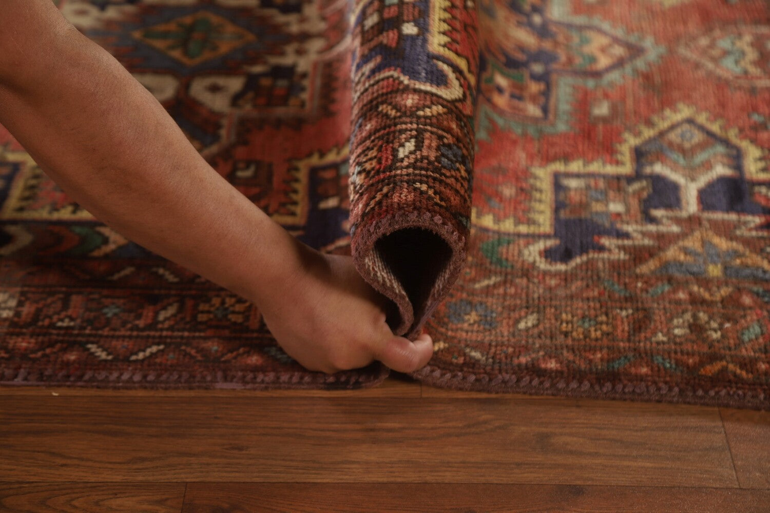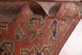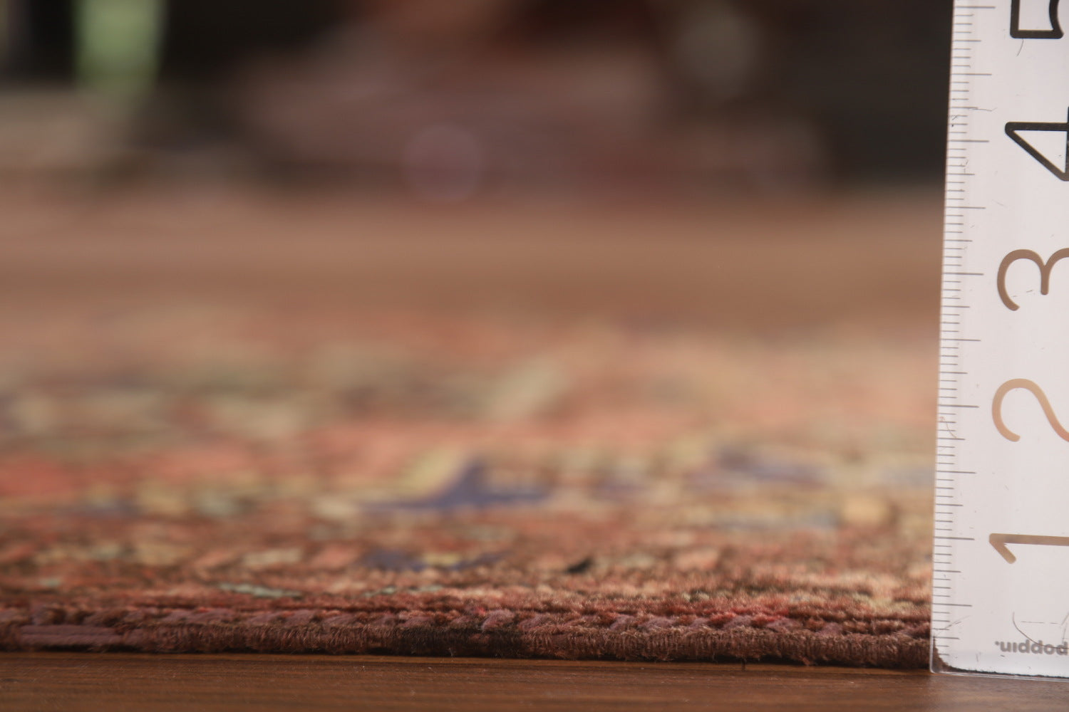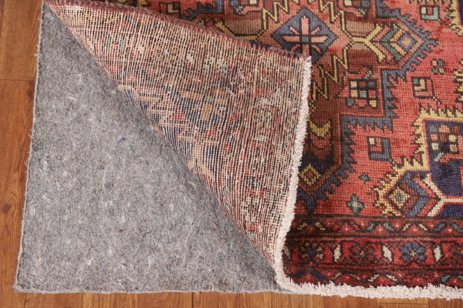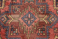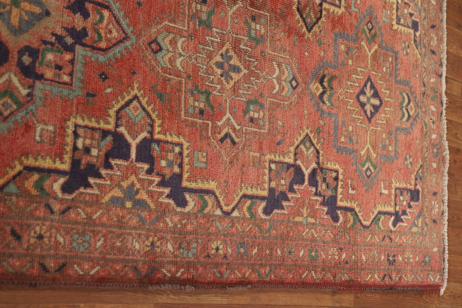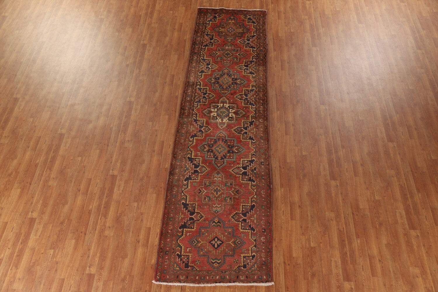 A Beautiful Genuine Persia ( Persia ) Heriz rug is Hand Knotted by skillful weavers in Persia ( Persia ) with 100% Wool Material. This rug is in Very Good (Low Pile-Abrash) condition. dimensions are 12' 7'' X 3' 3'' in foot and 384 X 99 in centimeter. the primary color is Pink.
