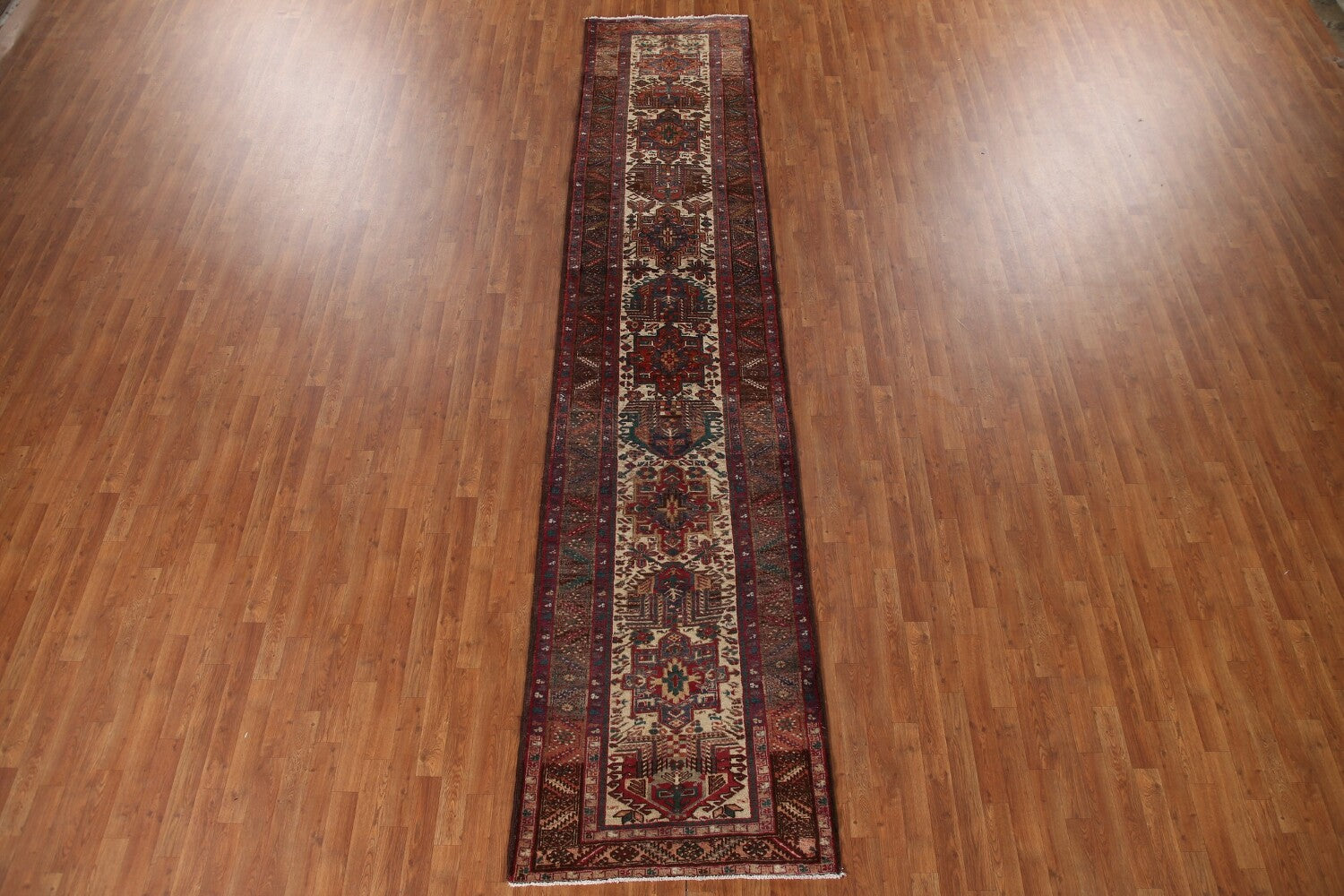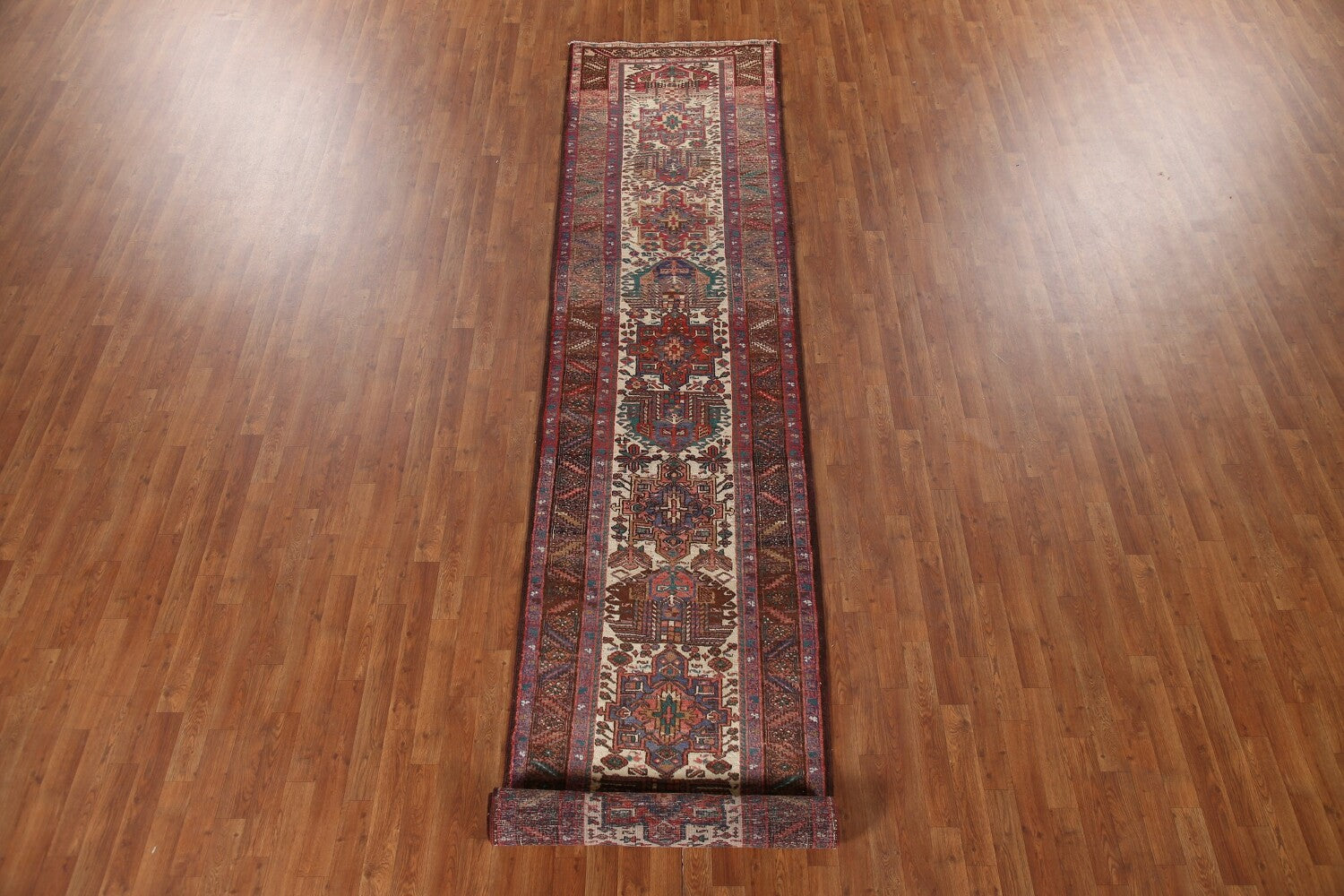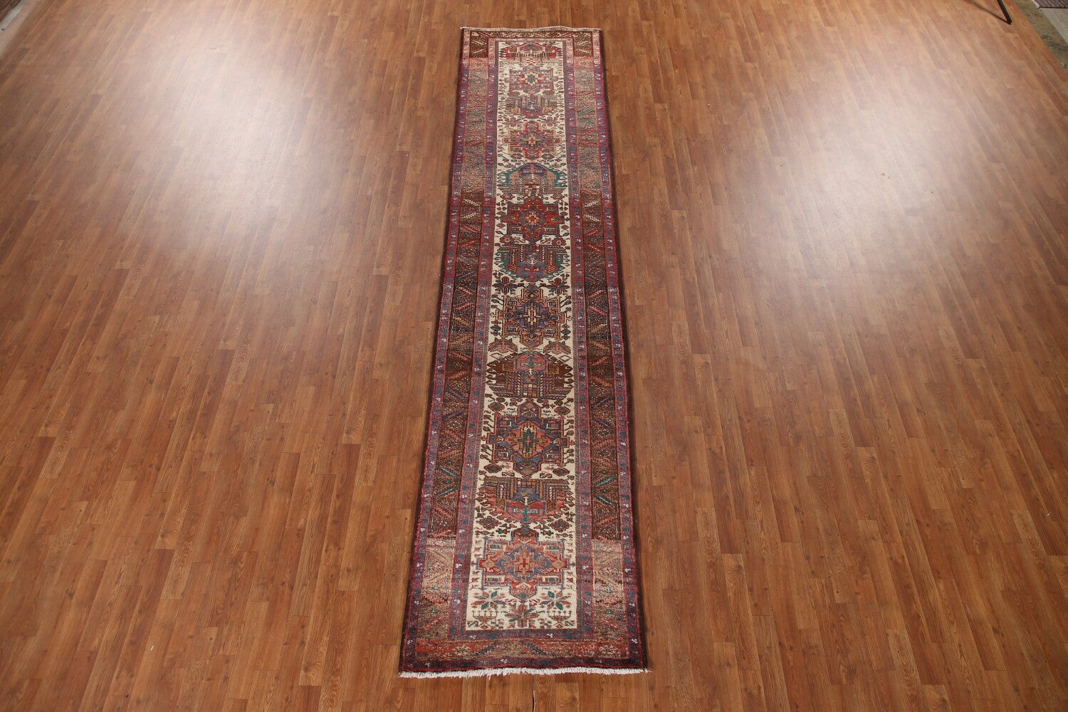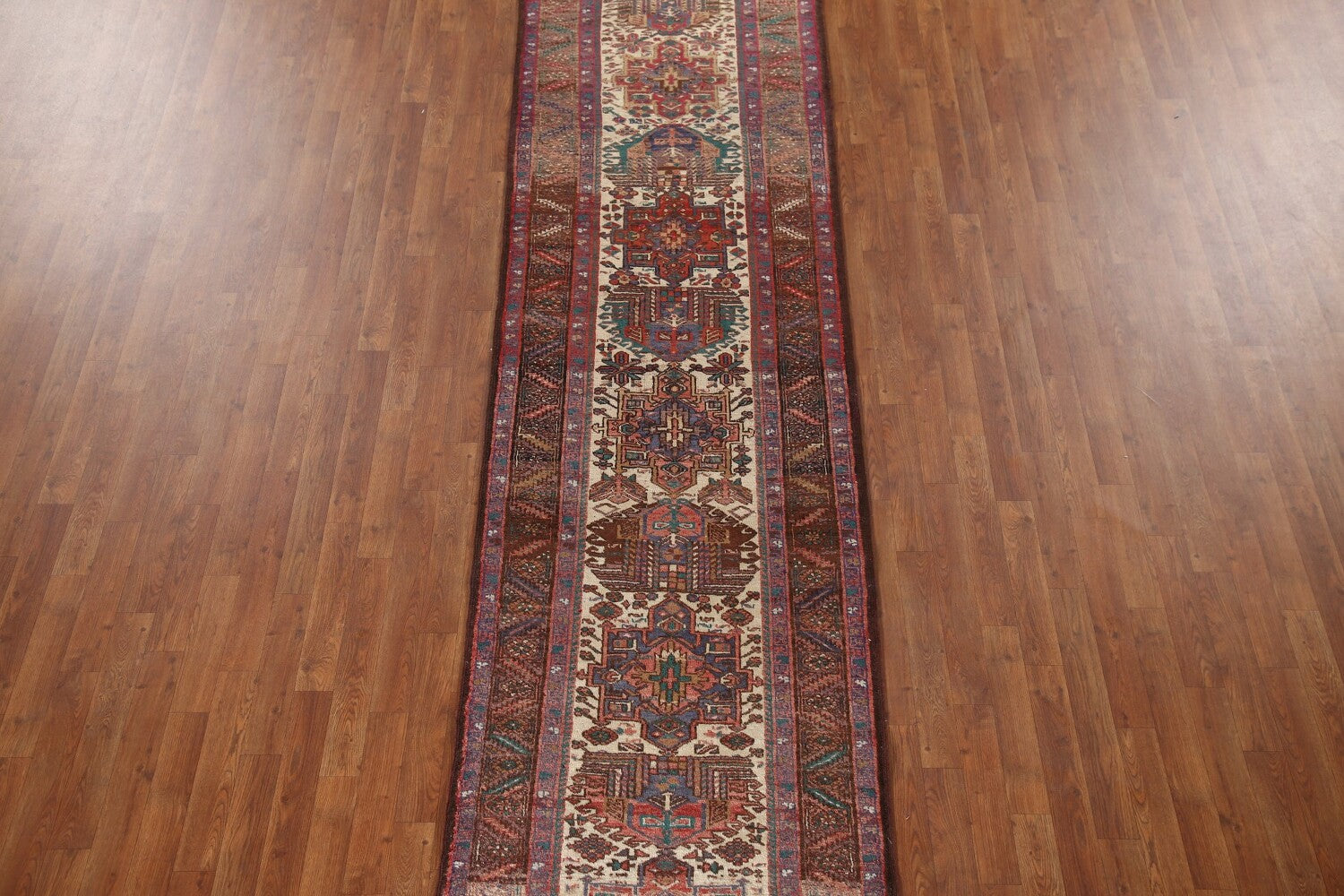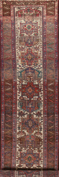 A Beautiful Genuine Persia ( Persia ) Heriz rug is Hand Knotted by skillful weavers in Persia ( Persia ) with 100% Wool Material. This rug is in Very Good (Low Pile-Abrash) condition. dimensions are 14' 0'' X 3' 1'' in foot and 427 X 94 in centimeter. the primary color is Beige & Ivories.