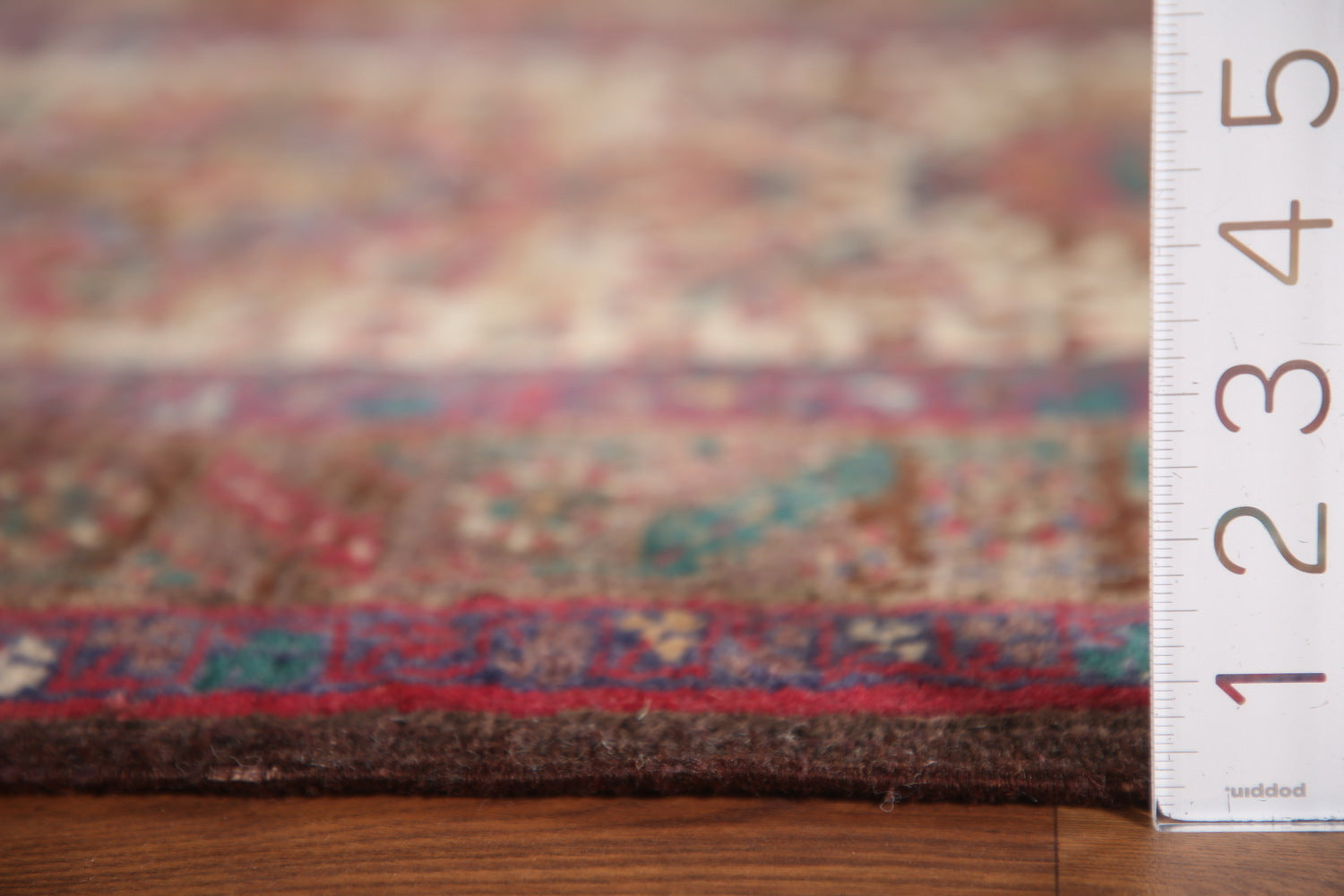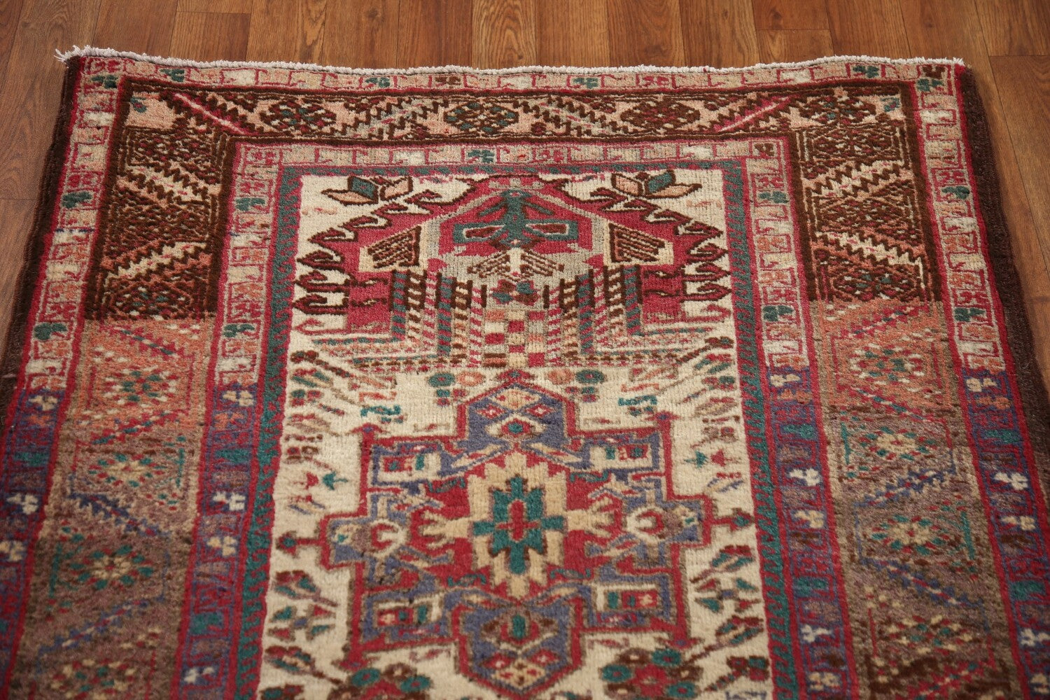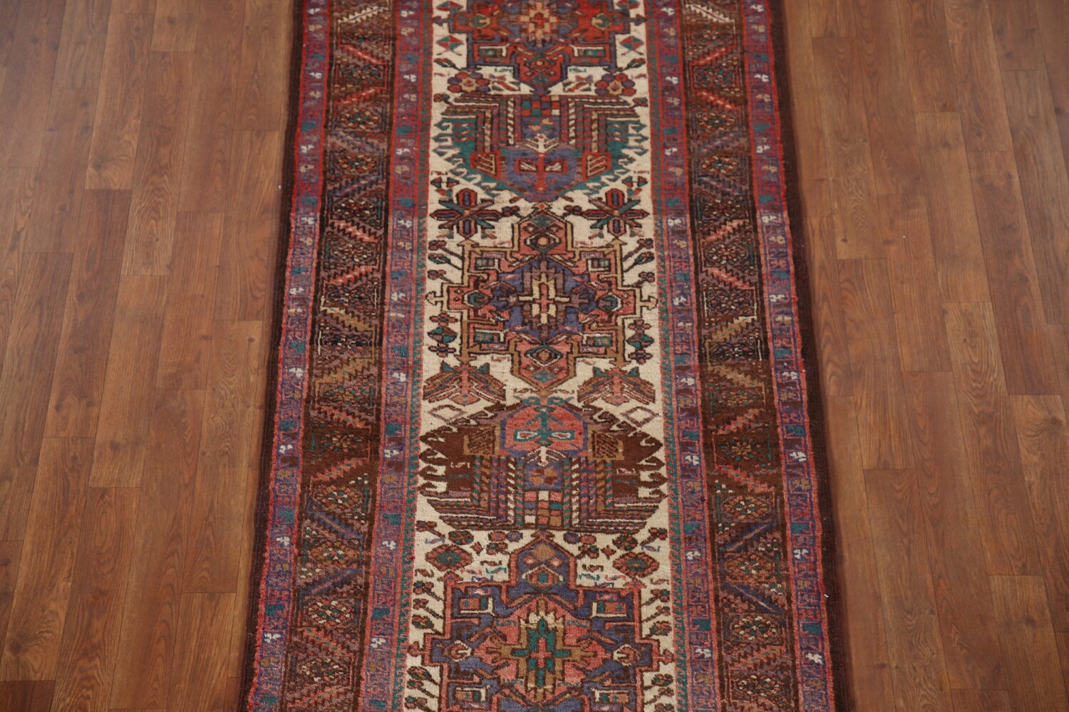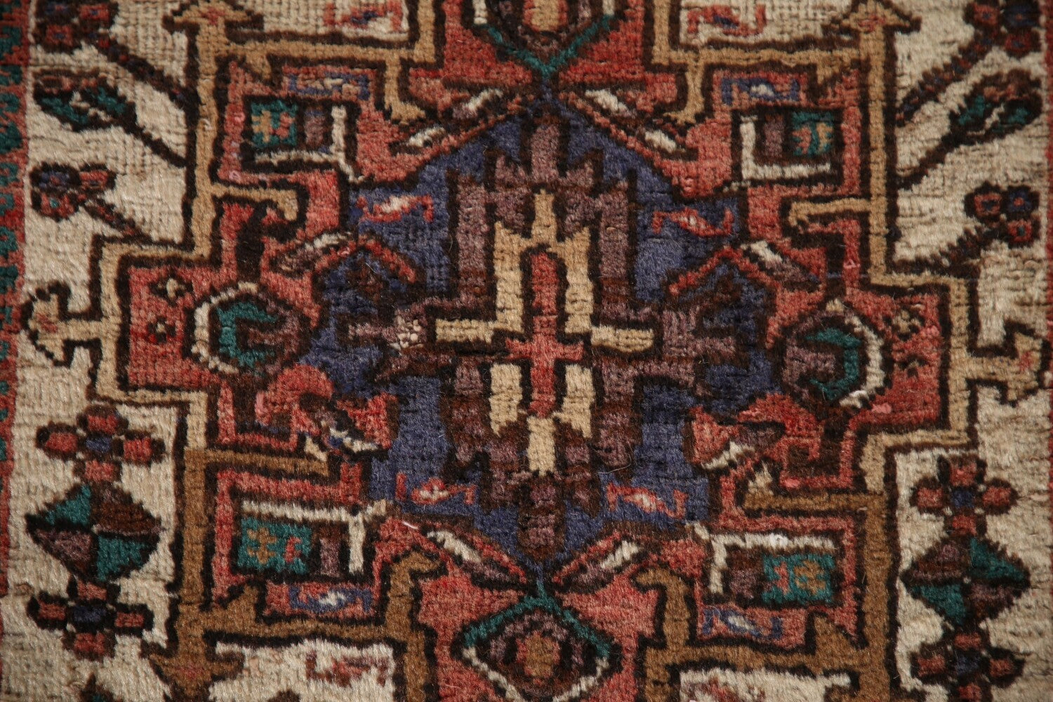 A Beautiful Genuine Persia ( Persia ) Heriz rug is Hand Knotted by skillful weavers in Persia ( Persia ) with 100% Wool Material. This rug is in Very Good (Low Pile-Abrash) condition. dimensions are 14' 0'' X 3' 1'' in foot and 427 X 94 in centimeter. the primary color is Beige & Ivories.
