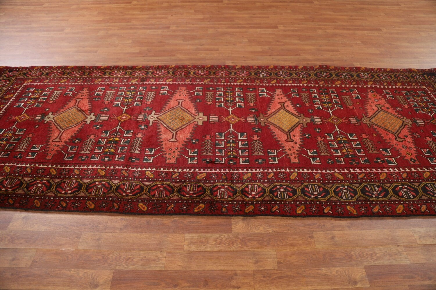 A Beautiful Genuine Persia ( Persia ) Heriz rug is Hand Knotted by skillful weavers in Persia ( Persia ) with 100% Wool Material. This rug is in Very Good condition. dimensions are 11' 3'' X 4' 2'' in foot and 343 X 127 in centimeter. the primary color is Red.