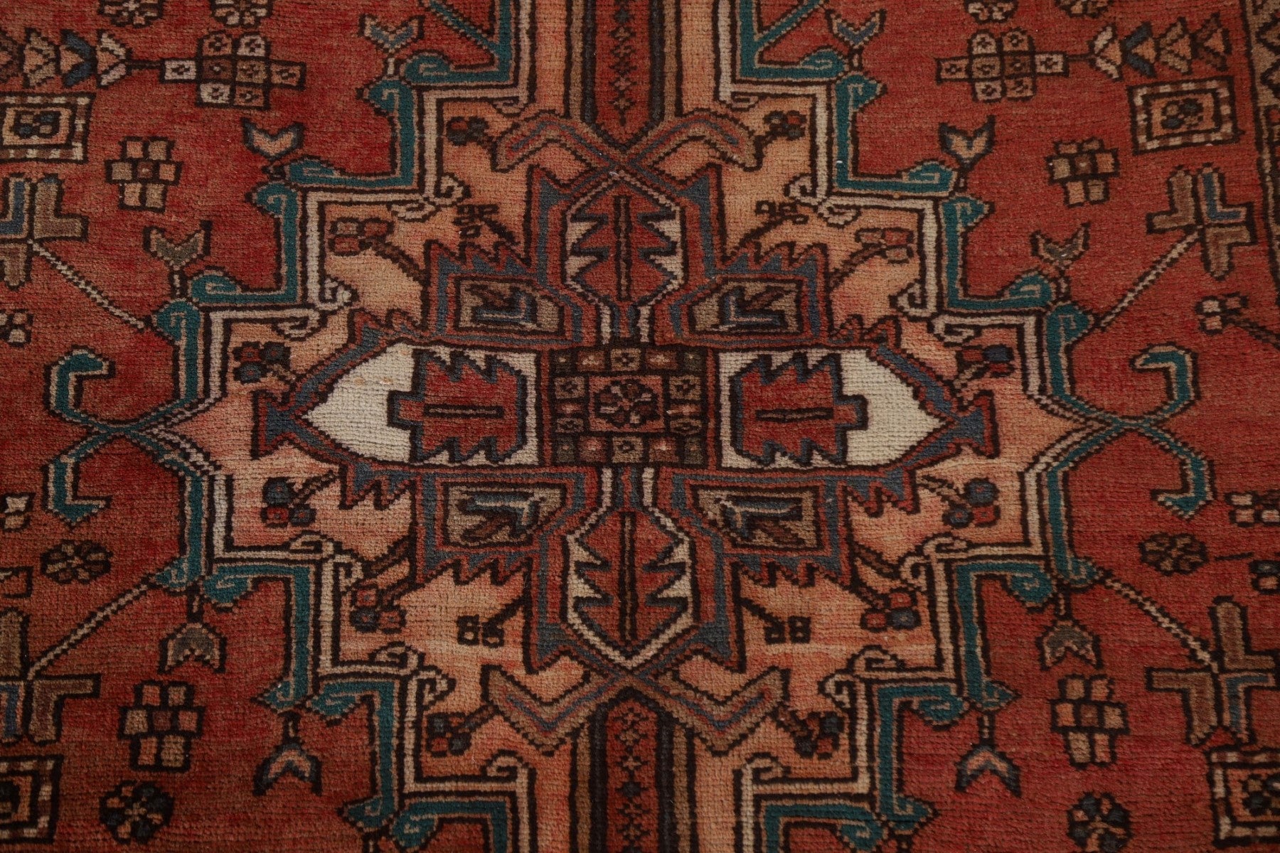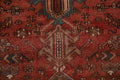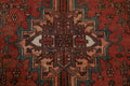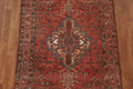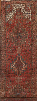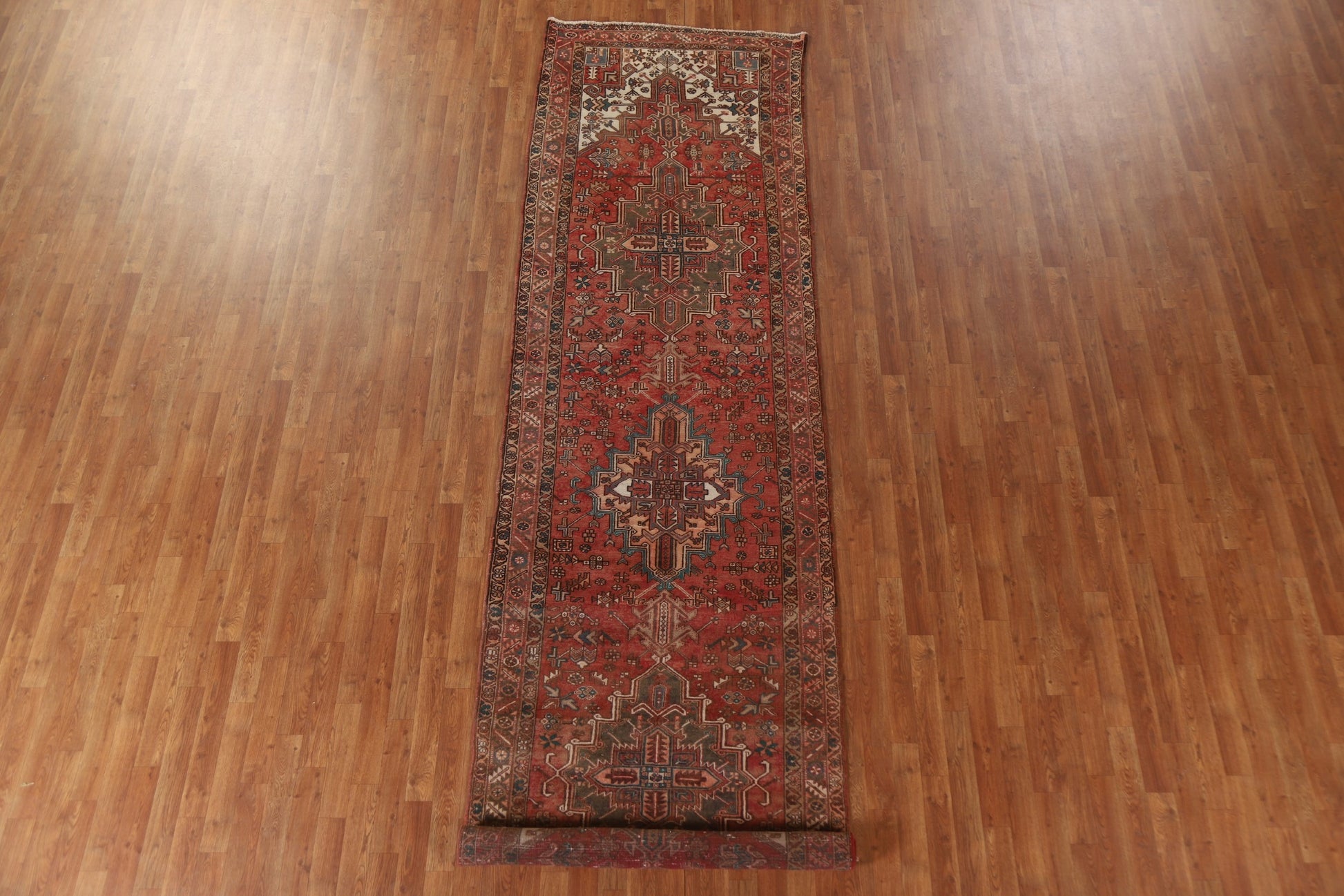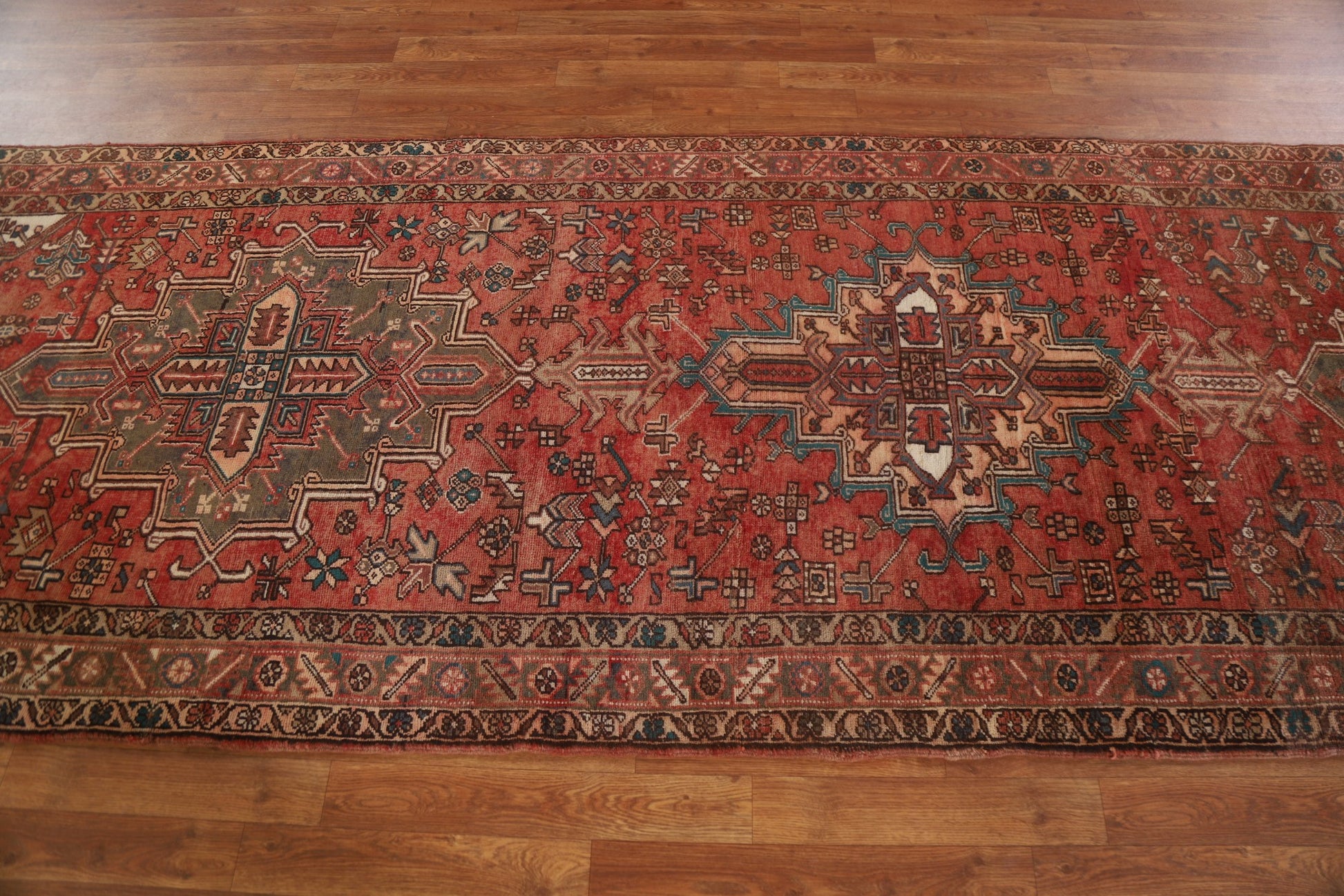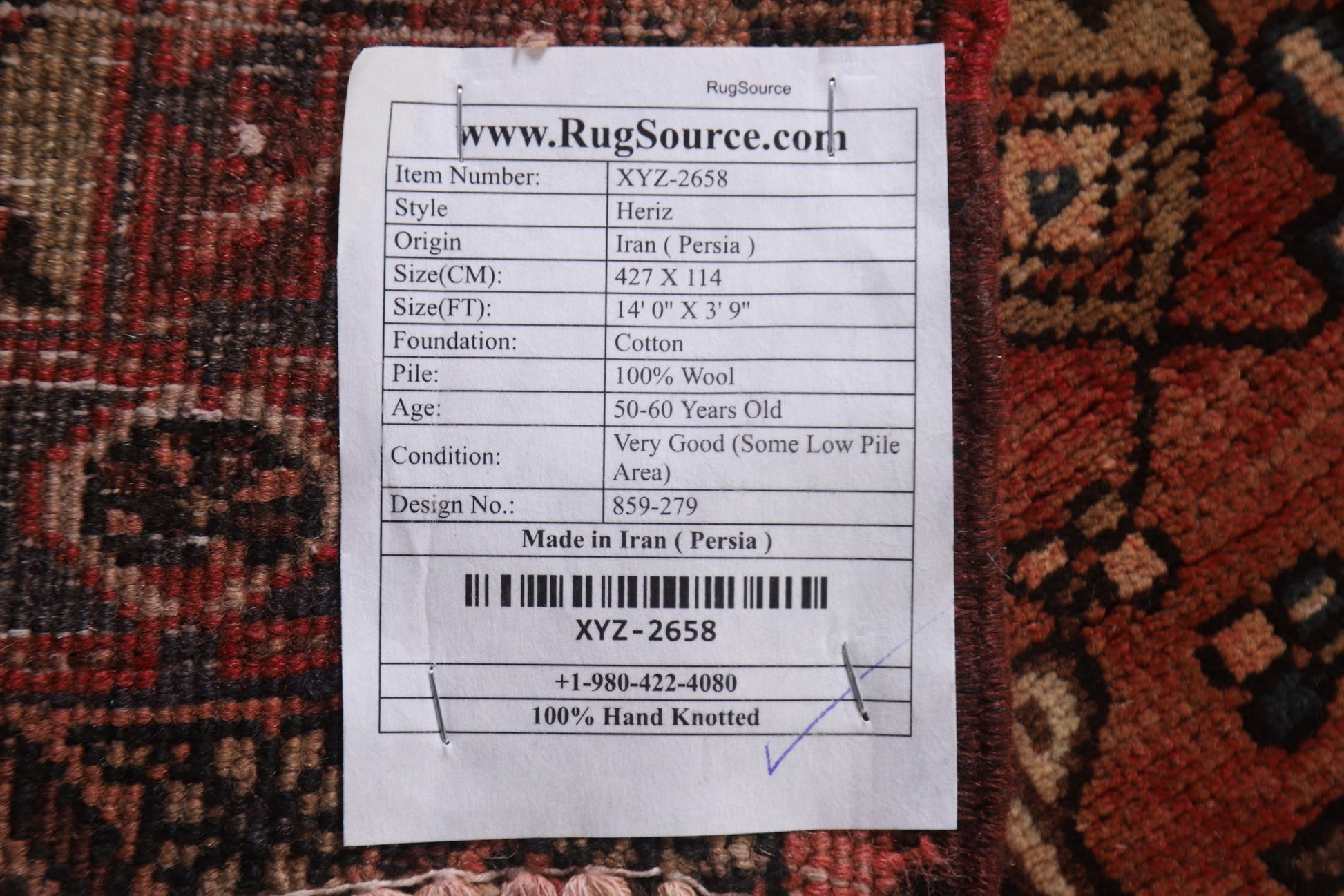 A Beautiful Genuine Persia ( Persia ) Heriz rug is Hand Knotted by skillful weavers in Persia ( Persia ) with 100% Wool Material. This rug is in Very Good (Some Low Pile Area) condition. dimensions are 14' 0'' X 3' 9'' in foot and 427 X 114 in centimeter. the primary color is Red.