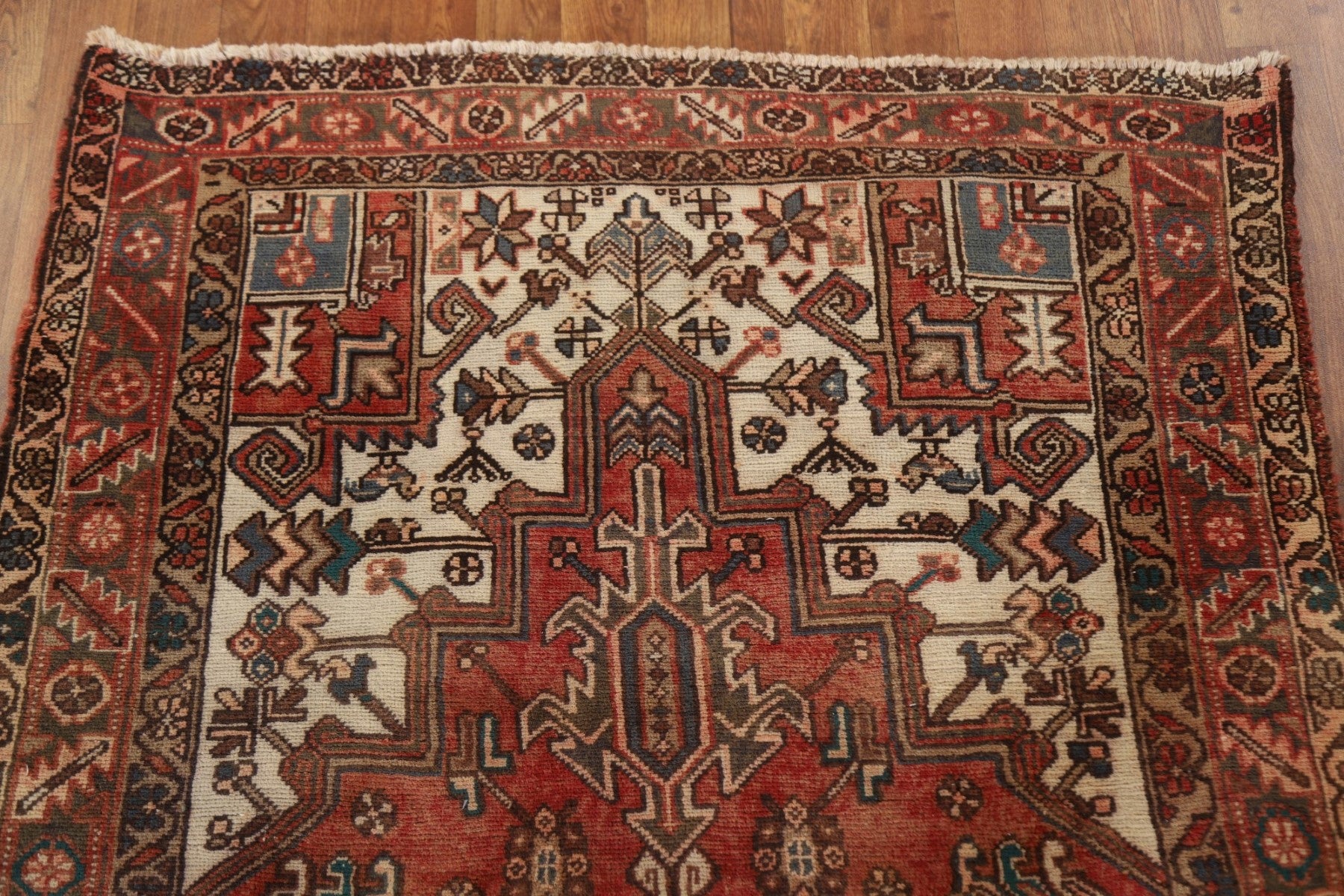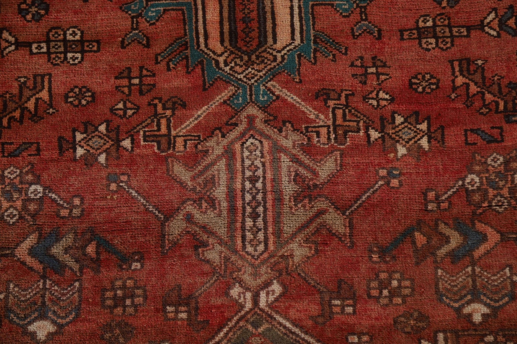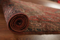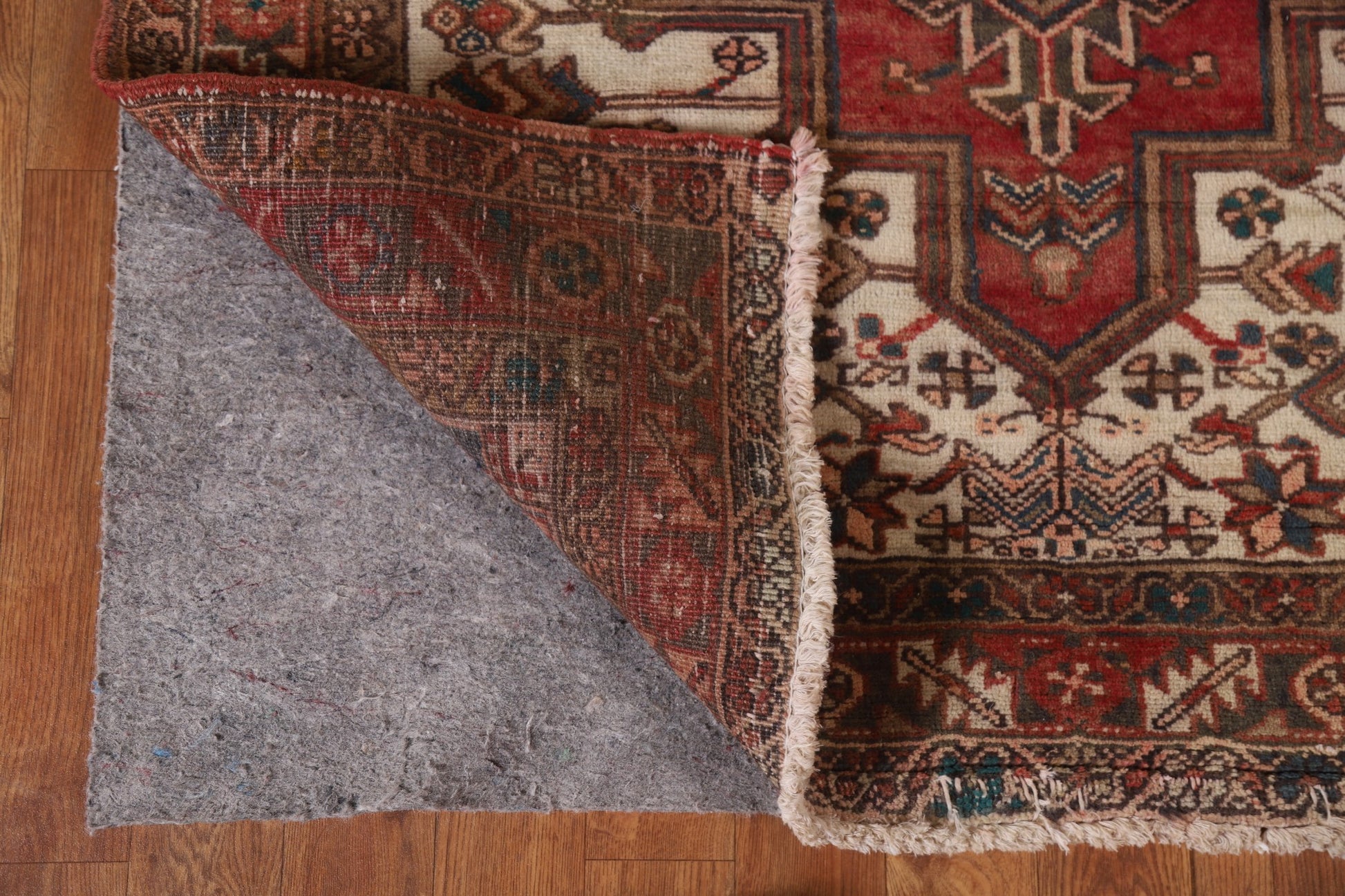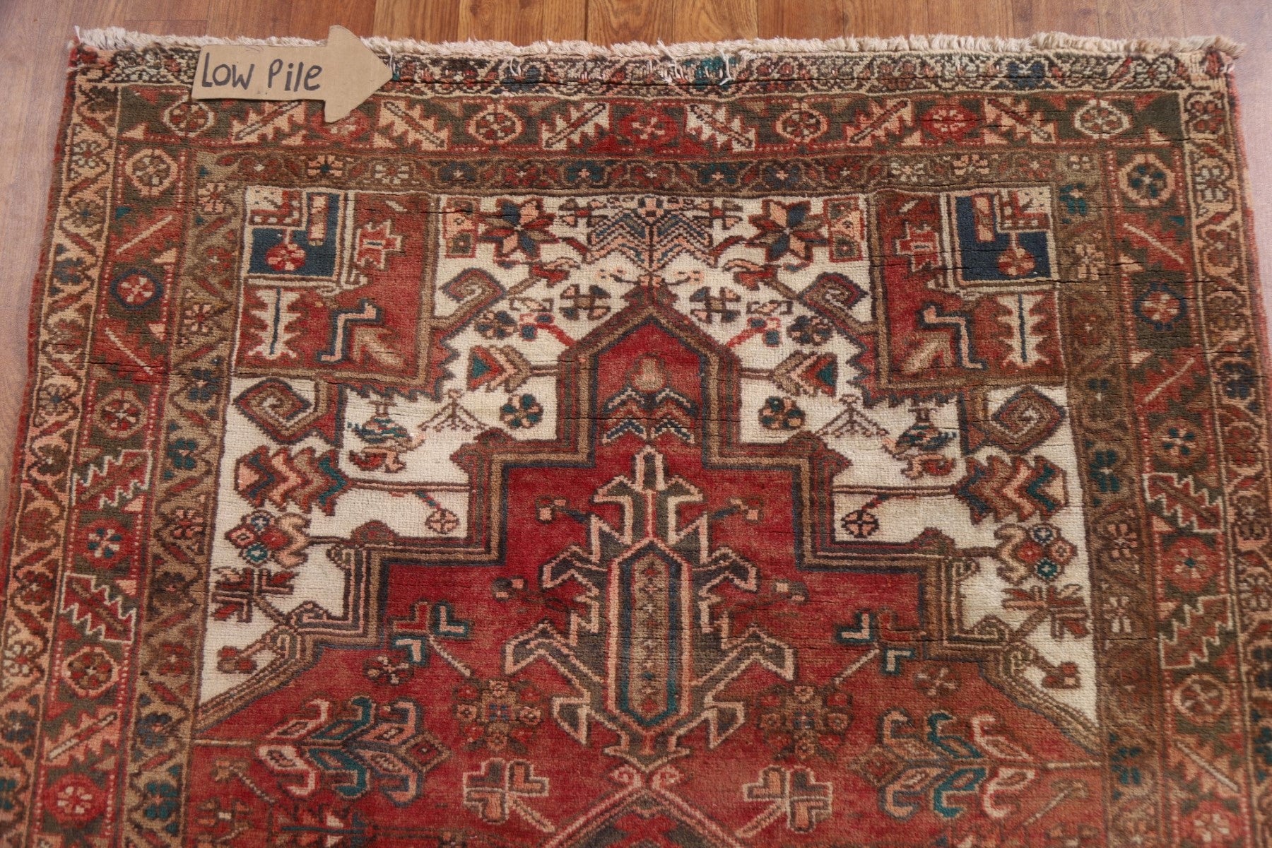 A Beautiful Genuine Persia ( Persia ) Heriz rug is Hand Knotted by skillful weavers in Persia ( Persia ) with 100% Wool Material. This rug is in Very Good (Some Low Pile Area) condition. dimensions are 14' 0'' X 3' 9'' in foot and 427 X 114 in centimeter. the primary color is Red.