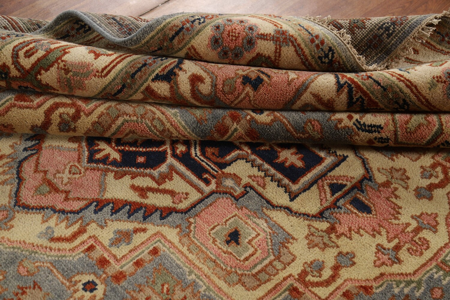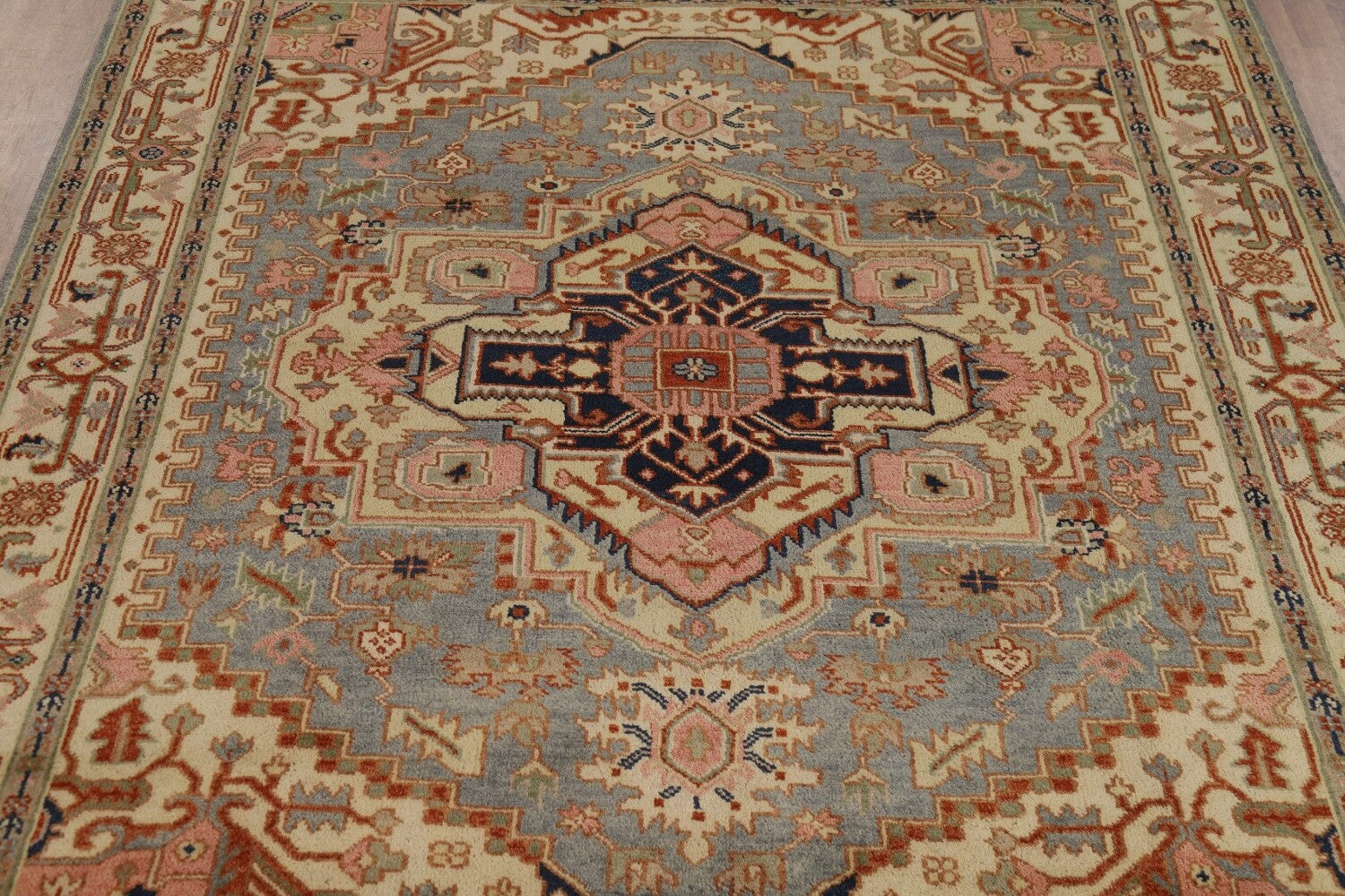 A Beautiful Genuine India Heriz (serapi) rug is Hand Knotted by skillful weavers in India with 100% Wool Material. This rug is in New, First Quality condition. dimensions are 9' 10'' X 7' 11'' in foot and 300 X 241 in centimeter. the primary color is Greys & Charcoal.
