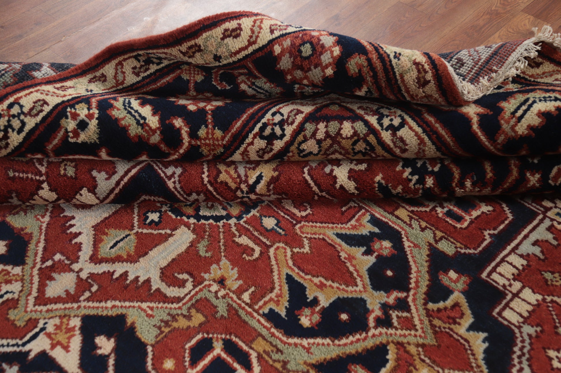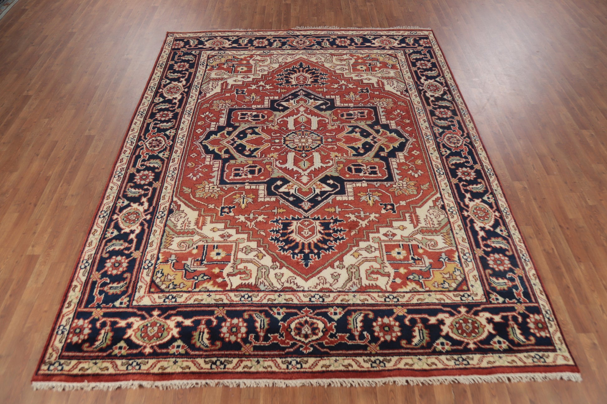 A Beautiful Genuine India Heriz (serapi) rug is Hand Knotted by skillful weavers in India with 100% Wool Material. This rug is in New, First Quality condition. dimensions are 10' 1'' X 8' 0'' in foot and 307 X 244 in centimeter. the primary color is Oranges & Rust.
