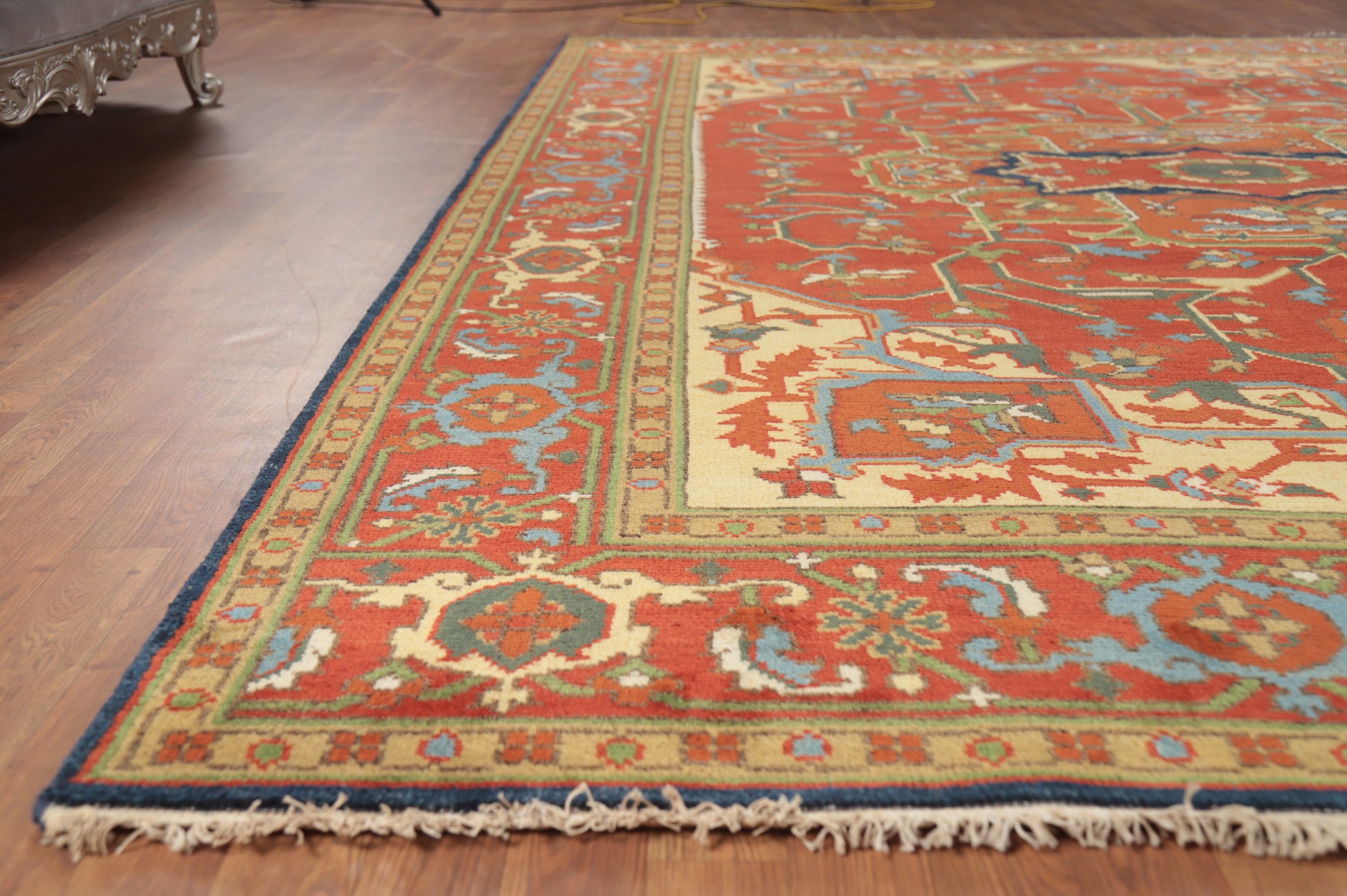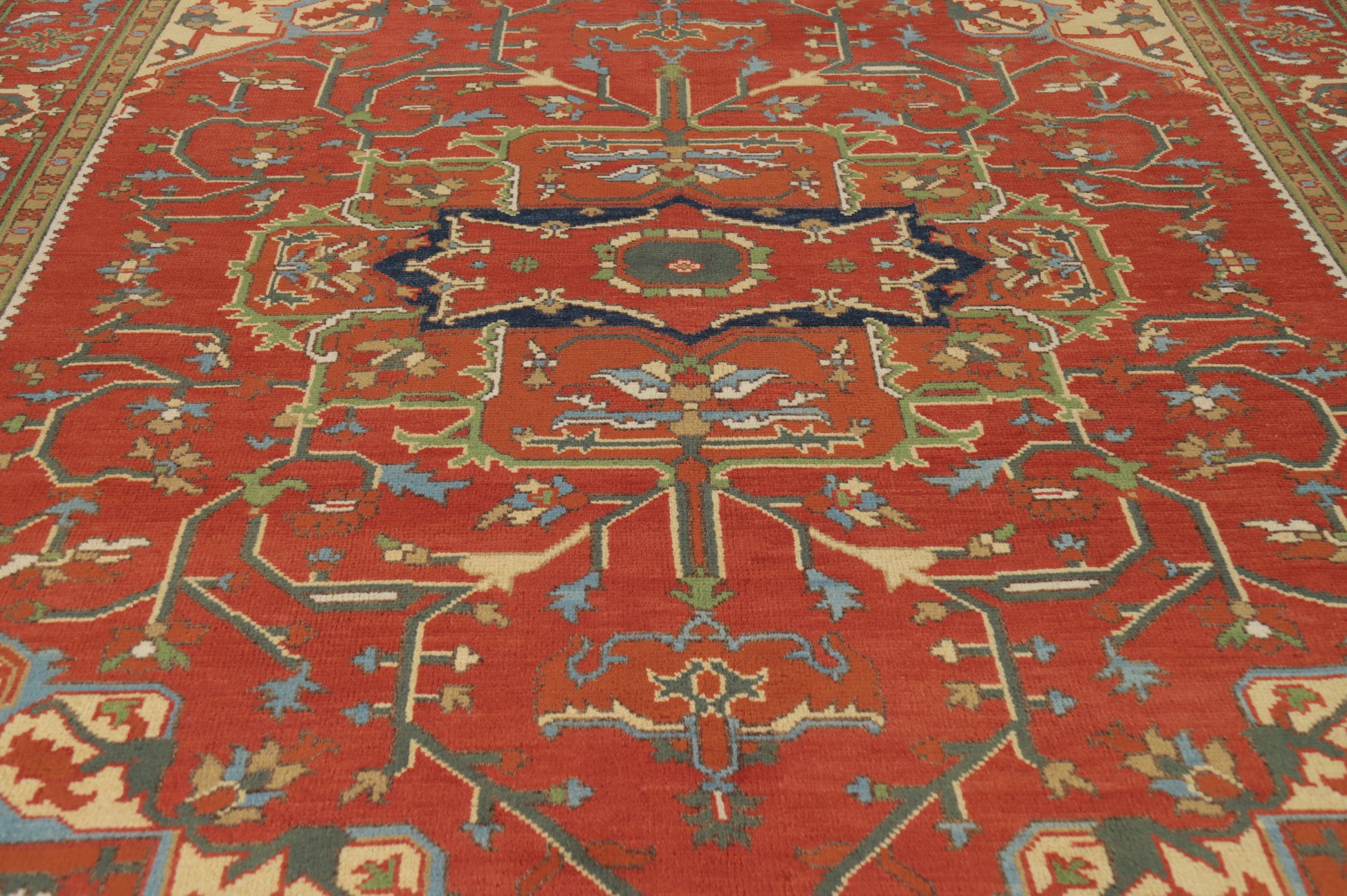 A Beautiful Genuine India Heriz (serapi) rug is Hand Knotted by skillful weavers in India with 100% Wool Material. This rug is in New, First Quality condition. dimensions are 11' 9'' X 8' 10'' in foot and  358 X 269 in centimeter. the primary color is Oranges & Rust.